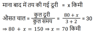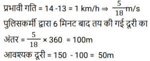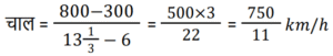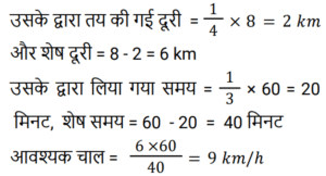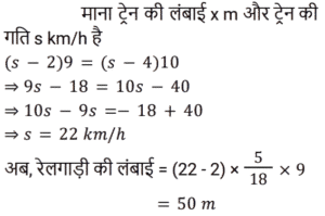समय , चाल और दूरीTotal Questions: 501. एक आदमी तीन घंटे में 80 किमी की यात्रा करता है। वह आगे और दो घंटे की यात्रा करता है। यदि पूरी यात्रा के लिए उसकी औसत गति 30 किमी/घंटा है, तो बाद के दो घंटों में तय की गई दूरी ज्ञात कीजिए। [Group D 17/08/2022 (Evening)](a) 70 किमी (b) 150 किमी(c) 120 किमी (d) 90 किमीCorrect Answer: (a) 70 किमी Solution:2. 800 km की यात्रा के लिए, एक ट्रक पहले 300 km की दूरी 50 km/h की चाल से तय करता है। उसे शेष दूरी को किस चाल से तय करना चाहिए, ताकि औसत चाल 60 km/h हो? [Group D 22/08/2022 (Morning)](a) 72 km/h(b) 600⁄13 km/h(c) 52 km/h(d) 750⁄11 km/hCorrect Answer: (d) 750⁄11 km/hSolution:3. एक व्यक्ति को 1 घंटे में 8 km की दूरी तय करनी है। यदि वह कुल समय के एक-तिहाई समय में एक-चौथाई दूरी तय करता है, तो शेष समय में शेष दूरी तय करने के लिए उसकी चाल (km/h में) कितनी होनी चाहिए, ताकि वह ठीक समय पर गंतव्य तक पहुँच सके? [Group D 23/08/2022 (Afternoon)](a) 6 (b) 7 (c) 8 (d) 9Correct Answer: (d) 9Solution:4. एक रेलगाड़ी उत्तर से दक्षिण दिशा की ओर चल रही है। यह समान दिशा में 2 km/h और 4 km/h की चाल से चल रहे राज और मधुर को क्रमशः 9 सेकंड और 10 सेकंड में पार करती है। यदि रेलगाड़ी की लंबाई x मीटर है, तो x का मान ज्ञात कीजिए। [Group D 25/08/2022 (After)](a) 90 (b) 30 (c) 50(d) 70Correct Answer: (c) 50Solution:5. एक चोर ने एक पुलिसकर्मी को 150 m की दूरी से देखा। चोर तुरंत 13 km/h की चाल से भागने लगा और पुलिसकर्मी ने 14 km/h की चाल से उसका पीछा किया। 6 मिनट के बाद उनके बीच की दूरी ज्ञात करें। [Group D 26/08/2022 (Afternoon)](a) 75 m (b) 50 m(c) 100 m (d) 125 mCorrect Answer: (b) 50 mSolution:6. A और B क्रमशः बिंदुओं X और Y से एक ही समय पर एक दूसरे की ओर चलना शुरू करते हैं। रास्ते में मिलने के बाद, A और B को Y और X तक पहुँचने में क्रमशः 5.4 घंटे और p घंटे का समय लगता है। यदि B की चाल, A की चाल से 50% अधिक है, तो p का मान ज्ञात कीजिए। [Group D 02/09/2022 (Afternoon)](a) 2.7 (b) 1.8 (c) 2.4(d) 3.6Correct Answer: (c) 2.4Solution:7. एक बस की चाल हर दो घंटे के बाद 4 km/h बढ़ जाती है। यदि बस पहले दो घंटे में 80 km की दूरी तय करती है, तो बस द्वारा 10 घंटे में तय की गई कुल दूरी ज्ञात कीजिए। [Group D 17/09/2022 (Morning)](a) 440 km (b) 480 km(c) 460 km (d) 470 kmCorrect Answer: (b) 480 kmSolution:8. मान लीजिए कि चेन्नई और त्रिवेन्द्रम स्टेशनों के बीच की दूरी 690 km है। एक रेलगाड़ी 8:00 p.m. बजे 75 km/h की चाल से चेन्नई से त्रिवेन्द्रम की ओर चलना शुरू करती है। एक अन्य रेलगाड़ी, एक समानांतर रेलमार्ग पर 9:00 p.m. बजे 60 km/h की चाल से त्रिवेन्द्रम से चेन्नई की ओर चलना शुरू करती है। वे कितने बजे मिलेंगे? [Group D 18/09/2022 (Evening)](a) 01:43:20 a.m.(b) 01:03:40 a.m.(c) 01:23:30 a.m.(d) 01:33:20 a.m.Correct Answer: (d) 01:33:20 a.m.Solution:9. जब एक व्यक्ति V₁ और V₂ km/h की गति से समान दूरी तय करता है, तो उसकी औसत गति 5 km/h होती है। लेकिन जब वह समान समयावधि के लिए इन गतियों से यात्रा करता है, तो उसकी औसत गति 5.5 km/h होती है। दो गतियों के बीच धनात्मक अंतर ज्ञात कीजिए। [Group D 20/09/2022 (Morning)](a) √11 km/h(b) √10 km/h(c) 10 km/h(d) 11 km/hCorrect Answer: (a) √11 km/hSolution:माना उसके द्वारा तय की गई दूरी x है। 10. एक पहिये का व्यास 63 cm है। 100 चक्कर लगाने में पहिये द्वारा तय की गई दूरी कितनी है? [π = 22⁄7 का उपयोग करें] [Group D 26/09/2022 (Evening)](a) 28 m (b) 198 m(c) 99 m (d) 3