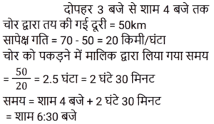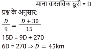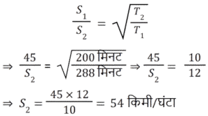 समय , चाल और दूरी Part-3Total Questions: 5031. यदि कोई व्यक्ति 9 km/h की गति से यात्रा करने के बजाय 15 km/h की गति से यात्रा करता है, तो वह 30 km अधिक यात्रा करता है। उसके द्वारा तय की गई वास्तविक दूरी कितनी है? [RRB NTPC 18/01/2021 (Evening)](a) 45 km (b) 43 km (c) 42 km (d) 41 kmCorrect Answer: (a) 45 km Solution:32. एक शहर का नक्शा 1 : 50000 के पैमाने पर बनाया गया है। इस नक्शे पर दो शहरों A और B के बीच की दूरी 12 cm है। दोनों शहरों के बीच वास्तविक दूरी कितनी होगी? [RRB NTPC 19/01/2021 (Evening)](a) 15 km (b) 12 km (c) 6 km(d) 9 kmCorrect Answer: (c) 6 kmSolution:33. यदि एक रेलगाड़ी 42 km/h की औसत गति से चलती है, तो वह एक निश्चित दूरी 45 मिनट में तय करती है। उसी यात्रा के समय को 35 मिनट तक कम करने के लिए रेलगाड़ी को कितनी गति से चलना चाहिए? [RRB NTPC 21/01/2021 (Morning)](a) 49 km/h (b) 54 km/h(c) 52 km/h (d) 52.5 km/hCorrect Answer: (b) 54 km/hSolution:34. एक निश्चित दूरी (d) एक साइकिल चालक द्वारा एक निश्चित गति से तय की जाती है। यदि एक घुड़दौड़ समय (t) के दुगने समय में आधी दूरी तय करता है, तो साइकिल चालक की गति का घुड़दौड़ की गति से अनुपात कितना है? [RRB NTPC 21/01/2021 (Evening)](a) 2 : 1 (b) 4 : 1(c) 3 : 4 (d) 1 : 2Correct Answer: (b) 4 : 1Solution:35. सोहन और मोहन स्कूल से 3.5 km/hr और 4 km/h की गति से चलना शुरू करते हैं। यदि वे एक ही दिशा में चलना शुरू करते हैं तो उन्हें 1.5 km दूर होने में कितना समय लगेगा? [RRB NTPC 22/01/2021 (Morning)](a) 9 मिनट (b) 3 घंटे(c) 1 घंटे (d) 12 मिनटCorrect Answer: (b) 3 घंटेSolution:36. रविकांत 12.5 km/h की गति से साइकिल चलाता है और 3 km/h की गति से चलता है। 40 km की दूरी साइकिल से तय करने और चलने में, रविकांत ने 7 घंटे का समय लिया। इनमें से कितने घंटे साइकिल चलाने में व्यतीत हुए? [RRB NTPC 23/01/2021 (Evening) ](a) 4 (b) 5 (c) 2(d) 3Correct Answer: (c) 2Solution:37. एक चोर 3 p.m. पर एक कार से एक बैग चोरी करके, 50 km/h की चाल से गाड़ी चलाते हुए भागता है। यदि 4 pm पर चोर की स्थिति का पता चल जाता है और उसका मालिक अपनी कार से 70 km/h की चाल से उसका पीछा करता है, तो वह चोर को कब पकड़ लेगा? [RRB NTPC 23/01/2021 (Evening)](a) 6 : 30 pm (b) 8 : 00 pm(c) 6 : 00 pm (d) 8 : 45 pmCorrect Answer: (a) 6 : 30 pm Solution:38. दो ट्रेनें एक ही समय में दो स्टेशनों से शुरू होती हैं और क्रमशः: 20 km/h और 25 km/h की गति से एक-दूसरे की ओर बढ़ती हैं। जब वे मिलते हैं, तो पता चलता है कि एक ट्रेन ने दूसरी से 80 km अधिक यात्रा की है। दो स्टेशनों के बीच की दूरी ज्ञात कीजिये। [RRB NTPC 25/01/2021 (Morning)](a) 720 km (b) 700 km(c) 730 km (d) 710 kmCorrect Answer: (a) 720 km Solution:39. यदि एक मोटर कार पहले आधे भाग को 30 km/h की गति से और शेष आधी दूरी को 50 km/h की गति से तय करती है, तो इसकी औसत गति क्या होगी? [RRB NTPC 27/01/2021 (Morning)](a) 37.5 km/h (b) 45 km/h(c) 40 km/h (d) 37 km/hCorrect Answer: (a) 37.5 km/h Solution:40. दो ट्रेनें दिल्ली और पटना से चलती हैं, और क्रमशः: पटना और दिल्ली की ओर जाती हैं। एक-दूसरे को पार करने के बाद, वे क्रमशः: पटना और दिल्ली पहुँचने में 4 घंटे 48 मिनट और 3 घंटे 20 मिनट का समय लेते हैं। यदि दिल्ली से चलने वाली ट्रेन 45 km/h की गति से चल रही है, तो दूसरी ट्रेन की गति ज्ञात कीजिए। [RRB NTPC 27/01/2021 (Evening)](a) 55 km/h (b) 50 km/h (c) 54 km/h(d) 52 km/hCorrect Answer: (c) 54 km/hSolution:Submit Quiz« Previous12345Next »