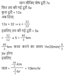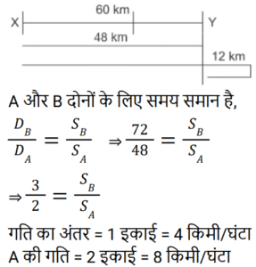 समय , चाल और दूरी Part-4Total Questions: 5021. रोहन को A से B तक की यात्रा करनी थी। उसने 75% दूरी 60 km/h की गति से और शेष दूरी 40 km/h की गति से तय की। पूरी यात्रा में उसकी औसत गति क्या थी? [RRB NTPC 17/02/2021 (Evening)](a) 50 km/h (b) 54 2⁄3 km/h (c) 53 1⁄3 km/h(d) 55 km/hCorrect Answer: (c) 53 1⁄3 km/hSolution:22. विनोद ने अपने घर से अपने कार्यालय तक 20 km/h की गति से यात्रा की और 5 km/h की गति से वापस चला गया। पूरी यात्रा में 4 घंटे लगे। उसके कार्यालय और उसके घर के बीच की दूरी कितनी है? [RRB NTPC 22/02/2021 (Evening)](a) 10 km (b) 6 km (c) 16 km(d) 8 kmCorrect Answer: (c) 16 kmSolution:23. A और B एक साथ बिंदु X से शुरू करते हैं और बिंदु Y की ओर जाते हैं। X और Y 60 km दूर हैं। A की गति B से 4 km/h कम है। B, Y पर पहुँचने के बाद वापस आता है और Y से 12 km दूर एक बिंदु पर A से मिलता है। A की गति ज्ञात कीजिए? [RRB NTPC 27/02/2021 (Morning)](a) 16 km/h (b) 20 km/h (c) 8 km/h(d) 12 km/hCorrect Answer: (c) 8 km/hSolution:24. एक ट्रेन 25 मिनट में 12 km की दूरी तय करती है। यदि इसकी गति में 5 km/h की कमी कर दी जाती है, तो इसके द्वारा समान दूरी को तय करने में लिया गया समय (मिनटों में) होगा [RRB NTPC 27/02/2021 (Evening)](a) 30 3⁄119 (b) 30 31⁄119 (c) 30 32⁄119 (d) 30 30⁄119Correct Answer: (d) 30 30⁄119Solution:25. एक हवाई जेट 5 घंटे में 144 km/hr की गति से एक निश्चित दूरी तय करता है। उसी दूरी को 2 घंटे में तय करने के लिए, एयर जेट की आवश्यक गति क्या है? [RRB NTPC 27/02/2021 (Evening)](a) 365 km/hr (b) 370 km/hr (c) 360 km/hr(d) 350 km/hrCorrect Answer: (c) 360 km/hrSolution:26. एक कार, एक ट्रेन और एक बस की गति का अनुपात 4 : 7 : 3 है। कार, बस और ट्रेन की गति का औसत 70 km/h है। कार और ट्रेन की गति का औसत क्या है? [RRB NTPC 01/03/2021 (Evening)](a) 82.5 km/h (b) 81.5 km/h (c) 83 km/h (d) 81 km/hCorrect Answer: (a) 82.5 km/h Solution:27. एक व्यक्ति 4 घंटे में 84 km दूर अपने गंतव्य तक पहुँचने की इच्छा रखता है। दूरी के पहले भाग के लिए, उसकी गति 28 km/h थी। शेष दूरी के लिए उसकी चाल कितनी होनी चाहिए? [RRB NTPC 02/03/2021 (Evening)](a) 16 1⁄5 km/h (b) 16 2⁄5 km/h (c) 16 4⁄5 km/h(d) 16 km/hCorrect Answer: (c) 16 4⁄5 km/hSolution:28. एक गाड़ी दो ऐसे व्यक्तियों, जो ट्रेन की विपरीत दिशा में 4 m/s और 10 m/s की दर से चल रहे हैं, को क्रमशः 10 सेकंड और 8 सेकंड में पार करती है। ट्रेन की चाल क्या है? [RRB NTPC 03/03/2021 (Morning)](a) 15 m/s(b) 20 m/s(c) 40 m/s(d) 10 m/sCorrect Answer: (b) 20 m/sSolution:29. एक स्कूटर सवार 5 घंटे की यात्रा करता है। पहली आधी दूरी 21 km/h और शेष 24 km/h की गति से तय करता है। तय की गई दूरी ज्ञात कीजिए। [RRB NTPC 03/03/2021 (Evening)](a) 56 km (b) 224 km (c) 225 km (d) 112 kmCorrect Answer: (d) 112 kmSolution:30. एक आदमी ने 32 km की दूरी तय की। 1 घंटा 20 मिनट के बाद उसने देखा कि उसने जो दूरी तय की वह शेष दूरी का 5⁄7वाँ हिस्सा है। किमी/घंटा में उसकी गति क्या थी? [RRB NTPC 04/03/2021 (Morning)](a) 24 km/hr (b) 16 km/hr (c) 12 km/hr (d) 10 km/hrCorrect Answer: (d) 10 km/hrSolution:Submit Quiz« Previous12345Next »