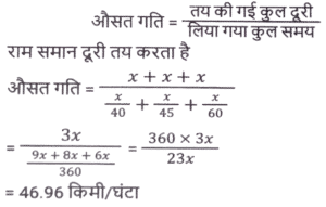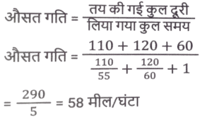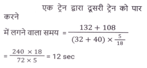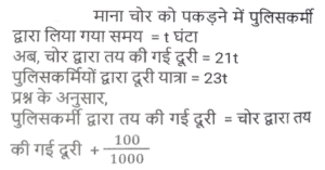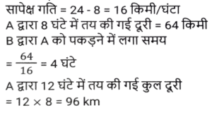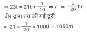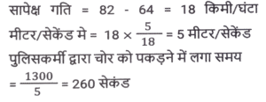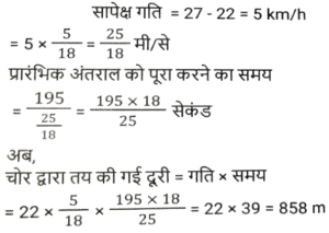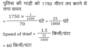 समय ,चाल और दूरी (Part-II)Total Questions: 5031. एक पुलिसकर्मी 195 मीटर की दूरी से एक चोर को देखता है। जब पुलिसकर्मी उसका पीछा करना शुरू करता है, तो चोर भी भागने लगता है। यदि चोर की चाल 22 km/h है और पुलिसकर्मी की चाल 27 km/h है, तो पकड़े जाने से पहले चोर कितनी दूरी तक (m में) भाग चुका होगा ? [SSC CGL 19/09/2024 (3rd Shift)](a) 825(b) 951(c) 858(d) 958Correct Answer: (c) 858Solution:32. एक पुलिसकर्मी 100m की दूरी से एक चोर को देखता है। चोर भागने लगता है और पुलिसकर्मी उसका पीछा करता है। यदि चोर और पुलिसकर्मी की चाल क्रमशः 21 km/h और 23 km/h है, तो पकड़े जाने से पहले चोर कितनी दूर तक भाग पाएगा ? [SSC CGL 24/09/2024 (1st Shift)](a) 1020 m(b) 1050 m(c) 1090 m(d) 1080 mCorrect Answer: (b) 1050 mSolution:33. 132 m और 108m लंबी दो मालगाड़ियां समानांतर पटरियों पर एक-दूसरे की ओर आ रही हैं। पहली ट्रेन 32 km/h की चाल से चल रही है और दूसरी 40 km/h की गति से चल रही है। मिलने के बाद वे एक दूसरे को पार करने में कितना समय लेंगी ? [SSC CGL 24/09/2024 (2nd Shift)](a) 12 s(b) 10 s(c) 13 s(d) 15 sCorrect Answer: (a) 12 sSolution:34. एक पुलिसकर्मी 82 km/h की चाल से एक चोर का पीछा कर रहा है। चोर 1300m दूर है और 64 km/h की चाल से भाग रहा है। यदि दोनों बाइक पर सवार हैं तो पुलिसकर्मी चोर को कितने समय में पकड़ लेगा? [SSC CGL 24/09/2024 (3rd Shift)](a) 350 sec(b) 260 sec(c) 250 sec(d) 300 secCorrect Answer: (b) 260 secSolution:35. मान लीजिए A, 8 km/h की चाल से चलना शुरू करता है। 8 घंटे के बाद B, 24 km/h की चाल से साइकिल से यात्रा करना शुरू करता है। प्रारंभिक स्थान से वह दूरी जहाँ B, A से मिल सकता है, कितनी है ? [SSC CGL 25/09/2024 (1st Shift)](a) 64 km(b) 96 km(c) 72 km(d) 88 kmCorrect Answer: (b) 96 kmSolution:36. 250 m की दूरी पर एक पुलिस कार को देखकर एक चोर एक निश्चित चाल से अपनी बाइक से भागता है। पुलिस की गाड़ी चोर का पीछा करती है और उसे पकड़ लेती है। यदि चोर पकड़े जाने से पहले 1.5 km भागता है और पुलिस की कार की चाल 70 km/h है, तो चोर की बाइक की चाल (km/h में) कितनी है ? [SSC CGL 26/09/2024 (2nd Shift)](a) 65(b) 60(c) 55(d) 50Correct Answer: (b) 60Solution:37. एक मोटरसाइकिल अपनी यात्रा के पहले 60 km की दूरी को 40 km/h की औसत चाल से तय करती है। शेष यात्रा अर्थात 90 km की दूरी तय करने के लिए मोटरसाइकिल की चाल 45 km/h थी। पूरी यात्रा के दौरान मोटरसाइकिल की कुल औसत चाल कितनी थी? [SSC CHSL 01/07/2024 (1st Shift)](a)(b)(c)(d)Correct Answer: (d)Solution:38. एक व्यक्ति 5 km/h की चाल से चलते हुए एक निश्चित दूरी को 3 घंटे 45 मिनट में तय करता है। यदि वह समान दूरी को एक साइकिल द्वारा 2 घंटे 10 मिनट में तय करता है, तो साइकिल की km/h में चाल क्या है? [SSC CHSL 01/07/2024 (1st Shift)](a)(b)(c)(d)Correct Answer: (b)Solution:39. एक व्यक्ति 55 मील प्रति घंटे की चाल से 110 मील तक गाड़ी चलाता है, वह अगली 120 मील की यात्रा 60 मील प्रति घंटे की चाल से तय करता है और अगली 60 मील की दूरी एक घंटे में तय करता है। मील प्रति घंटे में पूरी यात्रा के लिए उसकी औसत चाल कितनी है? [SSC CHSL 01/07/2024 (2nd Shift)](a) 55(b) 60(c) 63(d) 58Correct Answer: (d) 58Solution:40. राम ने 40 km/hr, 45 km/hr और 60 km/hr की चाल से समान दूरी तय की। पूरी यात्रा के दौरान राम की औसत चाल क्या थी? दशमलव के दो स्थानों तक सही। [SSC CHSL 01/07/2024 (2nd Shift)](a) 94.66 km/hr(b) 46.96 km/hr(c) 64.96 km/hr(d) 66.94 km/hrCorrect Answer: (b) 46.96 km/hrSolution:Submit Quiz« Previous1