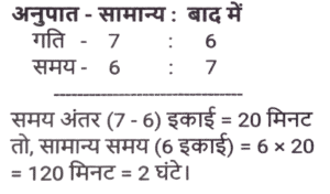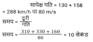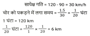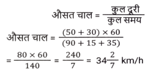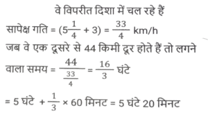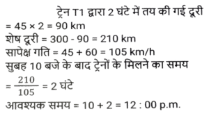 समय ,चाल और दूरी (Part-II)Total Questions: 5041. अपनी सामान्य चाल की 6/7 चाल से चलती हुई एक बस 20 मिनट देरी से पहुँचती है। बस का इस यात्रा को पूरा करने का सामान्य समय क्या है? [SSC CHSL 02/07/2024 (2nd Shift)](a) 3 घंटे(b) 4 घंटे(c) 1.5 घंटा(d) 2 घंटेCorrect Answer: (d) 2 घंटेSolution:42. मिथिला बस से 50 km की दूरी 90 मिनट में तय करती है। बस से उतरने के बाद, वह 15 मिनट आराम करती है और टैक्सी द्वारा 35 मिनट में 30 km की एक और दूरी तय करती है। पूरी यात्रा के लिए औसत चाल (km/h में) ज्ञात कीजिए। [SSC CHSL 02/07/2024 (3rd Shift)](a) 34²⁄₇(b) 32²⁄₇(c) 31²⁄₇(d) 33²⁄₇Correct Answer: (a) 34²⁄₇Solution:43. एक पुलिसकर्मी को सूचना मिली कि एक चोर उससे 1.5 km की दूरी पर है। चोर कार से चलना शुरू करता है और पुलिसकर्मी कार से उसका पीछा करता है। चोर और पुलिसकर्मी क्रमशः 90 km/h और 120 km/h की चाल से आगे बढ़ रहे हैं। पुलिसकर्मी किस दूरी (km में) पर चोर को पकड़ लेगा ? [SSC CHSL 02/07/2024 (3rd Shift)](a) 45.0 km(b) 4.5 km(c) 6 km(d) 5 kmCorrect Answer: (c) 6 kmSolution:44. क्रमशः 310 m और 330 m लंबी दो रेलगाड़ियां एक-दूसरे से 160 m की दूरी पर हैं। वे समानांतर पटरियों पर क्रमशः 130 km/h और 158 km/h की चाल से एक दूसरे की ओर बढ़ना शुरू करती हैं। दोनों रेलगाड़ियां एक-दूसरे को कितने समय में (सेकंड में) पार करेंगी? [SSC CHSL 02/07/2024 (4th Shift)](a) 10(b) 18(c) 8(d) 12Correct Answer: (a) 10Solution:45. दो स्टेशन T1 और T2 एक-दूसरे से 300 km की दूरी पर है। एक कार स्टेशन T1 से 8 am पर चलना शुरू करती है और स्टेशन T2 की ओर 45 km/hr की चाल से चलती है। 10 am पर एक दूसरी कार स्टेशन T2 से T1 की ओर 60 km/hr की चाल से चलना शुरू करती है। दोनों कारें किस समय मिलेंगी ? [SSC CHSL 03/07/2024 (1st Shift)](a) 12:00 p.m.(b) 11:00 a.m.(c) 1:00 p.m.(d) 10:00 a.mCorrect Answer: (a) 12:00 p.m.Solution:46. एक बस चालक को 240 किमी की यात्रा 4 घंटे में पूरी करनी है। यदि वह अपनी यात्रा के पहले 3 घंटो में औसतन 70 किमी प्रति घंटे की चाल से चलता है, तो उसे आखिरी /अंतिम घंटे में किस चाल से (किमी/घंटा में) यात्रा करनी होगी? [SSC CHSL 03/07/2024 (1st Shift)](a) 50(b) 60(c) 30(d) 35Correct Answer: (c) 30Solution:47. राम और श्याम एक ही स्थान से विपरीत दिशा में चलना शुरू करते हैं। यदि श्याम 5¼ km/hr की चाल से चलता है और राम 3 km/hr की चाल से चलता है, तो कितने समय बाद वे एक दूसरे से 44 km दूर होंगे? [SSC CHSL 03/07/2024 (4th Shift)](a) 6 घंटे 20 मिनट(b) 4 घंटे 20 मिनट(c) 3 घंटे 20 मिनट(d) 5 घंटे 20 मिनटCorrect Answer: (d) 5 घंटे 20 मिनटSolution:48. शंकर कार द्वारा 40 km/h की चाल से एक निश्चित दूरी तय करता है और वह स्कूटर पर सवार होकर 20 km/h की चाल से प्रारंभिक बिंदु पर लौटता है। पूरी यात्रा की औसत चाल बताइए। [SSC CHSL 04/07/2024 (1st Shift)](a) 22⅔ km/h(b) 29⅔ km/h(c) 24⅔ km/h(d) 26⅔ km/hCorrect Answer: (d) 26⅔ km/hSolution:49. यदि एक कार 36 किमी/घंटा की चाल से चलती है तो वह 85 मिनट में एक निश्चित दूरी तय करती है। यात्रा के समय को 51 मिनट तक कम करने के लिए कार को किस चाल से चलाना होगा? [ SSC CHSL 04/07/2024 (3rd Shift)](b) 60 किमी/घंटा(a) 50 किमी/घंटा(c) 70 किमी/घंटा(d) 80 किमी/घंटाCorrect Answer: (b) 60 किमी/घंटाSolution:50. 9 km/h की चाल से चल रही एक लड़की एक पुल को 45 मिनट में पार करती है। पुल की लंबाई मीटर में ज्ञात कीजिए। [SSC CHSL 05/07/2024 (1st Shift)](a) 7532(b) 6750(c) 6349(d) 6398Correct Answer: (b) 6750Solution:Submit Quiz« Previous12345