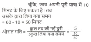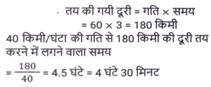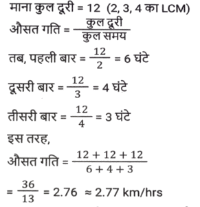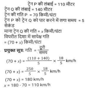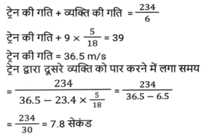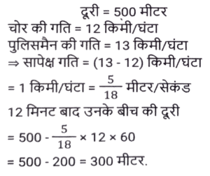 समय ,चाल और दूरी (Part-III)Total Questions: 5031. 234 m लंबी एक ट्रेन विपरीत दिशा में 9 km/h की चाल से चल रहे एक व्यक्ति को 6 सेकंड में पार कर जाती है। ट्रेन समान दिशा में 23.4 km/h की चाल से चल रहे एक अन्य व्यक्ति को कितने समय में (सेकंड में) पार कर लेगी? [SSC CPO 29/06/2024 (2nd Shift)](a) 8(b) 7.8(c) 7.2(d) 8.4Correct Answer: (b) 7.8Solution:32. 110 m और 140 m की लंबाई वाले दो ट्रेन क्रमशः P और Q विपरीत दिशाओं में समानांतर पटरियों पर चल रही हैं। ट्रेन P, 70 km/h की चाल से चल रही है और ट्रेन Q को पार करने में 5 सेकंड का समय लेती है। ट्रेन Q की चाल ज्ञात कीजिए। [SSC CPO 29/06/2024 (3rd Shift)](a) 120 km/h(b) 110 km/h(c) 90 km/h(d) 100 km/hCorrect Answer: (b) 110 km/hSolution:33. एक छात्र साइकिल से अपने स्कूल जाता है। उसके घर से स्कूल की दूरी 5 km है और वह इस दूरी को 1 घंटे में तय करता है। जाते समय वह दो बार 5-5 मिनट के लिए रुकता है। उसकी औसत चाल (km/h में) ज्ञात कीजिए। [SSC CPO 29/06/2024 (3rd Shift)](a) 5.5(b) 6.5(c) 6(d) 4.5Correct Answer: (c) 6Solution:34. यदि एक कार 60 km/h की चाल से चलती है और एक निश्चित दूरी तय करने में 180 मिनट का समय लेती है, तो समान दूरी को 40 km/h की चाल से तय करने में उसे कितना समय लगेगा? [SSC CPO 29/06/2024 (3rd Shift)](a) 3 घंटे(b) 4 घंटे 30 मिनट(c) 3 घंटे 45 मिनट(d) 3 घंटे 15 मिनटCorrect Answer: (b) 4 घंटे 30 मिनटSolution:35. एक कार दिल्ली से गुरुग्राम की दूरी 60 km/h की चाल से तय करती है और 40 km/h की समान चाल से वापस आती है। पूरी यात्रा के दौरान कार की औसत चाल क्या है ? [Matriculation Level 20/06/2024 (Shift-1)](a) 40 km/h(b) 60 km/h(c) 50 km/h(d) 48 km/hCorrect Answer: (d) 48 km/hSolution:36. एक आदमी 25 मिनट में 3 km और 200 m चलता है। तो बताइए कि उसकी चाल (km/h में) कितनी है ? [Matriculation Level 20/06/2024 (Shift-1)](a) 7.86(b) 7.68(c) 8.76(d) 6.87Correct Answer: (b) 7.68Solution:37. एक शिक्षक ने 7 घंटे में 22 km की दूरी तय की। उन्होंने आंशिक रूप से 2 km/h की चाल से पैदल यात्रा की और आंशिक रूप से 4 km/h की चाल से साइकिल से यात्रा की। पैदल तय की गई दूरी कितनी है ? [Matriculation Level 20/06/2024 (Shift - 4)](a) 10 km(b) 3 km(c) 6 km(d) 8 kmCorrect Answer: (c) 6 kmSolution:38. यदि तन्मय तीन समान दूरी को क्रमशः 2 km/h, 3 km/h और 4 km/h की चाल से तय करता है, तो पूरी यात्रा के दौरान उसकी औसत चाल (km/h में) ज्ञात कीजिए। (दो दशमलव स्थान तक पूर्णांकित) [Matriculation Level 20/06/2024 (Shift - 4)](a) 3.25(b) 5.75(c) 4.35(d) 2.77Correct Answer: (d) 2.77Solution:39. एक ट्रेन 500m लंबे प्लेटफार्म को 12 सेकंड में और प्लेटफॉर्म पर खड़े एक व्यक्ति को चार सेकंड में पार करती है। ट्रेन की चाल ज्ञात करें। [Matriculation Level 20/06/2024 (Shift - 4)](a) 252.5 km/h(b) 125 km/h(c) 225 km/h(d) 152.5 km/hCorrect Answer: (c) 225 km/hSolution:40. एक पुलिसमैन ने एक चोर को 500 m की दूरी से देखा। चोर भागने लगता है और पुलिसमैन उसका पीछा करता है। चोर और पुलिसमैन क्रमशः 12 km/h और 13 km/h की चाल से दौड़ते हैं। 12 मिनट के बाद दोनों के बीच की दूरी कितनी होगी ? [Matriculation Level 20/06/2024 (Shift - 4)](a) 150 m(b) 100 m(c) 300 m(d) 200 mCorrect Answer: (c) 300 mSolution:Submit Quiz« Previous12345Next »
