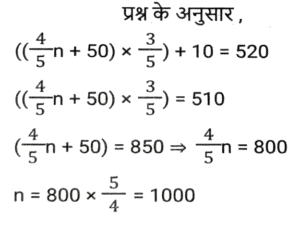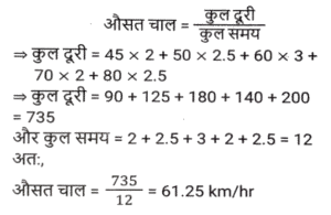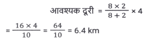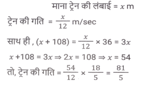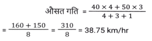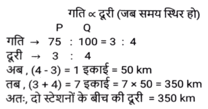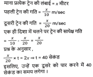 समय ,चाल और दूरी (Part-III)Total Questions: 5041. A सप्ताह के पांच दिनों में क्रमशः 2 घंटे, 2.5 घंटे, 3 घंटे, 2 घंटे और 2.5 घंटे ड्राइव करता है। इन दिनों में उसकी चाल क्रमशः 45 km/h, 50 km/h, 60 km/h, 70 km/h और 80 km/h है। सप्ताह के लिए उसकी औसत चाल क्या है ? [Matriculation Level 21/06/2024 (Shift - 1)](a) 68.02 km/h(b) 60.8 km/h(c) 61.25 km/h(d) 64.08 km/hCorrect Answer: (c) 61.25 km/hSolution:42. दो रेलगाड़ियाँ A और B क्रमशः स्थान P से Q और स्थान Q से P की ओर एक ही समय पर एक दूसरे की ओर चलना शुरू करती हैं। एक दूसरे को पार करने के बाद, रेलगाड़ी A और B को क्रमशः स्थान Q और P तक पहुँचने के लिए 9 घंटे और 16 घंटे लगते हैं। यदि रेलगाड़ी A की चाल 56 km/h थी, तो रेलगाड़ी B की चाल (km/h में) क्या थी ? [Matriculation Level 21/06/2024 (Shift - 1)](a) 40(b) 46(c) 42(d) 38Correct Answer: (c) 42Solution:43. एक ट्रेन स्टेशन P से यात्रियों की संख्या 'n' के साथ चलना शुरू होती है। स्टेशन Q पर, 20% यात्री उतर जाते हैं और 50 यात्री चढ़ जाते हैं। स्टेशन R पर, 40% यात्री उतर जाते हैं और 10 यात्री चढ़ जाते हैं। यदि ट्रेन में कुल 520 यात्री बचे हैं, तो 'n' का मान ज्ञात करें। [Matriculation Level 21/06/2024 (Shift - 4)](a) 855(b) 1000(c) 750(d) 975Correct Answer: (b) 1000Solution:44. एक ट्रक ड्राइवर 40 km/h की चाल से 4 घंटे तक गाड़ी चलाता है। 1 घंटे आराम करने के बाद वह 50 km/h की रफ्तार से और 3 घंटे के लिए गाड़ी चलाता है। पूरी यात्रा के दौरान चालक की औसत चाल km/h में क्या थी ? [Matriculation Level 21/06/2024 (Shift - 4)](a) 40(b) 38.75(c) 39.25(d) 36.50Correct Answer: (b) 38.75Solution:45. राम अपने घर से कार्यालय 8 km/h की चाल से जाता है और 2 km/h की चाल से वापस आता है। यदि उसे जाने और वापस आने में चार घंटे लगते हैं, तो घर और कार्यालय के बीच की दूरी ज्ञात करें। [Matriculation Level 21/06/2024 (Shift - 4)](a) 6.4 km(b) 5.3 km(c) 7.4 km(d) 6.3 kmCorrect Answer: (a) 6.4 kmSolution:46. एक कार 2.4 लीटर पेट्रोल में 45.6 km की दूरी तय करती है। 1 लीटर पेट्रोल में यह कितनी दूरी तय करेगी? [Matriculation Level 24/06/2024 (Shift - 1)](a) 19 km(b) 20 km(c) 19.4 km(d) 109.44 kmCorrect Answer: (a) 19 kmSolution:47. रेलवे प्लेटफॉर्म पर खड़े राम ने देखा कि एक ट्रेन 108 m लंबे प्लेटफॉर्म को पूरी तरह से पार करने में 36 सेकंड लेती है, और उसे पार करने में 12 सेकंड लेती है। ट्रेन की चाल ज्ञात करें। [Matriculation Level 24/06/2024 (Shift - 4)](a) 25.2 km/h(b) 18.2 km/h(c) 16.2 km/h(d) 20.2 km/hCorrect Answer: (c) 16.2 km/hSolution:48. 350m लंबी एक मालगाड़ी 1250 m लंबी सुरंग को 80 सेकंड में पार करती है। मालगाड़ी की चाल क्या है ? [Matriculation Level 25/06/2024 (Shift - 1)](a) 64 km/h(b) 78 km/h(c) 56 km/h(d) 72 km/hCorrect Answer: (d) 72 km/hSolution:49. दो रेलगाड़ियाँ एक ही समय पर स्टेशन P और Q से चलना शुरू करती हैं और क्रमशः 75 km/h और 100 km/h की चाल से एक-दूसरे की ओर बढ़ती हैं। जब दोनों रेलगाड़ियाँ आपस में मिलती है, तो यह पता चलता है कि एक रेलगाड़ी दूसरी रेलगाड़ी से 50 km अधिक यात्रा कर चुकी है। दोनों स्टेशनों के बीच की दूरी (km में) क्या है? [Matriculation Level 25/06/2024 (Shift - 1)](a) 300(b) 350(c) 375(d) 325Correct Answer: (b) 350Solution:50. समान लंबाई की दो रेलगाड़ियों को एक खम्भे को पार करने में क्रमशः 10 सेकंड और 20 सेकंड का समय लगता है। यदि ये रेलगाड़ियाँ एक ही दिशा में चल रही हैं, तो एक-दूसरे को पार करने में उन्हें कितना समय लगेगा ? [Matriculation Level 25/06/2024 (Shift - 1)](a) 10 सेकंड(b) 15 सेकंड(