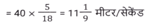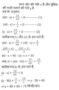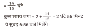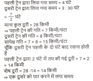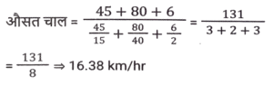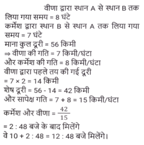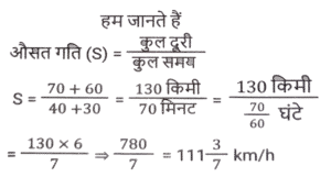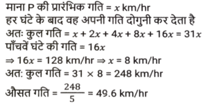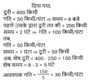 समय ,चाल और दूरी (Part-IV)Total Questions: 501. रेशमा साइकिल से 45 km की दूरी 15 km/h की चाल से, कार से 80 km की दूरी 40 km/h की चाल से और पैदल चलकर बाकी 6 km की दूरी 2 km/h की चाल से तय करती है। पूरी यात्रा के लिए उसकी औसत चाल ज्ञात कीजिए (2 दशमलव स्थान तक सही)। [Matriculation Level 26/06/2024 (Shift - 1)](a) 18.36 km/h(b) 43.50 km/h(c) 16.38 km/h(d) 15.25 km/hCorrect Answer: (c) 16.38 km/hSolution:2. एक पुलिस कर्मी सीधी सड़क पर चोर का पीछा करता है। यदि पुलिसकर्मी 60 km/h की चाल से गाड़ी चलाता है, तो वह चोर को 15 मिनट में पकड़ लेता हैऔर यदि वह 45 km/h की चाल से गाड़ी चलाता है तो चोर को 0.5 घंटे में पकड़ लेता है। केवल 10 मिनट में चोर को पकड़ने के लिए पुलिसकर्मी की गाड़ी की चाल (km/h में) क्या होनी चाहिए? [Matriculation Level 26/06/2024 (Shift - 1)](a) 70(b) 75(c) 65(d) 90Correct Answer: (b) 75Solution:3. एक बस 30 घंटे में 1200 km की दूरी तय करती है। इसकी औसत चाल m/s में क्या है ? [Higher Secondary 20/06/2024 (Shift - 2)](a) 12⅑(b) 12⅓(c) 11⅑(d) 13⅑Correct Answer: (c) 11⅑Solution:4. एक बस अपनी यात्रा के पहले 70 km को 40 मिनट में और शेष 60 km को 30 मिनट में तय करती है। बस की औसत चाल (km/h में) कितनी है ? [Higher Secondary 20/06/2024 (Shift - 2)](a) 106⁵⁄₇(b) 109³⁄₇(c) 111³⁄₇(d) 91²⁄₇Correct Answer: (c) 111³⁄₇Solution:5. वीणा और कर्मेश दिल्ली में अलग-अलग जगहों पर थे। उन्होंने कुछ मुद्दों को सुलझाने के लिए मिलने के लिए एक बैठक की जगह तय की। वीणा स्थान A से 8:00a.m. पर अपनी यात्रा शुरू करती है और 4:00p.m. पर स्थान B पर पहुँचती है और कर्मेश वीणा के शुरू होने के 2 घंटे बाद स्थान B से चलना शुरू करता है और उसी दिन, उसी रास्ते से 5:00 p.m. पर स्थान A पर पहुँच सकता है। कर्मेश और वीणा किस समय एक दूसरे से मिलेंगे ? [Higher Secondary 21/06/2024 (Shift - 2)](a) 1:24 p.m.(b) 12:48 p.m.(c) 1:00 p.m.(d) 1:46 p.m.Correct Answer: (b) 12:48 p.m.Solution:6. राशि ने 50 km/h की औसत चाल से 400 km की दूरी तय की। वह प्रथम अंतराल में पहली आधी दूरी 2 घंटे में तय करती है, जबकि वह द्वितीय अंतराल की दूरी को प्रथम अंतराल की आधी चाल से 1 घंटे में तय करती है। शेष दूरी की चाल (km/h में) ज्ञात कीजिए। [Higher Secondary 21/06/2024 (Shift - 2)](a) 45(b) 50(c) 60(d) 30Correct Answer: (d) 30Solution:7. P एक कार को 5 घंटे चलाता है और प्रत्येक घंटे के बाद वह कार की चाल को दोगुना कर देता है। पाँचवें घंटे में उसकी चाल 128 km/h है। यात्रा की उसकी औसत चाल (km/h में) क्या है ? [Higher Secondary 21/06/2024 (Shift - 2)](a) 52.6(b) 55.6(c) 49.6(d) 62.6Correct Answer: (c) 49.6Solution:8. एक ट्रेन हैदराबाद से 4:00 A.M. पर प्रस्थान करती है और उसी दिन 8:00 A.M. पर विजयवाड़ा पहुंचती है। दूसरी ट्रेन विजयवाड़ा से 6:00 A.M. पर प्रस्थान करती है और उसी दिन 9:30 A.M. पर हैदराबाद पहुंचती है। दोनों ट्रेनें कितने बजे एक-दूसरे को पार करती हैं ? [Higher Secondary 25/06/2024 (Shift - 4)](a) 6:45 Α.Μ.(b) 7:56 Α.Μ.(c) 7:45 Α.Μ.(d) 6:56 A.M.Correct Answer: (d) 6:56 A.M.Solution:9. एक ट्रक पहले घंटे में 75 km और दूसरे घंटे में 33 km की यात्रा करता है। ट्रक की औसत चाल ज्ञात कीजिए (km/h में)। [Graduate Level 20/06/2024 (Shift - 3)](a) 42(b) 108(c) 54(d) 60Correct Answer: (c) 54Solution:10. एक व्यक्ति अपनी यात्रा का दो-पांचवां भाग 40 km/h की चाल से पूरा करता है और शेष यात्रा 60 km/h की चाल से पूरी करता है। पूरी यात्रा में उसकी औसत चाल (km/h में) क्या है ? [Graduate Level 26/06/2024 (Shift - 4)](a) 40(b) 48(c) 60(d) 50Correct Answer: (d)