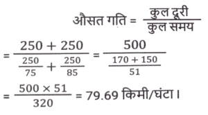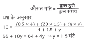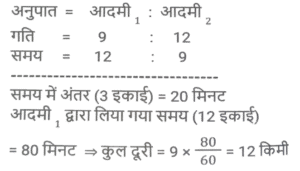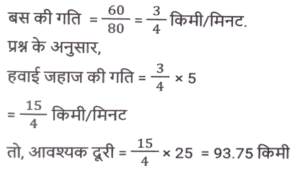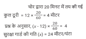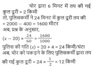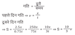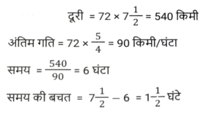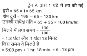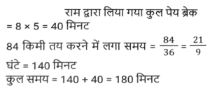 समय ,चाल और दूरी (Part-V)Total Questions: 5011. सुधीन ने 4 घंटे के लिए 8.5 km/h की चाल से साइकिल चलाई, फिर एक ऑटो लिया और 1.5 घंटे के लिए 20 km/h की चाल से यात्रा की, और फिर y घंटे के लिए 4 km/h की चाल से चला। यदि पूरी यात्रा में सुधीन की कुल औसत चाल 10 km/h थी, तो y का मान क्या है ? [SSC CGL 18/07/2023 (4th shift)](a) 2(b) 1.25(c) 1.5(b) 1.25Correct Answer: (c) 1.5Solution:12. R पहले दिन, चाल v से, समय में x दूरी तय करता है। अगले दिन, वह 0.75t समय में 2.5 x दूरी तय करता है। तो बताइए कि अगले दिन उसकी चाल कितनी है ? [SSC CGL 19/07/2023 (1st shift)](a) 3.5 v(b) (10/3) v(c) 4.5 v(d) (5/3) vCorrect Answer: (b) (10/3) vSolution:13. एक चोर अपराध करता है और 12m/h की चाल से उस स्थान से भागता है। चोर के भागने के 20 मिनट बाद एक चौकीदार ने उसका पीछा करना शुरू किया और अगले 20 मिनट में उसे पकड़ लिया। चौकीदार की चाल (m/h में) क्या है? [SSC CGL 19/07/2023 (2nd shift)](a) 24(b) 30(c) 32(d) 36Correct Answer: (a) 24Solution:14. राम 36 km/h की चाल से गाड़ी चलाता है लेकिन प्रत्येक 10 km के अंत में पेय पीने के लिए पांच मिनट रुकता है। ज्ञात करें कि राम को 84 km की दूरी तय करने में कितना समय लगेगा। [SSC CGL 20/07/2023 (4th shift)](a) 180 मिनट(b) 60 मिनट(c) 220 मिनट(d) 120 मिनटCorrect Answer: (a) 180 मिनटSolution:15. दो कस्बों के बीच की दूरी 72 km/h की चाल से 7 घंटे 30 मिनट में तय की जाती है। यदि चाल को 25% बढ़ा दिया जाए, तो कितने समय की बचत होगी? [SSC CGL 21/07/2023 (2nd shift)](a) 1 घंटा 36 मिनट(b) 1 घंटा 50 मिनट(c) 1 घंटा 30 मिनट(d) 1 घंटा 20 मिनटCorrect Answer: (c) 1 घंटा 30 मिनटSolution:16. दो स्टेशनों S₁ और S₂ के बीच की दूरी 195 km है। एक ट्रेन स्टेशन S₁ से 4:00 pm पर स्टेशन S₂ की ओर 65 km/h की चाल से चलना आरंभ करती है। एक दूसरी ट्रेन स्टेशन S₂ से 5:00 pm पर स्टेशन S₁ की ओर 35 km/h की चाल से चलना आरंभ करती है। दोनों ट्रेनें एक-दूसरे से किस समय मिलेंगी ? [SSC CGL 21/07/2023 (3rd shift)](a) 6:06 p.m(b) 6:30 p.m(c) 6:15 p.m.(d) 6:18 p.mCorrect Answer: (d) 6:18 p.mSolution:17. दो व्यक्ति एक स्थान से क्रमशः 9 km/h और 12 km/h की चाल से चलते हैं। यात्रा को पूरा करने के लिए पहला व्यक्ति दूसरे व्यक्ति से 20 मिनट अधिक लेता है। यात्रा की दूरी ज्ञात कीजिए। [SSC CGL 24/07/2023 (2nd shift)](a) 10 km(b) 13 km(c) 15 km(d) 12 kmCorrect Answer: (d) 12 kmSolution:18. एक हवाई जहाज, बस की तुलना में पाँच गुना तेज चाल से यात्रा करता है। यदि बस 80 मिनट में 60 km की दूरी तय करती है, तो हवाई जहाज 25 मिनट में कितनी दूरी (km में) तय करेगा ? [SSC CGL 24/07/2023 (3rd shift)](a) 95.35(b) 93.75(c) 65.35(d) 18.75Correct Answer: (b) 93.75Solution:19. रमेश ने अपने गृहनगर जाते समय पहले 250km की दूरी 75 km/h की चाल से और अगले 250 km की दूरी 85 km/h की चाल से तय की। पूरी यात्रा के दौरान उसकी औसत चाल ज्ञात करें (2 दशमलव स्थानों तक सही)। [SSC CGL 25/07/2023 (2nd shift)](a) 80.55km/h(b) 79.69km/h(c) 79.20km/h(d) 80.69km/hCorrect Answer: (b) 79.69km/hSolution:20. एक चोर कोई सामान चुराता है और 20 km/h की चाल से भागता है। 6 मिनट बाद एक पुलिसकर्मी अपराध-स्थल पर पहुँचता है तुरंत चोर का पीछा करना आरंभ करता है। पुलिसकर्मी द्वारा चोर का पीछा करने के 24 मिनट बाद भी दोनों के बीच 400m का अंतर है। अपराध स्थल से कितनी दूरी पर पुलिसकर्मी चोर को पकड़ लेगा और पुलिसकर्मी किस चाल से दौड़ा था? [SSC CGL 26/07/2023 (1st shift)](a) 15 km; 25 km/h(b) 14.4 km; 24 km/h(c) 10 km; 25 km/h(d) 12 km; 24 km/hCorrect A