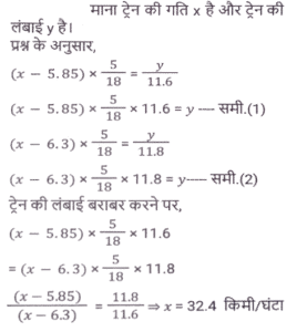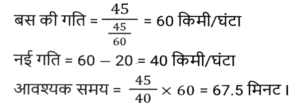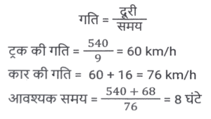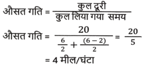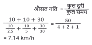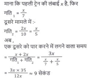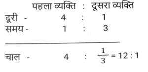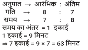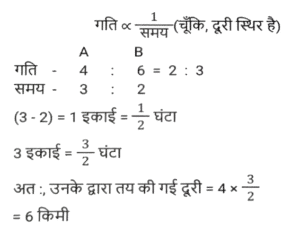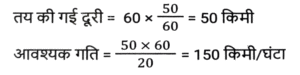 समय ,चाल और दूरी (Part-V)Total Questions: 5021. दो मोटर चालक एक निश्चित गंतव्य की यात्रा के लिए एक साथ, एक 4 km/h की चाल से और दूसरा 6 km/h की चाल से चलना शुरू करते हैं। उनके द्वारा तय की गई दूरी (km में) ज्ञात कीजिए, यदि 4 km/h की चाल से चलने वाला मोटर चालक, दूसरे मोटर चालक से आधे घंटे बाद गंतव्य पर पहुंचता है। [SSC CGL 27/07/2023 (1st shift)](a) 8(b) 5(c) 6(d) 4Correct Answer: (c) 6Solution:22. एक व्यक्ति एक निश्चित चाल से एक निश्चित दूरी तय करता है। यदि कोई दूसरा व्यक्ति तीन गुना समय में 25% दूरी तय करता है, तो पहले व्यक्ति की चाल और दूसरे व्यक्ति की चाल का अनुपात क्या है? [SSC CGL 27/07/2023 (2nd shift)](a) 1:6(b) 1:12(c) 6:1(d) 12:1Correct Answer: (d) 12:1Solution:23. एक ट्रेन प्लेटफॉर्म पर खड़े व्यक्ति को पार करने में 7 सेकंड का समय लेती है और दूसरी ट्रेन जिसकी लंबाई पहली ट्रेन से दोगुनी है और विपरीत दिशा में चलती है, व्यक्ति को पार करने में 10 सेकंड का समय लेती है। ट्रेनों द्वारा एक दूसरे को पार करने में कितना समय (सेकंड में, निकटतम पूर्णांक तक) लगा होगा? [Graduate Level 30/06/2023 (Shift - 1)](a) 8(b) 9(c) 10(d) 12Correct Answer: (b) 9Solution:24. एक मालगाड़ी, स्थिर चाल से यात्रा करते हुए, एक ही दिशा में (ट्रेन की दिशा में चल रहे दो व्यक्तियों को क्रमशः 11.6 सेकंड और 11.8 सेकंड में पार करती है। पहला व्यक्ति 5.85 km/h की चाल से चल रहा था, जबकि दूसरा 6.3 km/h की चाल से चल रहा था। ट्रेन की चाल (km/h में) क्या थी? [Higher Secondary 27/06/2023 (Shift - 3)](a) 32.5(b) 32.6(c) 32.4(d) 32.2Correct Answer: (c) 32.4Solution:25. एक बस 50 मिनट में किसी दूरी को तय करने के लिए 60 km/h की चाल से चल रही है। यात्रा समय को 20 मिनट तक कम करने के लिए, बस को किस चाल (km/h में) से चलना चाहिए? [Matriculation Level 27/06/2023 (Shift - 2)](a) 120(b) 90(c) 140(d) 150Correct Answer: (d) 150Solution:26. एक बस 45 मिनट में 45 km की दूरी तय करती है। यदि इसकी चाल को 20 km/hr कम कर दिया जाए, तो समान दूरी तय करने में इसे कितना समय लगेगा ? [SSC MTS 02/05/2023 (Morning)](a) 62.5 मिनट(b) 67.5 मिनट(c) 78.5 मिनट(d) 72.5 मिनटCorrect Answer: (b) 67.5 मिनटSolution:27. एक व्यक्ति को एक स्थान तक पैदल जाने और वहाँ से पैदल वापस आने में 6 घंटे का समय लगता है। यदि वह दोनों ओर गाड़ी से जाता तो 2 घंटे का समय बचा सकता था। पूरी यात्रा में तय की गई दूरी 20 मील है। यदि वह पैदल जाता है और गाड़ी से वापस आता है, तो पूरी यात्रा के दौरान उसकी औसत चाल कितनी है ? [SSC MTS 02/05/2023 (Morning)](a) 8 मील/घंटा(b) 5 मील/घंटा(c) 6 मील/घंटा(d) 4 मील/घंटाCorrect Answer: (d) 4 मील/घंटाSolution:28. यदि अमन अपनी सामान्य चाल से 12.5 प्रतिशत कम चाल से यात्रा करता है, तो वह 9 मिनट देर से पहुँचेगा। उसके द्वारा लिया जाने वाला सामान्य समय क्या है ? [SSC MTS 04/05/2023 (Afternoon)](a) 63 मिनट(b) 70 मिनट(c) 56 मिनट(d) 49 मिनटCorrect Answer: (a) 63 मिनटSolution:29. एक व्यक्ति 2.5 km प्रति घंटे की चाल से 10 km चलता है, फिर 5 km प्रति घंटे की चाल से 10 km दौड़ता है और फिर 30km प्रति घंटे की चाल से बस से 30km का सफर करता है। व्यक्ति की औसत चाल क्या है ? [SSC MTS 08/05/2023 (Morning)](a) 9 kmph(b) 8.25 kmph(c) 7.14 kmph(d) 7 kmphCorrect Answer: (c) 7.14 kmphSolution:30. एक ट्रक एक निश्चित चाल से 540 km की दूरी 9 घंटे में तय करता है। यदि एक कार की औसत च