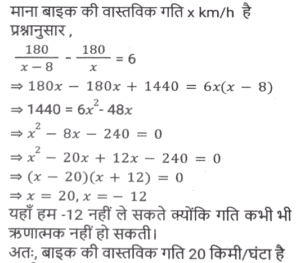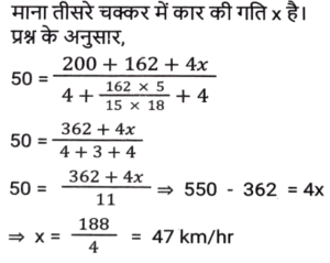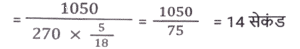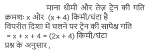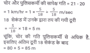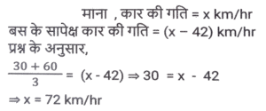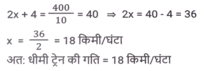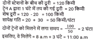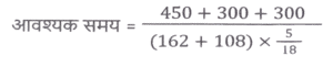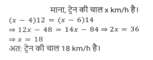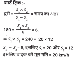 समय ,चाल और दूरी (Part-VI)Total Questions: 5031. दो स्टेशन R तथा S एक दूसरे से 400 कि.मी. की दूरी पर हैं। एक रेलगाड़ी R से S के लिए निकलती है तथा उसी समय एक अन्य रेलगाड़ी S से R के लिए निकलती है। 10 घंटे के पश्चात् दोनों रेलगाड़ियाँ मिलती हैं। यदि पहली रेलगाड़ी की चाल दूसरी रेलगाड़ी से 4 कि. मी./घंटा अधिक है, तो धीमी वाली रेलगाड़ी की चाल (कि.मी./घंटा) क्या है? [SSC CGL 13/12/2022 (4th Shift)](a) 18 km/hr(b) 26 km/hr(c) 16 km/hr(d) 22 km/hrCorrect Answer: (a) 18 km/hrSolution:32. एक सीधी सड़क पर, कोई बस उसी दिशा में चल रही किसी कार से 30 km आगे है। 3 घंटे बाद, कार बस से 60 km आगे निकल जाती है। यदि बस की चाल 42 km/h है, तो कार की चाल (km/h) ज्ञात करें। [SSC CPO 09/11/2022 (Morning)](a) 67(b) 72(c) 65(d) 59Correct Answer: (b) 72Solution:33. बेंगलुरू और चेन्नई के बीच चलने वाली दो ट्रेनें अपने-अपने स्थानों से एक ही समय पर चलना शुरू करती हैं और क्रमशः 80 km/h और 95 km/h की चाल से एक-दूसरे की ओर बढ़ती हैं। उनके मिलने के समय तक एक ट्रेन दूसरी ट्रेन से 180 km अधिक दूरी तय कर चुकी होती है। बेंगलुरू और चेन्नई के बीच की दूरी (km) ज्ञात कीजिए । [SSC CPO 10/11/2022 (Morning)](a) 1200(b) 2100(c) 345(d) 400Correct Answer: (b) 2100Solution:34. दो स्टेशन एक सीधी रेखा में 120 km की दूरी पर हैं। एक ट्रेन स्टेशन A से सुबह 8 am पर चलना शुरू करती है और स्टेशन B की ओर 20 km/h की चाल से चलती है, और दूसरी ट्रेन स्टेशन B से सुबह 9 a.m. पर चलना शुरू करती है और स्टेशन A की ओर 30km/h की चाल से चलती है। वे किस समय मिलेंगी? [SSC CPO 10/11/2022 (Morning)](a) 10:30 a.m.(b) 10:00 a.m.(c) 11:00 a.m.(d) 11:30 a.m.Correct Answer: (c) 11:00 a.m.Solution:35. तीन असमान भागों की यात्रा में, एक कार पहले भाग की 200 km की दूरी 4 घंटे में तय करती है, जबकि दूसरे भाग की 162 km की दूरी, 15 m/s की चाल से तय करती है। इसने अंतिम भाग की शेष दूरी को 4 घंटे में इस प्रकार तय करती है कि पूरी यात्रा के लिए कार की औसत चाल 50 km/h हो गई। यात्रा के तीसरे भाग में कार की चाल (km/h) क्या थी? [SSC CPO 10/11/2022 (Afternoon)](a) 47(b) 52(c) 42(d) 45Correct Answer: (a) 47Solution:36. एक बस पहले 1/2 घंटे के लिए 100 km/h की चाल से चलती है। बाद में यह 80 km/h की चाल से चलती है। 290 km की दूरी तय करने के लिए बस द्वारा लिया गया समय ज्ञात कीजिए [SSC CPO 10/11/2022 (Evening)](a) 4 घंटे(b) 3.5 घंटे(c) 3 घंटे(d) 2.5 घंटेCorrect Answer: (b) 3.5 घंटेSolution:37. एक ट्रेन, उसी दिशा में 4 km/h और 6 km/h की चाल से चल रहे दो व्यक्तियों को क्रमशः 12 sec और 14 sec में पार कर जाती है। ट्रेन की चाल (km/h) ज्ञात कीजिए। [SSC CPO 11/11/2022 (Evening)](a) 18(b) 26(c) 20(d) 24Correct Answer: (a) 18Solution:38. दो ट्रेनें जिनकी लंबाई 450 मीटर और 300 मीटर है, एक-दूसरे की ओर क्रमशः 162 किमी/घंटा और 108 किमी/घंटा की गति से आगे बढ़ रही हैं। यदि ट्रेनों के बीच की दूरी 300 मीटर है, तो ये ट्रेनें कितने समय में एक दूसरे को पार करेंगी? [SSC CGL Tier II (08/08/2022)](a) 14 सेकंड(b) 35 सेकंड(c) 28 सेकंड(d) 21 सेकंडCorrect Answer: (a) 14 सेकंडSolution:39. एक पुलिसकर्मी ने चोर को 80 मीटर की दूरी से देखा। चोर की चाल 21 km/h है और पुलिसकर्मी की चाल 20 km/h है। 18 सेकंड के बाद उनके बीच की दूरी क्या होगी ? [Graduate Level 01/08/2022 (Shift - 4)](a) 70 मीटर(b) 85 मीटर(c) 95 मीटर(d) 90 मीटरCorrect Answer: (b) 85 मीटरSolution:40. जब बाइक की चाल 8 km/h क