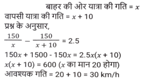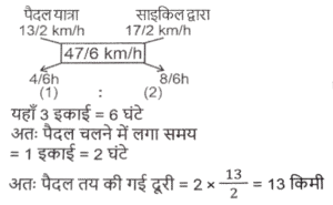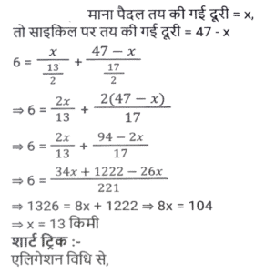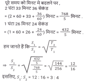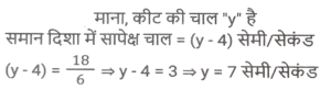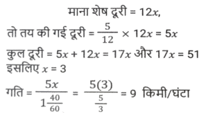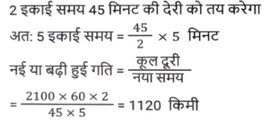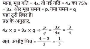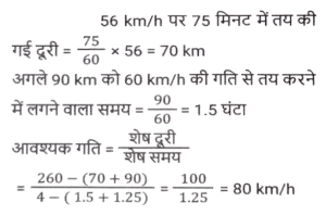 समय ,चाल और दूरी (Part-VII)Total Questions: 5031. एक आदमी ने 6 घंटे में 47 किमी की दूरी तय की। उन्होंने आंशिक रूप से 6½ किमी/घंटा की गति से पैदल यात्रा की और आंशिक रूप से साइकिल पर 8½ किमी/घंटा की गति से यात्रा की। पैदल तय की गई दूरी (कि.मी. में) है: [SSC MTS 11/10/2021 (Afternoon)](a) 13 km(b) 15 km(c) 12 km(d) 16 kmCorrect Answer: (a) 13 kmSolution:32. एक महिला हर दिन घर से अपने कार्यालय जाती है और इसके लिए एक निश्चित समय निर्धारित करती है। एक दिन वह अपनी गति 25% कम कर देती है। वह अपने सामान्य समय के कितने अंश तक उस दिन देर से पहुंचेगी? [SSC MTS 12/10/2021 (Afternoon)](a) 2/3(b) 1/4(c) 1/3(d) 1/6Correct Answer: (c) 1/3Solution:33. सीता और गीता एक ही समय में A से स्थान B तक सवारी करना शुरू करती हैं, जो A से 90 किमी दूर है। सीता गीता की तुलना में 3 किमी प्रति घंटे धीमी गति से यात्रा करती है। गीता स्थान B पर पहुँचती है और तुरंत वापस मुड़कर स्थान B से 15 किमी सीता से मिलती है। सीता की गति (किमी/घंटा में) है: [SSC MTS 13/10/2021 (Morning)](a) 9(b) 6(c) 10.5(d) 7.5Correct Answer: (d) 7.5Solution:34. दो लड़कियां विपरीत दिशाओं में चलती हैं, एक A से B की ओर और दूसरी B से A की ओर। A से लड़की 12 मिनट में गंतव्य पर पहुंचती है। B की लड़की 10 मिनट के लिए रास्ते में रुकती है और 25 मिनट में अपने गंतव्य तक पहुंच जाती है। यदि A की गति 5 किमी/घंटा है, तो B की गति क्या है? [SSC MTS 13/10/2021 (Afternoon)](a) 3 किमी/घंटा(b) 1⁵⁄₇ किमी/घंटा(c) 4 किमी/घंटा(d) 2.4 किमी/घंटाCorrect Answer: (c) 4 किमी/घंटाSolution:35. 51 किमी की दूरी तय करते समय, एक व्यक्ति ने देखा कि एक घंटे 40 मिनट चलने के बाद, उसके द्वारा तय की गई दूरी शेष दूरी की 5/12 थी। उसकी गति क्या थी? [SSC MTS 18/10/2021 (Morning)](a) 7 किमी/घंटा(b) 10 किमी/घंटा(c) 8 किमी/घंटा(d) 9 किमी/घंटाCorrect Answer: (d) 9 किमी/घंटाSolution:36. 18 cm लंबाई का एक केंचुआ एक निश्चित पथ पर 4 cm/सेकेंड की गति से रेंग रहा है। एक कीट 6 सेकेंड में केंचुए से आगे निकल जाता है। कीट कितनी तेजी से (cm/सेकेंड में) चल रहा है? मान लीजिए कि वे दोनों समानांतर रास्तों पर चल रहे हैं। [SSC MTS 20/10/2021 (Evening)](a) 7.0(b) 6.5(c) 5.5(d) 6.0Correct Answer: (a) 7.0Solution:37. एक हवाई जहाज ने निर्धारित समय से 45 मिनट बाद प्रारंभिक बिंदु से उड़ान भरी। गंतव्य प्रारंभिक बिंदु से 2100 किमी दूर था। समय पर पहुंचने के लिए पायलट को अपनी सामान्य गति से गति में 40% की वृद्धि करनी पड़ी। बढ़ी हुई गति (किमी/घंटा में) क्या थी? [SSC MTS 22/10/2021 (Morning)](a) 1870(b) 2520(c) 2940(d) 1120Correct Answer: (d) 1120Solution:38. एक व्यक्ति ने 150 किमी की दूरी तय की और फिर प्रारंभिक बिंदु पर लौट आया। बाहरी यात्रा के लिए लिया गया समय वापसी यात्रा के समय से 2½ घंटे अधिक था। वापसी यात्रा के लिए उसकी गति बाहरी यात्रा की गति से 10 किमी/घंटा अधिक थी। वापसी यात्रा के लिए उसकी गति, किमी/घंटा में थी: [SSC MTS 26/10/2021 (Afternoon)](a) 30(b) 35(c) 25(d) 20Correct Answer: (a) 30Solution:39. एक ट्रक चालक को 4 घंटे में कुल 260 km की दूरी तय करनी होती है। वह पहले 75 मिनट के लिए 56 km/h की गति से और अगले 90 km की गति से 60 km/h की गति से ड्राइव करता है। यात्रा को 4 घंटे में पूरा करने के लिए उसे शेष दूरी 