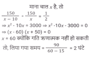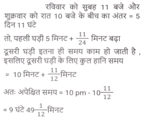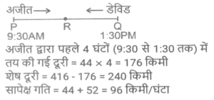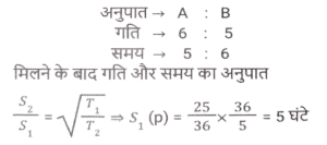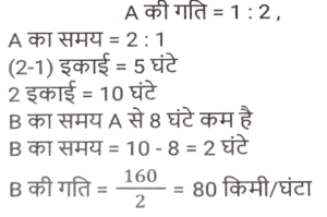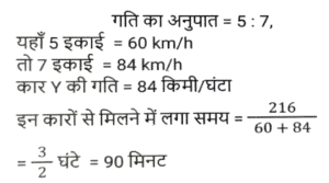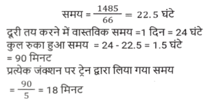समय ,चाल और दूरी (Part-VII)Total Questions: 5041. प्रकाश की गति लगभग 3 × 10¹⁷ नैनोमीटर प्रति सेकंड के बराबर होती है। चंद्रमा से पृथ्वी तक जाने में प्रकाश को लगभग कितना समय (सेकंड में) लगता है, उनके बीच की औसत दूरी 384000 km है? (1 नैनोमीटर = 10⁻⁹ m) [SSC MTS 02/11/2021 (Evening)](a) 38.4(b) 12.8(c) 3.84(d) 1.28Correct Answer: (d) 1.28Solution:42. रविवार को सुबह 11 बजे दो घड़ियां मिलाई जाती हैं। इसके बाद प्रतिदिन क्रमशः उनमें एक मिनट का लाभ और कमी होती है। जब पहली घड़ी अगले शुक्रवार को 10 अपराह्न दिखाएगी, तो दूसरी घड़ी घंटों और मिनटों में कितना समय दर्शाएगी? [SSC MTS 12/10/2021 (Afternoon)](a) 9 घंटे 48³⁄₁₁ मिनट p.m.(b) 9 घंटे 48⁷⁄₁₁ मिनट p.m.(c) 9 घंटे 49¹⁄₁₂ मिनट p.m.(d) 9 घंटे 49⁹⁄₁₁ मिनट p.m.Correct Answer: (c) 9 घंटे 49¹⁄₁₂ मिनट p.m.Solution:43. A, B द्वारा 160 किमी की दूरी तय करने में लिए गए समय से 8 घंटे अधिक लेता है। यदि A अपनी गति को दोगुना कर देता है, तो वह समान दूरी को तय करने में B से 3 घंटे अधिक लेता है। B की गति (किमी/घंटा में) है: [SSC CGL 17/08/2021 (Morning)](a) 72(b) 80(c) 70(d) 75Correct Answer: (b) 80Solution:44. अखिल 150 किमी की दूरी तय करने में 30 मिनट का अतिरिक्त समय लेता है यदि वह अपनी सामान्य गति से 10 किमी/घंटा धीमी गति से ड्राइव करता है। यदि वह अपनी सामान्य गति से 15 किमी प्रति घंटा धीमी गति से चलाता है तो उसे 90 किमी ड्राइव करने में कितना समय लगेगा [SSC CGL 18/08/2021 (Morning)](a) 2 h 15 m(b) 2 h(c) 2 h 45 m(d) 2 h 30 mCorrect Answer: (b) 2 hSolution:45. एक व्यक्ति स्थान A से स्थान B के लिए अपराह्न 2 बजे 4.5 किमी/घंटा की गति से चला, स्थान B पर 1.5 घंटे रुका और 6 किमी/घंटा की गति से स्थान A पर वापस आ गया। वह शाम 7 बजे वापस A स्थान पर आया। स्थानों A और B के बीच की दूरी क्या है? [SSC CHSL 13/4/2021 (Evening)](a) 8⅓(b) 8⅖(c) 9(d) 9⁶⁄₁₁Correct Answer: (c) 9Solution:46. दो कारें X और Y दो स्थानों से 216 किमी की दूरी पर, एक-दूसरे की ओर चलना शुरू करती हैं। X और Y की गति का अनुपात 5:7 है और X की गति 60 किमी/घंटा है। X और Y एक दूसरे से कितने मिनट बाद मिलेंगे ? [SSC CHSL 19/04/2021 (Morning)](a) 75(b) 72(c) 90(d) 80Correct Answer: (c) 90Solution:47. एक ट्रेन 66 किमी/घंटा की गति से यात्रा करती है और एक निश्चित समय के लिए पांच जंक्शनों पर रुकती है। यह एक दिन में 1485 किमी की दूरी तय करती है। ट्रेन प्रत्येक जंक्शन पर कितने समय (मिनटों में) रुकती है, यदि वह सभी जंक्शनों पर समान अवधि के लिए रुकती है? [SSC CHSL 05/08/2021 (Afternoon)](a) 15(b) 18(c) 12(d) 20Correct Answer: (b) 18Solution:48. सुबह की सैर के दौरान, अतुल 8 किमी/घंटा की चाल से 45 मिनट तक चलता है और एक पार्क के 15 चक्कर लगाता है। शेखर उसी पार्क के 10 चक्कर 40 मिनट में लगाता है। किमी/घंटा में शेखर की चाल क्या है ? [SSC CHSL 05/08/2021 (Evening)](a) 7.2(b) 6(c) 6.75(d) 7.5Correct Answer: (b) 6Solution:49. अजीत सिंह स्थान P से सुबह 9:30 बजे स्थान Q के लिए प्रस्थान करता है, और डेविड राज स्थान Q से 1:30 बजे स्थान P के लिए निकलता है। उनके बीच की दूरी 416 किमी है। यदि अजीत सिंह की गति 44 किमी/घंटा है और डेविड राज की गति 52 किमी/घंटा है, तो वे किस समय एक-दूसरे से मिलेंगे? [SSC CHSL 11/08/2021 (Afternoon)](a) 4.30 pm(b) 5 pm(c) 6 pm(d) 4 pmCorrect Answer: (d) 4 pmSolution:50. A और B एक ही दिन में एक ही सम