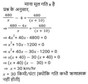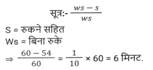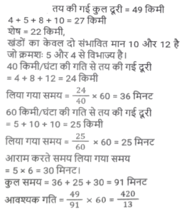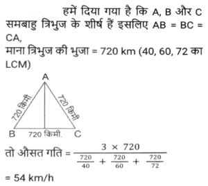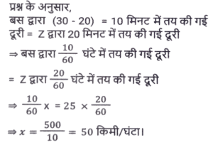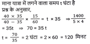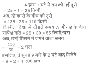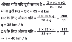 समय ,चाल और दूरीTotal Questions: 5021. एक कार निर्धारित समय से 4 घंटे देरी से निकलती है लेकिन 480 km दूर अपने गंतव्य तक समय पर पहुँचने के लिए उसे अपनी सामान्य चाल को 10 km/hr से बढ़ाना पड़ता है। कार की सामान्य चाल क्या है? [SSC MTS 16/05/2023 (Morning)](a) 40 km/hr(b) 60 km/hr(c) 30 km/hr(d) 50 km/hrCorrect Answer: (c) 30 km/hrSolution:22. विराम के बिना, एक बस की चाल 60 kmph है और विराम सहित उसकी चाल 54 kmph है। बस प्रति घंटा कितने मिनट के लिए रुकती है? [SSC CHSL 20/03/2023 (3rd Shift)](a) 4 मिनट(b) 6 मिनट(c) 7 मिनट(d) 5 मिनटCorrect Answer: (b) 6 मिनटSolution:23. विश्राम सहित एक ट्रेन की चाल 75 km/h है और विश्राम के बिना ट्रेन की चाल 90 kmph है। ट्रेन प्रति घंटा कितने मिनट के लिए रूकती है ? [SSC CHSL 13/03/2023 (3rd Shift)](a) 10 मिनट(b) 15 मिनट(c) 20 मिनट(d) 11 मिनटCorrect Answer: (a) 10 मिनटSolution:24. एक पहिए की त्रिज्या 14 सेमी है। 10 चक्कर में पहिया कितनी दूरी तय करेगा ? [SSC CHSL 09/03/2023 (1st Shift)](a) 910 सेमी(b) 880 सेमी(c) 800 सेमी(d) 820 सेमीCorrect Answer: (b) 880 सेमीSolution:25. दो शहर A और B एक सीधे रास्ते पर 135 km की दूरी पर हैं। एक कार A से 8 am पर चलना शुरू करती है और B की ओर 25 km/h की चाल से चलती है। एक अन्य कार 9 am पर B से चलना शुरू करती है और A की ओर 30km/h की चाल से चलती है। वे किस समय मिलेंगी? [SSC CGL 09/12/2022 (1st Shift)](a) 11 a.m.(b) 10 a.m.(c) 10.45 a.m.(d) 11.30 a.m.Correct Answer: (a) 11 a.m.Solution:26. एक बस, एक बस स्टेशन से प्रत्येक 30 मिनट के बाद उसी दिशा में चलना शुरू करती है। प्रत्येक बस की गति समान है। Z विपरीत दिशा में 25 किमी/घंटा की गति से बाइक चला रहा है। Z प्रत्येक बस से 20 मिनट में मिलता है। प्रत्येक बस की गति क्या है? [SSC MTS 19/07/2022 (Evening)](a) 50 किमी/घंटा(b) 75 किमी/घंटा(c) 30 किमी/घंटा(d) 60 किमी/घंटाCorrect Answer: (a) 50 किमी/घंटाSolution:27. एक व्यक्ति 20 km/h की चाल से P से Q तक जाता है। फिर वह q km/h की चाल से Q से R तक जाता है। अंत में व्यक्ति r km/h की चाल से R से S तक जाता है। P से Q, Q से R और R से S की दूरी बराबर है। यदि P से R की औसत गति 280/11 km/h है और Q से S की औसत गति 112/3 km/h है, तो r का मान क्या है? [SSC MTS 14/07/2022 (Morning)](a) 40(b) 37.5(c) 42.5(d) 45Correct Answer: (a) 40Solution:28. यदि कोई लड़का अपने घर से अपने स्कूल 40 किमी/घंटा की गति से जाता है, तो वह 10 मिनट पहले पहुंच जाता है। यदि वह 35 किमी/घंटा की गति से जाता है, तो वह 5 मिनट देरी से पहुंचता है। 35 किमी/घंटा की गति से यात्रा में लगने वाला समय क्या होगा? [SSC MTS 07/07/2022 (Evening)](a) 125 मिनट(b) 135 मिनट(c) 115 मिनट(d) 120 मिनटCorrect Answer: (d) 120 मिनटSolution:29. तीन शहर, A, B और C इस तरह स्थित हैं कि यदि वे सीधी रेखाओं से जुड़ते हैं तो वे एक समबाहु त्रिभुज के शीर्ष बनाते हैं। राशिद A से B तक 40 km/h की चाल से, B से C तक 60 km/h की चाल से और C से A तक 72 km/h की चाल से यात्रा करता है। पूरी यात्रा के लिए राशिद की औसत चाल (km/h में) ज्ञात कीजिए ? [SSC CHSL 08/06/2022 (Evening)](a) 54(b) 56⅔(c) 55(d) 57⅓Correct Answer: (a) 54Solution:30. एक आदमी को 49 किमी की यात्रा करनी थी, जिसे उसने छह हिस्सों में विभाजित किया जो कि 4 किमी या 5 किमी के सटीक गुणक थे। पहले चार खंड 4 किमी, 5 किमी, 8 किमी और 10 किमी थे। 4 किमी और 5 किमी के गुणकों को क्रमशः 40 और 60 किमी / घंटा की दर से तय किया गया था, और लगाता