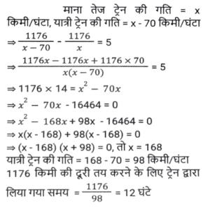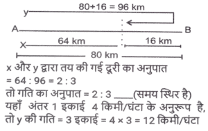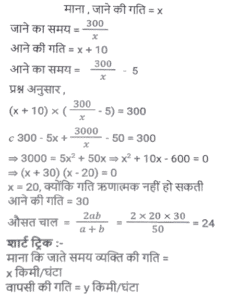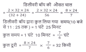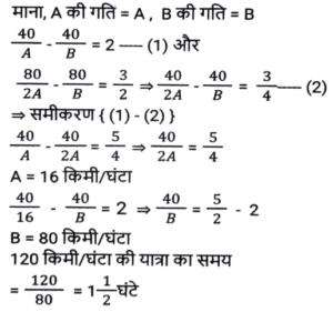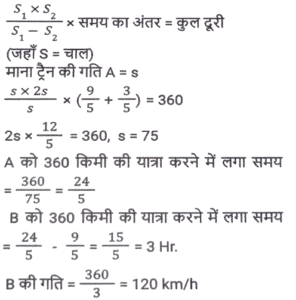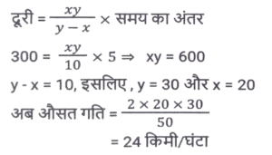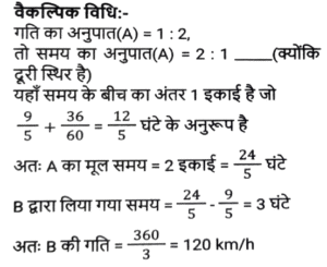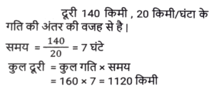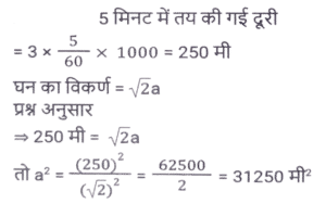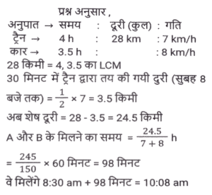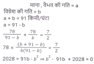 समय ,चाल और दूरीTotal Questions: 5031. 3 किमी/घंटा की गति से चलने वाला एक व्यक्ति 5 मिनट में एक वर्गाकार मैदान को विकर्णतः पार करता है। मैदान का क्षेत्रफल (m² में) क्या है? [SSC CGL 24/08/2021 (Afternoon)](a) 3125(b) 31250(c) 3.125(d) 312.5Correct Answer: (b) 31250Solution:32. 40 किमी की दूरी तय करने में A, B से 2 घंटे अधिक लेता है। यदि A अपनी गति को दोगुना कर देता है, तो वह 80 किमी की दूरी तय करने में B से 1½ घंटे अधिक लेता है। 120 किमी की दूरी तय करने के लिए, B अपनी समान गति से यात्रा करने में कितना समय (घंटों में) लेगा? [SSC CGL 20/08/2021 (Morning)](a) 1⅓(b) 1⅔(c) 1¼(d) 1½Correct Answer: (d) 1½Solution:33. एक ट्रेन सुबह 8 बजे स्टेशन A से निकलती है और दोपहर 12 बजे स्टेशन B पर पहुँचती है। एक कार सुबह 8:30 बजे स्टेशन B से निकलती है और उसी समय स्टेशन A पर पहुँचती है जब ट्रेन स्टेशन B पर पहुँचती है। वे किस समय मिलते हैं? [SSC CGL 16/08/2021 (Afternoon)](a) 9:38 am(b) 10:22 am(c) 10:08 am(d) 9:52 amCorrect Answer: (c) 10:08 amSolution:34. स्थान A से स्थान B तक, जो की स्थान A से 80 km दूर है, जाने के लिए X और Y एक ही समय पर यात्रा शुरू करते है Y की अपेक्षा X, 4 किमी/घंटा धीमी यात्रा करता है। Y, स्थान B पर पहुँच कर वापस आते हुए, स्थान B से 16 किमी दूरी पर X से मिलता है। Y, की चाल ज्ञात करे? [SSC CHSL 04/08/2021 (Evening)](a) 9(b) 15(c) 8(d) 12Correct Answer: (d) 12Solution:35. वैभव और विग्नेश प्रत्येक 78 किमी की दूरी इस प्रकार तय करते हैं कि वैभव की गति विग्नेश की गति से तेज है। उनकी गति का योग 91 किमी प्रति घंटा है और दोनों द्वारा लिया गया कुल समय 3 घंटे 30 मिनट है। वैभव की गति है। [SSC CHSL 15/04/2021 (Evening)](a) 48(b) 45(c) 52(d) 54Correct Answer: (c) 52Solution:36. ट्रेन A, ट्रेन B द्वारा 360 किमी की दूरी तय करने में लिए गए समय से 1⅘ घंटे अधिक लेती है। यदि ट्रेन A की गति दोगुनी हो जाती है, तो ट्रेन B द्वारा समान दूरी तय करने में लिए गए समय से 36 मिनट कम समय लेती है। ट्रेन B की गति क्या है? (किमी प्रति घंटे में) [SSC CHSL 13/04/2021 (Afternoon)](a) 96(b) 100(c) 90(d) 120Correct Answer: (d) 120Solution:37. दो ट्रेनें एक ही समय में दो स्टेशनों से शुरू होती हैं और क्रमशः 90 किमी/घंटा और 70 किमी/घंटा की गति से एक-दूसरे की ओर बढ़ती हैं। जब वे मिलते हैं, तो एक ट्रेन ने दूसरी ट्रेन से 140 किमी अधिक यात्रा कर लेती है। दोनों स्टेशनों के बीच की दूरी क्या है? (किमी में) [SSC CHSL 12/04/2021 (Afternoon)](a) 980(b) 1100(c) 1200(d) 1120Correct Answer: (d) 1120Solution:38. एक व्यक्ति 300 किमी की दूरी तय करता है और फिर शुरुआती बिंदु पर लौटता है। जाने की यात्रा के लिए उसके द्वारा लिया गया समय वापसी की यात्रा के लिए, लिए गए समय से 5 घंटे अधिक है। अगर वह जाने की चाल से 10 किमी/घंटा अधिक की चाल से लौटता है, तो पूरी यात्रा में औसत चाल (किमी / घंटा) क्या है ? [SSC CPO 23/11/2020 (Evening)](a) 24(b) 15(c) 20(d) 30Correct Answer: (a) 24Solution:\39. एक डिलीवरी बॉय सुबह 10 बजे अपने कार्यालय से एक वस्तु पहुँचाने के लिए निकला। उसने अपने स्कूटर को 32 किमी/घंटा की चाल से दौड़ाया। उन्होंने वस्तु को दिया और भुगतान प्राप्त करने के लिए 15 मिनट तक इंतजार किया। भुगतान किए जाने के बाद, वह 24 किमी/घंटा की चाल से यात्रा कर