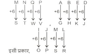 समानता (प्रश्न 100-150) भाग-IIITotal Questions: 5011. एक निश्चित तर्क का अनुसरण करते हुए 35, 1125 से संबंधित है। उसी तर्क का अनुसरण करते हुए 45, 1925 से संबंधित है। समान तर्क का अनुसरण करते हुए 85 निम्नलिखित में से किस से संबंधित है? [SSC Stenographer 11/12/2024 (Morning)](a) 7255(b) 7125(c) 7325(d) 7135Correct Answer: (b) 7125Solution:तर्क:- (पहली संख्या)² - 100 = दूसरी संख्या(35, 1125) :- (35)² - 100 ⇒ 1225 - 100 = 1125(45,1925) :- (45)² - 100 ⇒ 2025 - 100 = 1925(85,7) :- (85)² - 100 ⇒ 7225 - 100 = 712512. उस विकल्प का चयन करें, जो तीसरे शब्द से उसी प्रकार संबंधित है, जैसे दूसरा शब्द पहले शब्द से संबंधित है। [SSC Stenographer 11/12/2024 (Afternoon)]चीनी : मधुमेह :: वसा :_____(a) अनिद्रा(b) मोटापा(c) थाइरोइड(d) तन्द्राCorrect Answer: (b) मोटापाSolution:जिस प्रकार मधुमेह चीनी के कारण होता है उसी प्रकार मोटापा वसा के कारण होता है।13. उस समुच्चय का चयन कीजिए जिसमें संख्याएँ आपस में उसी प्रकार संबंधित हैं जिस प्रकार निम्नलिखित समुच्चय की संख्याएँ आपस में संबंधित है। [SSC Stenographer 11/12/2024 (Afternoon)](13, 41, 89)(4, 14, 26)(a) (9, 29, 63)(b) (12, 38, 80)(c) (11, 31,75)(d) (8, 26, 54)Correct Answer: (d) (8, 26, 54)Solution:तर्क:- (तीसरी संख्या + दूसरी संख्या) ÷ 10 = पहली संख्या(13, 41, 89) : (89 + 41)) ÷ 10⇒ (130) ÷ 10 = 13(4, 14, 26) :- (14+26) ÷ 10 ⇒ (40) ÷ 10 = 4इसी प्रकार,(8, 26, 54) :- (26 + 54) ÷ 10 ⇒(80) ÷ 10 =814. उस युग्म का चयन कीजिए जो एक दूसरे से उसी प्रकार संबंधित है जिस प्रकार नीचे दिए गए युग्म संबंधित हैं [SSC Stenographer 11/12/2024 (Evening)]13 : 6766 : 144(a) 4 : 192(b) 8 : 256(c) 6 : 288(d) 15 : 225Correct Answer: (b) 8 : 256Solution:तर्क :-(पहली संख्या × 2)² = दूसरी संख्या13 : 676 :- (13 × 2)² ⇒ (26)² = 6766 : 144 :- (6 × 2)² ⇒ (12)² = 144इसी प्रकार,8 : 256 :- ( 8 × 2)² ⇒ (16)² = 25615. MNQP अंग्रेजी वर्णानुक्रम के आधार पर एक निश्चित तरीके से STWV से संबंधित है। उसी तरह ABED, GHKJ से संबंधित है। इसी तर्क का पालन करते हुए IJML निम्नलिखित में से किससे संबंधित है? [SSC CHSL Tier II (18/11/2024)](a) PORS(b) ROPS(c) OPRS(d) OPSRCorrect Answer: (d) OPSRSolution:16. 89, किसी निश्चित तर्क का अनुसरण करते हुए, 78 से संबंधित है। 97, उसी तर्क का अनुसरण करते हुए, 86 से संबंधित है। उसी तर्क का अनुसरण करते हुए, 72, निम्नलिखित में से किससे संबंधित है? [SSC CHSL Tier II (18/11/2024)](a) 66(b) 59(c) 61(d) 68Correct Answer: (c) 61Solution:तर्क:-(पहली संख्या - दूसरी संख्या) = 11(89 - 78) :- (89 - 78)) = 11(97 - 86) :- (97 - 86)) = 11इसी प्रकार,(72 - 61) :- (72 - 61)) = 1117. निम्नलिखित में से कौन-सा अक्षर-समूह # और % के स्थान पर आना चाहिए ताकि :: के बाएँ ओर के अक्षर- समूह युग्म के बीच जिस पैटर्न और संबंध का अनुसरण किया गया है, उसी पैटर्न और संबंध का अनुसरण :: के दाएँ ओर के अक्षर-समूह युग्म में किया जाता हो? [SSC CHSL Tier II (18/11/2024)]#: VXB:: ACG: %(a) # - GIM, % - KMQ(b) #UVN, % - KMQ(c) # - HDN, % - BDH(d) # - UWA, % - BDHCorrect Answer: (d) # - UWA, % - BDHSolution:18. उस सेट का चयन कीजिए, जिसमें संख्याएं ठीक उसी प्रकार संबंधित हैं, जिस प्रकार निम्नलिखित सेटों की संख्याएं संबंधित हैं। [SSC CHSL Tier II (18/11/2024)](7, 11, 33)(14, 18, 54)(a) (16, 20, 40)(b) (5, 9, 36)(c) (12, 16, 48)(d) (18, 21, 63)Correct Answer: (c) (12, 16, 48)Solution:तर्क:-(दूसरी संख्या) / (-पहली संख्या + तीसरी संख्या + 4)(11) = (7 + 33 + 4)/4 = 44/4(18) = (14 + 54 + 4)/4 = 72/4इसी प्रकार,(16) = (12 + 48 + 4)/4 = 64/419. उस सेट का चयन कीजिए, जिसमें संख्याएं ठीक उसी प्रकार संबंधित हैं, जिस प्रकार निम्नलिखित सेटों की स