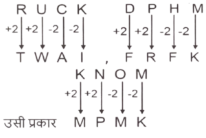 समानता (प्रश्न 201-250) भाग-VTotal Questions: 5011. BIRTHDAY - IBTRDHYA [SSC CGL 19/09/2024 (1st Shift)]BLAZER-LBZAREREMOVE - ?पदों के पहले दो युग्मों के लिए लागू किए गए तर्क का उपयोग करते हुए, उस पद का चयन करें जो तीसरे युग्म में प्रश्न चिह्न (?) को प्रतिस्थापित कर सकता है।(a) ERMOVE(b) EROMVE(c) EROMEV(d) EVOMERCorrect Answer: (c) EROMEVSolution:12. अँग्रेजी वर्णमाला-क्रम के आधार पर 'RUCK' एक निश्चित तरीके से 'TWAI' से संबंधित है। उसी तरह 'DPHM' का संबंध 'FRFK' से है। उसी तर्क के अनुसार 'KNOM' का संबंध निम्नलिखित में से किससे है? [SSC CGL 19/09/2024 (1st Shift)](a) IQNK(b) MQNJ(c) MPMK(d) IPMJCorrect Answer: (c) MPMKSolution:13. उस शब्द-युग्म का चयन करें, जो नीचे दिए गए शब्दों के युग्म में व्यक्त किए गए संबंध के समान संबंधों का सबसे बेहतर ढंग से प्रतिनिधित्व करता है। [SSC CGL 19/09/2024 (2nd Shift)]New Zealand: Wellington (न्यूजीलैंड : वेलिंगटन)(a) Egypt : Tunis (मिस्र : ट्यूनिस)(b) South Korea : Suwon Si (दक्षिण कोरिया : सुवन सी)(c) China : Hong Kong (चीन : हांगकांग)(d) Ethiopia : Addis Ababa (इथियोपिया : अदीस अबाबा)Correct Answer: (d) Ethiopia : Addis Ababa (इथियोपिया : अदीस अबाबा)Solution:न्यूजीलैंड की राजधानी वेलिंगटन है इसी प्रकार इथियोपिया की राजधानी अदीस अबाबा है।14. एक निश्चित तर्क का अनुसरण करते हुए 97 का संबंध 49 से है। उसी तर्क का अनुसरण करते हुए, 115 का संबंध 58 से है। उसी तर्क का अनुसरण करते हुए, 133 का संबंध निम्नलिखित में से किससे है? [SSC CGL 19/09/2024 (2nd Shift)](a) 82(b) 64(c) 67(d) 89Correct Answer: (c) 67Solution:तर्कः (पहली संख्या +1) ÷ 2 = दूसरी संख्या(97, 49) :- (97 + 1) + 2 = 98 ÷ 2 = 49(115,58) :- (115+1) ÷ 2 = 116 ÷ 2 = 58इसी प्रकार(133, x) :- (133 + 1) + 2 = 134 ÷ 2 = 6715. एक निश्चित तर्क का अनुसरण करते हुए 13 का संबंध 119 से है। उसी तर्क का अनुसरण करते हुए, 9 का संबंध 31 से है। उसी तर्क का अनुसरण करते हुए, 8 का संबंध निम्नलिखित में से किससे है? [SSC CGL 19/09/2024 (2nd Shift)](a) 14(b) 10(c) 27(d) 24Correct Answer: (a) 14Solution:तर्कः (पहली संख्या)² - 50 = दूसरी संख्या(13, 119) :- 13² - 50 = 169 - 50 = 119(9,31) :- 9² - 50 = 81 - 50 = 31इसी प्रकार(8, x) :- 8² - 50 = 64 - 50 = 1416. उस त्रिक का चयन करें जिसमें दी गई संख्याएं एक दूसरे से उसी प्रकार संबंधित हैं, जिस प्रकार निम्नलिखित त्रिकों की संख्याएं एक-दूसरे से संबंधित हैं। [SSC CGL 19/09/2024 (3rd Shift)]4-5-412-3-13(a) 10-11-211(b) 7-8-110(c) 5-6-61(d) 12-13-213Correct Answer: (c) 5-6-61Solution:तर्क:- (पहली संख्या × दूसरी संख्या ) × 2 + 1 = तीसरी संख्या(4 - 5 - 41) :- (4 × 5) × 2 + 1 ⇒ 40 + 1 = 41(2 - 3 - 13 ) :- (2 × 3) × 2 + 1 ⇒ 12 + 1 = 13इसी प्रकार(5 - 6 - 61 ) :- (5 × 6) × 2 + 1 ⇒ 60 + 1 = 6117. उस शब्द-युग्म का चयन करें जो नीचे दिए गए शब्द-युग्म में व्यक्त किए गए समान संबंध का सबसे अच्छा निरूपण करता है। [SSC CGL 19/09/2024 (3rd Shift)]लार्वा : कीट(a) कुत्ता : पशु(b) लोमड़ी : मादा लोमड़ी(c) मृगशावक : हिरन(d) चमगादड़ : चूजाCorrect Answer: (c) मृगशावक : हिरनSolution:जैसे "Larva", "Insect" के बच्चे हैंउसी प्रकार "Fawn", "Deer" के बच्चे हैं।18. 12 एक निश्चित तर्क का अनुसरण करते हुए 235 से संबंधित है। इसी तर्क का अनुसरण करते हुए 14, 287 से संबंधित है। समान तर्क का अनुसरण करते हुए, 18 निम्नलिखित में से किससे संबंधित है? [SSC CGL 23/09/2024 (1st Shift)](a) 512(b) 320(c) 415(d) 438Correct Answer: (c) 415Solution:तर्क :- (पहली संख्या) 2 + 91 = दूसरी संख्या(12, 236) :- (12)² + 91 ⇒ 144 + 91 = 235(14, 287) :- (14)² + 91 ⇒ 196 + 91 = 287इसी 