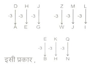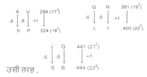 समानता (प्रश्न 451-500) भाग-XTotal Questions: 5011. RN 12, PL 16 से एक निश्चित प्रकार से संबंधित है। उसी प्रकार, EJ 17, CH 21 से संबंधित है। समान तर्क का अनुसरण करते हुए FL 15 निम्नलिखित में से किससे संबंधित है? [SSC MTS 14/09/2023 (1st Shift)](a) DJ 19(b) HN 18(c) CI 20(d) DK 19Correct Answer: (a) DJ 19Solution:12. अंग्रेजी वर्णमाला क्रम के आधार पर DHJ, AEG से एक निश्चित प्रकार से संबंधित है। उसी प्रकार, ZML, WJI से संबंधित है। समान तर्क का अनुसरण करते हुए, EKQ निम्नलिखित में से किससे संबंधित है? [SSC CHSL 02/08/2023 (1st Shift)](a) HNT(b) DJK(c) BHN(d) QKECorrect Answer: (c) BHNSolution:13. उस समुच्चय को चुनिए जिसमें संख्याएँ ठीक उसी प्रकार संबंधित है जिस प्रकार निम्नलिखित समुच्चयों की संख्याएँ संबंधित हैं। [SSC CHSL 02/08/2023 (1st Shift)](12, 11, 137)(17, 21, 362)(a) (18, 9, 165)(b) (14, 31, 440)(c) (21, 25, 530)(d) (38, 7, 270)Correct Answer: (c) (21, 25, 530)Solution:तर्कः (पहली संख्या × दूसरी संख्या) + 5 = तीसरी संख्या(12, 11, 137) :- (12 × 11) + 5 ⇒ 132 + 5 = 137(17, 21, 362) :- (17 × 21) + 5 ⇒ 357 + 5 = 362इसी प्रकार,(21, 25, 530) :- (21 × 25) + 5 ⇒ 525 + 5 = 53014. अंग्रेजी वर्णमाला क्रम के आधार पर XU289, SP324 से एक निश्चित प्रकार से संबंधित है। उसी प्रकार, QN361, L1400 से संबंधित है। समान तर्क का अनुसरण करते हुए, JG441 निम्नलिखित में से किससे संबंधित है? [SSC CHSL 02/08/2023 (2nd Shift)](a) EB484(b) FB464(c) FB484(d) EB464Correct Answer: (a) EB484Solution:15. निम्नलिखित संख्या- युग्मों में, पहली संख्या पर कुछ गणितीय संक्रियाएँ करके दूसरी संख्या प्राप्त की जाती है। उस विकल्प का चयन कीजिए जिसमें संख्याएँ उसी प्रकार संबंधित हैं जैसे निम्नलिखित युग्मों की संख्याएँ संबंधित हैं। [SSC CHSL 02/08/2023 (2nd Shift)](9, 56)(17, 104)(a) 11, 83(b) 8, 51(c) 12, 69(d) 15, 92Correct Answer: (d) 15, 92Solution:तर्क :- (पहली संख्या × 6) + 2(9, 56) :- (9 × 6) + 2 :- 54 + 2 = 56(17, 104) :- (17 × 6) + 2 :- (102) + 2 = 104इसी प्रकार,(15, 92) :- (15 × 6) + 2 :- (90) + 2 = 9216. उस विकल्प का चयन कीजिए, जो तीसरे पद से ठीक उसी प्रकार संबंधित है जैसे दूसरा पद पहले पद से संबंधित है और छठा पद पांचवें पद से संबंधित है। [SSC CHSL 02/08/2023 (2nd Shift)]4 : 128 :: 5 : ? :: 7 : 686(a) 225(b) 240(c) 255(d) 250Correct Answer: (c) 255Solution:तर्क :- (पहली संख्या) 3 × 2 = (दूसरी संख्या)4 : 128 :- (4)³ × 2 ⇒ (64) × 2= 1287 : 686 :- (7)³ × 2 ⇒ (343) × 2= 686इसी प्रकार,5 : ? :- (5)³ × 2 ⇒ (125) × 2 = 25017. अंग्रेजी वर्णमाला क्रम के आधार पर MASTER, OAIHWJ से एक निश्चित प्रकार से संबंधित है। उसी प्रकार, ROSE, JMIW से संबंधित है। समान तर्क का अनुसरण करते हुए PLEASE निम्नलिखित में से किससे संबंधित है? [SSC CHSL 02/08/2023 (3rd Shift)](a) LPWZIW(b) LPWAJW(c) LQWAIW(d) LPWAIWCorrect Answer: (b) LPWAJWSolution:18. अंग्रेजी वर्णमाला क्रम में दिए गए अक्षरों के बिच एक निश्चित संबंध के आधार पर HJLI, OQSP से संबंधित है। उसी प्रकार, BDFC, IKMJ से संबंधित है। समान तर्क का प्रयोग करते हुए NPRO निम्नलिखित में से किससे संबंधित है? [SSC CHSL 02/08/2023 (3rd Shift)](a) UWYV(b) VWZX(c) UXYV(d) TVYUCorrect Answer: (d) TVYUSolution:19. एक निश्चित तर्क के अनुसार 20, 30 से संबंधित है। इसी तर्क का अनुसरण करते हुए, 42 का संबंध 56 से है। समान तर्क का अनुसरण करते हुए 72 निम्नलिखित में से किससे संबंधित है? [SSC CHSL 02/08/2023 (4th Shift)](a) 94(b) 92(c) 88(d) 90Correct Answer: (d) 90Solution:तर्क : जोड़े की दोनों संख्याएँ किसी न किसी प्राकृतिक संख्या की निरंतर गुणज हैं।20 और 30 में : 10 × 2 = 20, 
