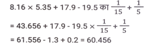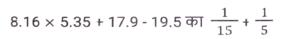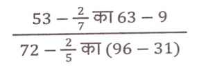 सरलीकरण (भाग-III)Total Questions: 501. इसका मान ज्ञात करें। [SSC CPO 29/06/2024 (2nd Shift)](a) -450000(b) 45000(c) 450000(d) -45000Correct Answer: (a) -450000Solution:2. यदि 5x+3y / 5x -3y = 7/3 है, तो x : y का मान ज्ञात कीजिए। [SSC CPO 29/06/2024 (2nd Shift)](a) 5 : 3(b) 3 : 2(c) 3 : 5(d) 2 : 3Correct Answer: (b) 3 : 2Solution:3. इसका मान क्या है ? [SSC CPO 29/06/2024 (2nd Shift)](a) 11/20(b) 11/30(c) 21/20(d) 7/40Correct Answer: (a) 11/20Solution:4. दिए गए व्यंजक को सरल कीजिए। [SSC CPO 29/06/2024 (2nd Shift)]12.3 - [7 + 0.8 का (5.6 - 3.8 × 1.03)](a) 5.2314(b) 7.8539(c) 1.2368(d) 3.9512Correct Answer: (d) 3.9512Solution:5. x का मान कितना होगा ? [SSC CPO 29/06/2024 (2nd Shift)](a) 7/9(b) 1/7(c) 3/7(d) 2/9Correct Answer: (d) 2/9Solution:6. दिए गए व्यंजक को सरल कीजिए। [SSC CPO 29/06/2024 (3rd Shift)](a) 25(b) 35(c) 20(d) 15Correct Answer: (c) 20Solution:7. निम्नलिखित को सरल कीजिए। [SSC CPO 29/06/2024 (3rd Shift)](a) 57.426(b) 60.456(c) 65.234(d) 70.225Correct Answer: (b) 60.456Solution:8. दिए गए व्यंजक को सरल कीजिए। [SSC CPO 29/06/2024 (3rd Shift)](a) 26/23(b) 11/23(c) 13/23(d) 7/23Correct Answer: (c) 13/23Solution:9. सरलीकृत करें: 25³ - 75³ + 50³ [Higher Secondary 20/06/2024 (Shift-2)](d) -281250(a) 271250(b) -281450(c) 281350Correct Answer: (d) -281250Solution:10. निम्नलिखित व्यंजक को सरल कीजिए: [Higher Secondary 26/06/2024 (Shift-2)](0.2)³ + (0.3)³ + (0.5)³ + 3 × 0.5 × 0.7 × 0.8(a) 0.001(b) 1.525(c) 1.000(d) 0.005Correct Answer: (c) 1.000Solution:Submit Quiz12345Next »