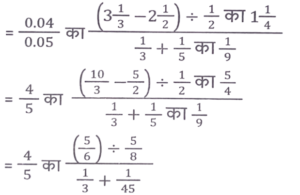 सरलीकरण (भाग-III)Total Questions: 5011. निम्नलिखित व्यंजक को सरल कीजिए : [Graduate Level 20/06/2024 (Shift-3)](a) 0.9(b) 0.7(c) 0.3(d) 0.4Correct Answer: (a) 0.9Solution:12. निम्नलिखित व्यंजक को सरल कीजिए: [Graduate Level 21/06/2024 (Shift-3)](a) 6(b) 4(c) 2(d) 8Correct Answer: (d) 8Solution:13. दिए गए व्यंजक को सरल कीजिए। [Graduate Level 21/06/2024 (Shift-3)](a) 14.5(b) 20.9(c) 17.6(d) 21.9Correct Answer: (d) 21.9Solution:14. दिए गए व्यंजक को सरल कीजिए। [Graduate Level 24/06/2024 (Shift-3)](a) 36(b) 30(c) 32(d) 34Correct Answer: (c) 32Solution:15. निम्नलिखित व्यंजक को सरल कीजिए: [Graduate Level 25/06/2024 (Shift-3)]15 × 15 × 15 + 3 × 15 × 12 × 12 - 3 × 15 × 15 × 12 - 12 × 12 × 12(d) 27(b) 9(c) 18(d) 27Correct Answer: (d) 27Solution:16. निम्नलिखित व्यंजक को सरल कीजिए: [Graduate Level 26/06/2024 (Shift-4)](a) 2(b) 1(c) -2(d) -1Correct Answer: (b) 1Solution:17. मान ज्ञात कीजिए। [SSC CHSL Tier II (02/11/2023)](a) 8³ × 10⁻⁸(b) 8³ × 10⁻⁹(c) 8⁴ × 10⁻⁹(d) 8⁴ × 10⁻⁸Correct Answer: (c) 8⁴ × 10⁻⁹Solution:18. मान ज्ञात कीजिए। [SSC CHSL Tier II (10/01/2024)](a) 56(b) 42(c) ∛42(d) 42³Correct Answer: (b) 42Solution:19. निम्नलिखित का मान ज्ञात कीजिए। [SSC CGL Tier II (26/10/2023)](a) 31/66(b) 31/44(c) 33/64(d) 33/31Correct Answer: (a) 31/66Solution:20. मान ज्ञात कीजिए। [SSC CPO 03/10/2023 (1st Shift)](a) 5(b) 0.3(c) 3(d) 0.03Correct Answer: (c) 3Solution:Submit Quiz« Previous12345Next »