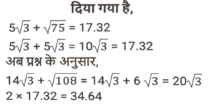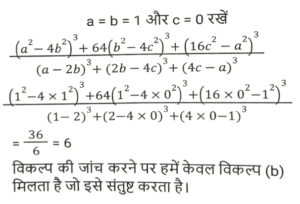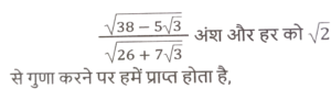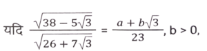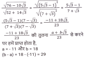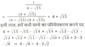 सरलीकरण (भाग-IV)Total Questions: 3521. इसका मान बराबर हैं : [SSC CHSL 03/06/2022 (Evening)](a)(b)(c)(d)Correct Answer: (d)Solution:22. मान ज्ञात कीजिए। [SSC CHSL 06/06/2022 (Evening)](a) √6(b) 2√3(c) 2√2(d) 6Correct Answer: (a) √6Solution:23. सरल कीजिए : [SSC CHSL 09/06/2022 (Afternoon)](a) 1/6(b) 1/2(c) 1/3(d) 1/4Correct Answer: (b) 1/2Solution:24. सरल करें : (a⁻¹ + b⁻¹) ÷ (a⁻³ + b⁻³) [SSC CHSL 09/06/2022 (Evening)](a)(b)(c)(d)Correct Answer: (d)Solution:25. निम्नलिखित व्यंजक को सरल कीजिए : [SSC CGL 11/04/2022 (Afternoon)](a) -(a - 2b) (b + 2c) (4c + a)(b) 2(a + 2b) (b + 2c) (4c + a)(c) (a + 2b) (b +2c) (4c + a)(d) 4(a + 2b) (b + 2c) (4c + a)Correct Answer: (b) 2(a + 2b) (b + 2c) (4c + a)Solution:26. यदि 5√3 + √75 = 17.32 , है, तो 14√3 + √108 का मान ज्ञात करे। [SSC CGL 200/04/2022 (Evening)](a) 32.46(b) 35.64(c) 34.64(d) 33.86Correct Answer: (c) 34.64Solution:27. यदि 847 × 385 × 675 × 3025 = 3ᵃ × 5ᵇ × 7ᶜ × 11ᵈ, तो ab - cd का मान क्या है? [SSC CGL Tier II (29/01/2022)](a) 5(b) 1(c) 4(d) 7Correct Answer: (a) 5Solution:28. इसका मान क्या है ? [SSC CGL Tier II (29/01/2022)](a) 4 - 2√2(b) 2 + 2√2(c) 4 + 2√2(d) 2 - 2√2Correct Answer: (a) 4 - 2√2Solution:29. (b - a) का मान क्या है ? [SSC CGL Tier II (03/02/2022) ] (a) 7(b) 18(c) 29(d) 11Correct Answer: (c) 29Solution:30. इसका सरलीकृत मान क्या है ? [SSC MTS 20/10/2021 (Afternoon)](a) -4(b) 1(c) 3(d) -2Correct Answer: (a) -4Solution:Submit Quiz« Previous1234Next »
