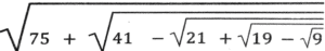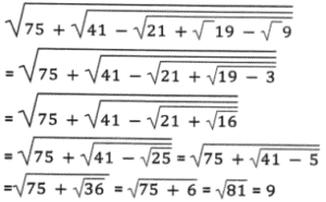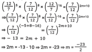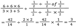सरलीकरणTotal Questions: 5011. निम्न भिन्न संख्याओं को आरोही क्रम में व्यवस्थित कीजिए। [Group D 24/08/2022 (Afternoon)]1/3, 4/7, 2/5, 5/6, 3/5(a) 1/3, 2/5, 4/7, 3/5, 5/6(b) 2/5, 1/3, 3/5, 4/7, 5/6(c) 5/6, 1/3, 4/7, 2/5, 3/5(d) 1/3, 2/5, 3/5, 4/7, 5/6Correct Answer: (a) 1/3, 2/5, 4/7, 3/5, 5/6Solution:1/3 , 4/7 , 2/5 , 5/6 , 3/5= 0.33 , 0.57 , 0.4 , 0.83 , 0.6आरोही क्रम में, 0.33 , 0.4 , 0.57 , 0.6 , 0.83⇒ 1/3 , 2/5 , 4/7 , 3/5 , 5/612. यदि (a + 1/a) = k है, तो (a² – 1/a²) का मान ज्ञात कीजिए। [Group D 24/08/2022 (Afternoon)](a) k – 2k² (b) k² + 2 (c) k + 2 (d) 2k – k²Correct Answer: (d) 2k – k²Solution:(a + 1)/a = k , a = 2, 3 …… रखने पर ; k = 3/2फिर विकल्प के द्वारा हल करने पर,(a² − 1)/a² = 2k − k²13. मान ज्ञात कीजिए। [Group D 25/08/2022 (Afternoon)](a) 7/33 (b) 9/44 (c) 17/66 (d) 13/55Correct Answer: (d) 13/55Solution:14. सरल कीजिएः [Group D 25/08/2022 (Evening)](a + 2b - c)(b - c) + (a - c)2b + b²(a) 3ab - 5bc - ac - 2abc(b) 2b² + 3ab - 4bc + c(c) 3b² + c² + 3ab - 5bc - ac(d) 3b² + 3ab - 5bc - acCorrect Answer: (c) 3b² + c² + 3ab - 5bc - acSolution:(a + 2b − c)(b − c) + (a − c)2b + b²= ab + 2b² − bc − ac − 2bc + c² + 2ab − 2bc + b²= 3b² + c² + 3ab − 5bc − ac15. एक भिन्न का अंश हर से एक कम है। यदि अंश में 6 जोड़ दिया जाए, तो भिन्न 5/4 के बराबर हो जाएगी। भिन्न ज्ञात कीजिए। [Group D 30/08/2022 (Morning)](a) 20/21 (b) 19/20(c) 20/21 (d) -(21/20)Correct Answer: (b) 19/20Solution:माना हर x है, अंश (x − 1) है(x − 1 + 6)/x = 5/4 ⇒ 4x + 20 = 5x⇒ 5x − 4x = 20 ⇒ x = 20 आवश्यक अंश = 19/2016. एक व्यक्ति अपने बगीचे में 21,025 आम के पेड़ इस प्रकार लगाता है, कि पंक्तियों की संख्या, प्रत्येक पंक्ति में पेड़ों की संख्या के बराबर है। पंक्तियों की संख्या ज्ञात कीजिए। [Group D 30/08/2022 (Afternoon)](a) 130 (b) 135 (c) 145(d) 125Correct Answer: (c) 145Solution:पंक्तियों की संख्या = √21025 = 14517. (a¹⁰ × b⁻⁷ × c⁻⁴) / (a⁻⁵ × b² × c⁵) का सरलीकृत रूप क्या है? [Group D 30/08/2022 (Evening)](a) a¹⁵ × b⁹ × c⁹(b) a⁵ × b⁻⁹ × c⁻⁹(c) a⁵ × b⁹ × c⁻⁹(d) a¹⁵ × b⁻⁹ × c⁻⁹Correct Answer: (d) a¹⁵ × b⁻⁹ × c⁻⁹Solution:(a¹⁰ × b⁻⁷ × c⁻⁴) / (a⁻⁵ × b² × c⁵)= a^(10 − (−5)) × b^(−7 − 2) × c^(−4 − 5)= a¹⁵ × b⁻⁹ × c⁻⁹18. का मान ज्ञात कीजिए। [Group D 02/09/2022 (Afternoon)](a) 9 (b) 3 (c) 6 (d) 5Correct Answer: (a) 9 Solution:19. यदि (12/7)⁵ × (7/12)⁸ × (12/7)¹⁶ = (7/12)²ᵐ⁺¹⁰, तो m = ? [Group D 08/09/2022 (Afternoon)](a) -1 (b) 23/2 (c) 19/2 (d) -23/2Correct Answer: (d) -23/2Solution:20. (6 + 6 × 6) / (3 × 3 + 5) ÷ (½ ÷ ½ of ½) / (½ ÷ ½ × ½) को सरल कीजिए। [Group D 14/09/2022 (Morning)](a) 1/3 (b) 4/3 (c) 3 (d) 3/4Correct Answer: (d) 3/4Solution:Submit Quiz« Previous12345Next »