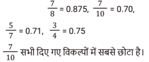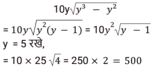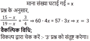 सरलीकरण Part-11Total Questions: 5011. यदि y = 5 है, तो 10y √y³ – y² का मान क्या होगा ? [RRB NTPC 22/02/2021 (Morning)](a) 500 (b) 50√2 (c) 100 (d) 200√5Correct Answer: (a) 500 Solution:12. भिन्न 15/19 के अंश और हर दोनों में से कौन-सी संख्या घटाई जाए जिससे वह 3/4 हो जाए ? [RRB NTPC 22/02/2021 (Morning)](a) 6 (b) 3(c) 9 (d) 5Correct Answer: (b) 3Solution:13. आप 3.33 घंटे को घंटे, मिनट और सेकंड में कैसे लिखेंगे ? [RRB NTPC 22/02/2021 (Evening)](a) 3 घंटे, 19 मिनट, 48 सेकंड(b) 3 घंटे, 30 मिनट, 3 सेकंड(c) 3 घंटे, 33 मिनट(d) 3 घंटे, 30 मिनट, 30 सेकंडCorrect Answer: (a) 3 घंटे, 19 मिनट, 48 सेकंडSolution:14. मान ज्ञात कीजिये ? [RRB NTPC 22/02/2021 (Evening)](a) 32 (b) 28 (c) 30(d) 26Correct Answer: (c) 30Solution:15. निम्नलिखित को हल कीजिये [RRB NTPC 22/02/2021 (Evening) ](a)(b)(c)(d)Correct Answer: (b)Solution:16. यदि x¹¹ = y⁰ और x = 2y तो y का मान क्या है ? [RRB NTPC 22/02/2021 (Evening)](a) 1 (b) -1 (c) -2 (d) ½Correct Answer: (d) ½Solution:17. निम्नलिखित में से कौन-सी भिन्न सबसे छोटी है ? [RRB NTPC 23/02/2021 (Morning)](a) 7/8 (b) 10/7(c) 5/7 (d) 3/4Correct Answer: (b) 10/7Solution:18. यदि √x + 10 = √529 तो x का मान ज्ञात कीजिये ? [RRB NTPC 23/02/2021 (Morning)](a) 166 (b) 169(c) 168 (d) 167Correct Answer: (b) 169Solution:19. मान ज्ञात कीजिये ? [RRB NTPC 23/02/2021 (Morning)](a) 2 (b) 47 (c) 1 (d) 74Correct Answer: (a) 2 Solution:20. मान ज्ञात कीजिये ? [RRB NTPC 23/02/2021 (Morning)](a)(b)(c)(d)Correct Answer: (c)Solution:Submit Quiz« Previous12345Next »