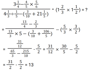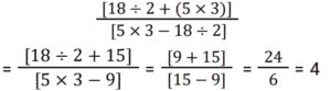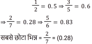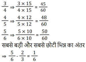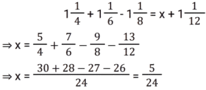 सरलीकरण Part-14Total Questions: 5021. (54.542² − 45.458²) / (61.738 − 52.654) का मान है: [RRB NTPC 31/07/2021 (Evening)](a) 100 (b) 35.084 (c) 32.458 (d) 67.542Correct Answer: (a) 100 Solution:22. यदि √40 लगभग 6.325 के बराबर है, तो √(8/5) लगभग बराबर है: [RRB NTPC 31/07/2021 (Evening)](a) 1.625 (b) 2.825 (c) 0.565 (d) 1.265Correct Answer: (d) 1.265Solution:23. निम्नलिखित को हल करें। [ RRB NTPC 31/07/2021 (Evening) ](a)(b)(c)(d)Correct Answer: (b)Solution:24. ⅔, ¾, ⁴⁄₅ और ⁵⁄₆ में से सबसे बड़ी और सबसे छोटी भिन्न का अंतर ज्ञात कीजिए। [RRB JE 22/05/2019 (Afternoon)](a) 3/5 (b) 1/6 (c) 2/6(d) 2/5Correct Answer: (c) 2/6Solution:25. निम्नलिखित में से सबसे छोटे भिन्न को ज्ञात कीजिए। [ RRB JE 22/05/2019 (Afternoon) ]1/2, 3/5, 2/7, 5/6(a) 1/3 (b) 1/5 (c) 2/6 (d) 1/6Correct Answer: (a) 1/3 Solution:26. * के स्थान पर क्या होगा? [ RRB JE 22/05/2019 (Evening) ](a) 5/12 (b) 7/12 (c) 5/24(d) 7/24Correct Answer: (c) 5/24Solution:27. निम्नलिखित भिन्नों को अवरोही क्रम में व्यवस्थित कीजिए। [RRB JE 22/05/2019 (Evening)]5/6, 3/7, 8/9, 3/14(a) 8/9, 5/6, 3/7, 3/14 (b) 5/6, 8/9, 3/7, 3/14(c) 8/9, 5/6, 3/14, 3/7 (d) 8/9, 3/14, 5/7, 3/6Correct Answer: (a) 8/9, 5/6, 3/7, 3/14 Solution:28. सरल करें: √176 + √2401 [ RRB JE 22/05/2019 (Evening) ](a) 15(b) 25(c) 14(d) 18Correct Answer: (a) 15Solution:29. यदि 3/11 < x/3 < 7/11 है, तो निम्नलिखित में से कौन सा ‘x’ का मान हो सकता है? [RRB JE 23/05/2019 (Morning)](a) 2 (b) 0.5 (c) 3 (d) 1Correct Answer: (d) 1Solution:30. सरल कीजिए: [RRB JE 23/05/2019 (Evening)][18 ÷ 2 + (5 × 3)] / [5 × 3 − 18 ÷ 2](a) 5/6 (b) 12/5 (c) 14/6 (d) 4Correct Answer: (d) 4Solution:Submit Quiz« Previous12345Next »
