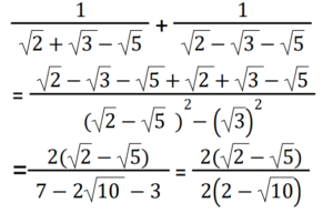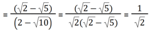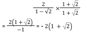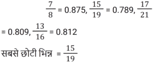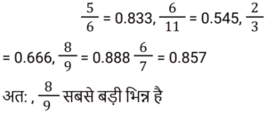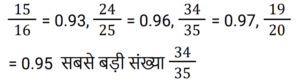 सरलीकरण Part-14Total Questions: 5041. सरल कीजिए: [ RRB JE 01/06/2019 (Evening) ]2 / (1 − √2)(a) −(2 + √2) (b) 2 + √2 (c) −2(1 + √2)(d) 1 − 2√2Correct Answer: (c) −2(1 + √2)Solution:42. निम्नलिखित में से सबसे बड़ी भिन्न को ज्ञात कीजिए [ RRB JE 01/06/2019 (Evening) ]5/6, 6/11, 2/3, 8/9, 6/7(a) 2/3 (b) 5/6 (c) 8/9(d) 6/7Correct Answer: (c) 8/9Solution:43. मान ज्ञात करें। [RRB JE 02/06/2019 (Morning)](a) 1 (b) √2 (c) 1/√2(d) 1/2Correct Answer: (c) 1/√2Solution:44. सरल करें: [ RRB JE 02/06/2019 (Morning) ](a) 43/18 (b) 17/9 (c) 13/6(d) 35/18Correct Answer: (c) 13/6Solution:45. सरल करें: [ RRB JE 02/06/2019 (Morning) ](a)(b)(c)(d)Correct Answer: (c)Solution:46. सरल करें: [ RRB JE 02/06/2019 (Afternoon) ](a) 18(b) 12(c) 20(d) 24Correct Answer: (b) 12Solution:47. निम्नलिखित में से कौन सा सबसे बड़ा है? [RRB JE 02/06/2019 (Afternoon)](a) 15/16 (b) 24/25 (c) 34/35(d) 19/20Correct Answer: (c) 34/35Solution:48. यदि 0.034 = x/10 हो, तो ‘x’ का मान ज्ञात कीजिए। [RRB JE 02/06/2019 (Afternoon)](a) 340 (b) 34 (c) 3.4(d) 4Correct Answer: (c) 3.4Solution:49. सबसे छोटी भिन्न ज्ञात करें। [RRB JE 02/06/2019 (Evening)](a) 7/8 (b) 15/19 (c) 17/21(d) 13/16Correct Answer: (c) 17/21Solution:50. हल कीजिए: [ RRB JE 02/06/2019 (Evening) ](a) 3/4 (b) 2√3 (c) 4/3(d) 4/√3Correct Answer: (c) 4/3Solution:Submit Quiz« Previous12345