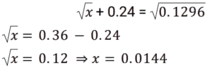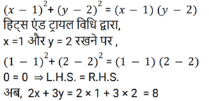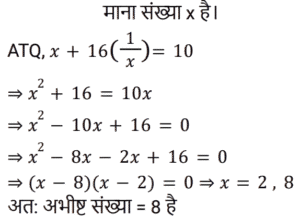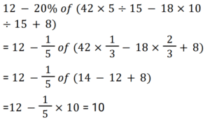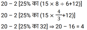 सरलीकरण Part-15Total Questions: 5011. सबसे छोटी भिन्न को ज्ञात करें। [RRB JE 27/06/2019 (Evening)](a) 3/4 (b) 11/13 (c) 5/7(d) 9/11Correct Answer: (c) 5/7Solution:12. (82 + 28)² – (82 – 28)² / 82 × 28 का मान ज्ञात कीजिए। [RRB JE 28/06/2019 (Evening)](a) 220 (b) 8 (c) 4(d) 110Correct Answer: (c) 4Solution:13. तो x का मान है: [ ALP Tier II 21/01/2019 (Afternoon) ](a) 3 (b) 12(c) 6 (d) 4Correct Answer: (b) 12Solution:14. इसे हल करें [ ALP Tier II 21/01/2019 (Afternoon) ](a) 0.04(b) 0.004(c) 0.02(d) 0.002Correct Answer: (c) 0.02Solution:15. 12 – 20% of (42×5÷15 – 18×10÷15 + 8) = ________ [ALP Tier II 21/01/2019 (Afternoon)](a) 6 (b)10(c) 8 (d)12Correct Answer: (b)10Solution:16. 0.000225 का वर्गमूल क्या है ? [ ALP Tier II 21/01/2019 (Evening) ](a) 0.015(b) 0.005(c) 0.0015(d) 0.0125Correct Answer: (a) 0.015Solution:17. एक संख्या और उसके व्युत्क्रम के 16 गुने का योग 10 है। तो संख्या है: [ ALP Tier II 21/01/2019 (Evening) ](a) 7(b) 5(c) 8(d) 6Correct Answer: (c) 8Solution:18. यदि (x – 1)²+ (y – 2)² = (x – 1)(y – 2) जहाँ x और y पूर्णांक है, तो 2x + 3y का मान होगा: [ ALP Tier II 21/01/2019 (Morning) ](a) 7(b) 11(c) 8(d) 5Correct Answer: (c) 8Solution:19. यदि √X + 0.24 = √0.1296 , X का मान बताएं [ ALP Tier II 23/01/2019 (Morning) ](a) 0.0144 (b) 0.12 (c) 0.0012 (d) 1.44Correct Answer: (a) 0.0144 Solution:20. 20 – 2 [25% का (15 × 8 ÷ 6+12)] = _______ ? [ALP Tier II 23/01/2019 (Morning)](a) 8 (b) 6 (c) 10 (d) 4Correct Answer: (d) 4Solution:Submit Quiz« Previous12345Next »