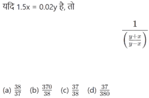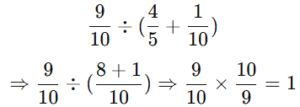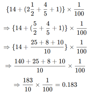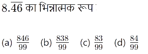 सरलीकरण Part-4Total Questions: 5021. {14 + (2½ + ⁴/₅ + 1)} × ¹/₁₀₀ का मान ज्ञात कीजिए। [Group D 12/09/2022 (Morning)](a) 0.0183 (b) 0.183(c) 1.83 (d) 18.3Correct Answer: (b) 0.183Solution:22. ⁹/₁₀ ÷ (⁴/₅ + ¹/₁₀) का मान ज्ञात कीजिए। [Group D 12/09/2022 (Afternoon)](a) 0 (b) 1(c) ¹/₁₀ (d) ⁸¹/₁₀₀Correct Answer: (b) 1Solution:23. 0.3̅ को 𝑝/q के रूप में व्यक्त कीजिए, जहाँ p और q पूर्णांक हैं और q ≠ 0। [Group D 12/09/2022 (Evening)](a) 2/3(b) 2/5(c) 3/4(d) 1/4Correct Answer: (d) 1/4Solution:24. 597 × 603 का मान ज्ञात कीजिए। [Group D 13/09/2022 (Morning)](a) 559991 (b) 659991 (c) 359991(d) 459991Correct Answer: (c) 359991Solution:597 × 603 = (600 - 3) × (600 + 3)= 600² - 3² = 360000 - 9 = 35999125. 222.22 + 22.22 + 12 + 0.22 + 0.02 = ? का मान ज्ञात कीजिए। [Group D 13/09/2022 (Morning)](a) 256.08 (b) 256.86 (c) 255.68 (d) 256.68Correct Answer: (d) 256.68Solution:222.22 + 22.22 + 12 + 0.22+ 0.02 = 244.44 + 12.24 = 256.6826. मान क्या है? [Group D 13/09/2022 (Afternoon)](a) 1/25(b) 1/5(c) 5 (d) 25Correct Answer: (d) 25Solution:27. सरल कीजिए। [Group D 13/09/2022 (Afternoon)](a) 8 (b) 4 (c) 1 (d) 2Correct Answer: (d) 2Solution:28. (34)³ का मान ज्ञात कीजिए [Group D 13/09/2022 (Afternoon)](a) 39304 (b) 39204 (c) 40304 (d) 29304Correct Answer: (a) 39304 Solution:29. मान ज्ञात कीजिए। [Group D 13/09/2022 (Afternoon)](a)(b)(c)(d)Correct Answer: (c)Solution:30. ज्ञात कीजिए। [Group D 13/09/2022 (Evening)](b)(a)(c)(d)Correct Answer: (b)Solution:Submit Quiz« Previous12345Next »