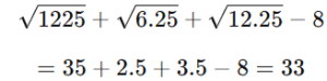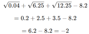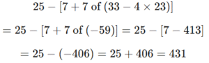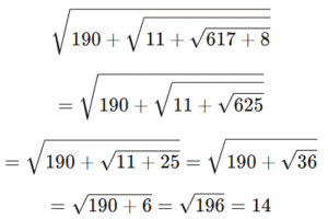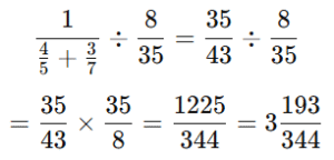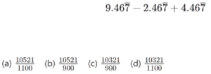 सरलीकरण Part-4Total Questions: 5031. मान ज्ञात कीजिए। [Group D 14/09/2022 (Morning)](a) –2.2 (b) –2(c) 2.2 (d) 2Correct Answer: (b) –2Solution:32. मान ज्ञात कीजिए। [Group D 14/09/2022 (Afternoon)](a) 2.5 (b) 25 (c) 0.04(d) 0.25Correct Answer: (c) 0.04Solution:33. का मान ______ है। [Group D 14/09/2022 (Afternoon)](a) 14 (b) 12 (c) 13 (d) 16Correct Answer: (a) 14 Solution:34. 0.696×0.27 का मान ज्ञात कीजिए [Group D 14/09/2022 (Evening)](a)(b)(c)(d)Correct Answer: (b)Solution:35. मान ज्ञात कीजिए। [Group D 15/09/2022 (Morning)](a)(b)(c)(d)Correct Answer: (c)Solution:36. [(0.413)÷(0.00413)]−74.27−25.72 का मान ______ है। [Group D 15/09/2022 (Afternoon)](a) 0.01 (b) 0 (c) 1 (d) 0.1Correct Answer: (a) 0.01 Solution:37. √1225 +√6.25 +√12.25 − 8 का मान ______ है। [Group D 15/09/2022 (Afternoon)](a) 33 (b) 0.75 (c) 50 (d) 0.16Correct Answer: (a) 33 Solution:38. सरल कीजिए: [Group D 15/09/2022 (Afternoon)]25−[7+7(33−4×23)](a) 431 (b) –4651 (c) –395 (d) –9313Correct Answer: (a) 431 Solution:39. मान ज्ञात कीजिए। [Group D 15/09/2022 (Evening)](a)(b)(c)(d)Correct Answer: (a)Solution:40. 3⁻⁵×4⁻⁵×5⁻⁵ का मान ज्ञात कीजिए। [Group D 16/09/2022 (Morning)](a) 1/30⁵(b) 1/50⁵(c) 1/60⁵(d) 1/40⁵Correct Answer: (c) 1/60⁵Solution:Submit Quiz« Previous12345Next »
