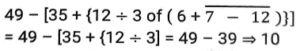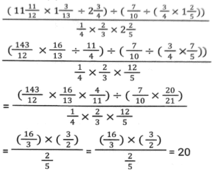 सरलीकरण Part-7Total Questions: 5011. का मूल्य है [Level 2 (13/06/2022) Shift 2](a) 1⅕(b) 20(c) 3⅕(d) 10Correct Answer: (b) 20Solution:12. (13)³ + (–8)³ + (–5)³ का मान ज्ञात कीजिए [Level 2 (13/06/2022) Shift 2](a) –40 × 41 (b) 39 × 40(c) –39 × 40 (d) 41 × 38Correct Answer: (b) 39 × 40Solution:(13)³ + (–8)³ + (–5)³= 2197 – 512 – 125 = 1560 या 39 × 4013. 49 – [35 + {12 ÷ 3 of (6 + 7 – 12)}] का मूल्य है [Level 2 (13/06/2022) Shift 2](a) –8 (b) –12(c) 10 (d) 9Correct Answer: (b) –12Solution:14. योग के रूप में 11/6 प्राप्त करने के लिए निम्नलिखित में से किस भिन्न को 5/9 में जोड़ा जाना चाहिए? [Level 2 (13/06/2022) Shift 2](a) 1⁷⁄₁₈(b) 1¹⁄₁₅(c) 1⁵⁄₁₈(d) 1¹⁄₁₃Correct Answer: (d) 1¹⁄₁₃Solution:15. मान ज्ञात करें ? [Level 3 (14/06/2022) Shift 1](a) 3/2 (b) 1/4(c) 5/6 (d) 7/2Correct Answer: (b) 1/4Solution:16. यदि √64 – ³√64 = ⁴√y , जहाँ y > 0, तो y का मान है: [Level 3 (14/06/2022) Shift 1](a) 256 (b) 16 (c) 625 (d) 81Correct Answer: (b) 16 Solution:17. संख्याओं के व्युत्क्रमों के योग का व्युत्क्रम ज्ञात कीजिए। [Level 3 (14/06/2022) Shift 2](a) 23/22(b) 22/23(c) 40/303(d) 607/120Correct Answer: (c) 40/303Solution:18. निम्नलिखित में से कौन सा मान [Level 3 (14/06/2022) Shift 2](a)(b)(c)(d)Correct Answer: (c)Solution:19. सरल करें: [Level 3 (14/06/2022) Shift 2](a) 14 (b) 6 (c) 3(d) 4Correct Answer: (c) 3Solution:20. सरल करें: [Level 5 (15/06/2022) Shift 1](a)(b)(c)(d)Correct Answer: (a)Solution:Submit Quiz« Previous12345Next »