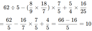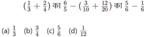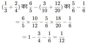 सरलीकरण Part-8Total Questions: 501. मान ज्ञात कीजिये ? [RRB NTPC 28/12/2020 (Morning)](a)(b)(c)(d)Correct Answer: (d)Solution:2. मान किसके समतुल्य है ? [RRB NTPC 28/12/2020 (Morning)](a) 3.27 (b) 3.12 (c) 2.55 (d) 5.73Correct Answer: (a) 3.27 Solution:3. मान क्या है ? [RRB NTPC 28/12/2020 (Morning)](a)(b)(c)(d)Correct Answer: (d)Solution:4. यदि P = 0.3 × 0.3 + 0.03 × 0.03 - 0.6 × 0.03 और Q = 0.54, तब 𝑃/𝑄 किसके समतुल्य है ? [RRB NTPC 28/12/2020 (Evening)](a) 4.5 (b) 0.45 (c) 4.05 (d) 0.135Correct Answer: (d) 0.135Solution:5. निम्नलिखित को हल कीजिये : [RRB NTPC 28/12/2020 (Evening)](a)(b)(c)(d)Correct Answer: (d)Solution:6. मान किसके समतुल्य होगा ? [RRB NTPC 28/12/2020 (Evening)](a)(b)(c)(d)Correct Answer: (b)Solution:7. मान किसके समतुल्य है ? [RRB NTPC 28/12/2020 (Evening)](a)(b)(c)(d)Correct Answer: (d)Solution:8. मान ज्ञात करे। [RRB NTPC 29/12/2020 (Morning)](a) 7.648 (b) 7.548 (c) 7.854 (d) 7.458Correct Answer: (b) 7.548 Solution:9. सरल करे [RRB NTPC 29/12/2020 (Morning)](a) 12 (b) 15 (c) 5 (d) 10Correct Answer: (d) 10Solution:10. मान ज्ञात कीजिये ? [RRB NTPC 29/12/2020 (Morning)](a) 1 (b) 72 (c) 0 (d) 75Correct Answer: (c) 0 Solution:Submit Quiz12345Next »