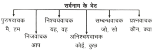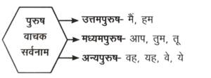 Solution:'पुरुषवाचक सर्वनाम' पुरुषों (स्त्री या पुरुष) के नाम के बदले आते हैं। उत्तम पुरुष में लेखक या वक्ता आता है, मध्यम पुरुष में पाठक या श्रोता और अन्य पुरुष में अन्य लोग आते हैं; इसके तीन भेद हैं-उत्तम पुरुष- मैं, हम, मुझे, मुझको, हमारा।
