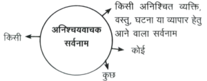 सर्वनामपरिभाषा एवं प्रकार Total Questions: 5031. 'कोई आ रहा है'- वाक्य में 'कोई' किस प्रकार का सर्वनाम है? [UPSSSC सम्मिलित अवर अधीनस्थ सेवा-I परीक्षा, 2016](a) अनिश्चयवाचक(b) निश्चयवाचक(c) सम्बन्धवाचक(d) निजवाचकCorrect Answer: (a) अनिश्चयवाचकSolution:'कोई आ रहा है' वाक्य में 'कोई' अनिश्चयवाचक सर्वनाम है।32. निम्नलिखित में कौन-सा अनिश्चयवाचक सर्वनाम नहीं है? [MP. PCS (C-SAT) Exam, 2013](a) कुछ भी(b) कुछ-न-कुछ(c) सब कुछ(d) जो, वहCorrect Answer: (d) जो, वहSolution:जिस सर्वनाम में किसी वस्तु का निश्चित बोध नहीं होता है, उसे अनिश्चयवाचक सर्वनाम कहते हैं। प्रस्तुत विकल्प (a), (b) तथा (c) में अनिश्चयवाचक सर्वनाम है, जबकि विकल्प (d) में इस प्रकार का कोई सम्बन्ध नहीं है।33. 'कोई' और 'कुछ' का प्रयोग इनमें से किस सर्वनाम में किया जाता है? [P.G.T. परीक्षा, 2013](a) सम्बन्धवाचक सर्वनाम(b) निश्चयवाचक सर्वनाम(c) अनिश्चयवाचक सर्वनाम(d) निजवाचक सर्वनामCorrect Answer: (c) अनिश्चयवाचक सर्वनामSolution:जिस सर्वनाम से किसी निश्चित वस्तु का बोध न हो, उसे अनिश्चयवाचक सर्वनाम कहते हैं। जैसे-कोई, कुछ इत्यादि।34. निम्न में सर्वनाम शब्द है- [UPSSSC युवा कल्याण एवं विकास दल अधिकारी परीक्षा, 2018 (I)](a) दान(b) भजन(c) कुछ(d) पढ़नाCorrect Answer: (c) कुछSolution:'कुछ' सर्वनाम शब्द है। जिस सर्वनाम से किसी निश्चित वस्तु का बोध न हो, उसे अनिश्चयवाचक सर्वनाम कहते हैं। जैसे-कोई, कुछ।35. अनिश्चयवाचक सर्वनाम का 'करण कारक बहुवचन रूप' होगा- [UPSSSC विधानभवन रक्षक एवं वन रक्षक परीक्षा, 2016 (I)](a) किन्हीं को(b) किन्हीं की(c) किन्हीं से(d) किन्हीं काCorrect Answer: (c) किन्हीं सेSolution:अनिश्चयवाचक सर्वनाम का करण कारक बहुवचन रूप 'किन्हीं से' होगा।36. रेखांकित सर्वनाम का प्रकार चिह्नित कीजिए- [UPSSSC आबकारी सिपाही (द्वितीय पाली) परीक्षा, 2016]कोई तो होगा जो तुम्हारी सहायता कर सके।(a) पुरुषवाचक सर्वनाम(b) प्रश्नवाचक सर्वनाम(c) अनिश्चयवाचक सर्वनाम(d) निश्चयवाचक सर्वণাৰCorrect Answer: (c) अनिश्चयवाचक सर्वनामSolution:'कोई तो होगा जो तुम्हारी सहायता कर सके।' वाक्य में 'कोई' अनिश्चयवाचक सर्वनाम है।37. "कोई गाना गा रहा है।" वाक्य में 'सर्वनाम' पहचानिए- [MP. PCS (C-SAT) Exam, 2016](a) अनिश्चयवाचक(b) प्रश्नवाचक(c) सम्बन्धवाचक(d) निश्चयवाचकCorrect Answer: (a) अनिश्चयवाचकSolution:"कोई गाना गा रहा है।" वाक्य में 'अनिश्चयवाचक सर्वनाम' का प्रयोग हुआ है। जिन सर्वनाम शब्दों के द्वारा किसी निश्चित व्यक्ति अथवा वस्तु का बोध न हो, वे अनिश्चयवाचक सर्वनाम कहलाते हैं। जैसे 'कोई', 'कुछ' आदि।38. 'आपके घर में इतना दूध होता है, कुछ हमारे यहाँ भी भिजवा दिया करिए।' अधोरेखित शब्दों का सर्वनाम का प्रकार लिखिए। [U.P. SI-2021](a) निश्चयवाचक सर्वनाम(b) सम्बन्धवाचक सर्वनाम(c) अनिश्चयवाचक सर्वनाम(d) निजवाचक सर्वनामCorrect Answer: (c) अनिश्चयवाचक सर्वनामSolution:उपर्युक्त वाक्य में 'इतना' तथा 'कुछ' शब्दों में अनिश्चयवाचक सर्वनाम है।39. 'जैसा करोगे, वैस