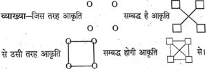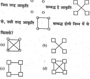 सहायक समीक्षा अधिकारी (प्रीलिम्स) परीक्षा, 2010 सामान्य अध्ययन (Part-II)Total Questions: 7031. इसे हल करो(a)(b)(c)(d)Correct Answer: (d)Solution:32. श्रेणी IKJ, NPO, SUT,...... में रिक्त स्थान निर्दिष्ट करता है(a) WXY(b) VXW(c) XYZ(d) XZYCorrect Answer: (d) XZYSolution:व्याख्या-श्रृंखला का उपयुक्त क्रम इस प्रकार है-उपर्युक्त श्रृंखला में क्षैतिज श्रृंखला को प्राप्त करने के लिए पहले अक्षर में +2 जोड़ा गया है तथा इसके पश्चात् -1 घटा दिया गया है जैसे- I +2 K -1 J उर्ध्वाधर श्रृंखला प्राप्त करने के लिए प्रत्येक अक्षर में पाँच जोड़ दिया गया है जैसे- 1+5=N N+5=S S+5=x33. निम्नलिखित गुणों में से कौन शेष से असंगत है?(a) वीरता(b) निष्ठा (स्वामिभक्ति)(c) ईमानदारी(d) चतुराई (चालाकी)Correct Answer: (d) चतुराई (चालाकी)Solution:व्याख्या- दिए गए विकल्पों में वीरता, निष्ठा तथा ईमानदारी सकारात्मक भाव प्रकट कर रहे हैं, जबकि चतुराई (चालाकी) नकारात्मक भाव प्रकट कर रहा है, अतः विकल्प (d) असंगत है।34. एक विद्यार्थी अपने विद्यालय के द्वार से सीधे पूर्व दिशा में 1 किलोमीटर चलता है फिर वहीं से 90° कोण बनाकर बाई ओर मुड़कर 1 किलोमीटर फिर चलता है और उसी तरह फिर बाईं ओर मुड़ कर एक किलोमीटर जाकर रुककर, खड़ा हो जाता है। अब वह अपने प्रस्थान-बिन्दु से किस निश्चित दिशा में खड़ा है?(a) पश्चिम-दक्षिण(b) उत्तर(c) पूर्व-उत्तर(d) दक्षिण-उत्तरCorrect Answer: (b) उत्तरSolution:व्याख्या-विद्यार्थी अपने विद्यालय के द्वार से सीधे पूर्व दिशा में चलता है = एक किमी एक किमी चलने के पश्चात् 90° कोण बनाकर विद्यार्थी बाएँ चलता है = एक किमी नये स्थान से बाएं मुड़कर विद्यार्थी चलता है एक किमी अब विद्यार्थी अपने प्रारम्भिक बिन्दु से उत्तर दिशा में है जिसे चित्र से स्पष्ट किया गया है।35. निम्नलिखित अंकों की श्रृंखला में अन्त में कौन सी संख्या आएगी?13, 23, 34, 46, 59, 73,.....?(a) 79(b) 92(c) 98(d) 88Correct Answer: (d) 88Solution:व्याख्या-दी गई श्रृंखला में क्रम है— +10 +11 +12 +13 +14....... इस प्रकार— 13 + 10 = 23 23 + 11 = 34 34 + 12 = 46 46 + 13 = 59 59 + 14 = 73 अभीष्ट संख्या 73 + 15 = 88 अतः उत्तर है (d) 8836. A, B से 5 वर्ष छोटा है। B, C से 3 गुना बड़ा है। यदि C चार वर्ष पूर्व 10 वर्ष का था तो A की आयु 6 वर्ष बाद होगी(a) 35(b) 38(c) 43(d) 45Correct Answer: (c) 43Solution:व्याख्या—C की 4 वर्ष पूर्व आयु = 10 वर्ष अतः C की वर्तमान आयु = 10 + 4 = 14 वर्ष B, C से तीन गुना बड़ा है। अतः B की वर्तमान आयु = 14 × 3 = 42 वर्ष A, B से पाँच वर्ष छोटा है। अतः A की वर्तमान आयु = 42 – 5 = 37 वर्ष छः वर्ष बाद A की आयु = 37 + 6 = 43 वर्ष अतः उत्तर है (c) 4337. किसी घन के पृष्ठ का क्षेत्रफल 216 वर्ग मीटर है, तो उसका आयतन क्या है?(a) 512 घन मीटर(b) 480 घन मोटर(c) 216 घन मीटर(d) 100 घन मीटरCorrect Answer: (c) 216 घन मीटरSolution:व्याख्या—घन के पृष्ठ का क्षेत्रफल = 216 वर्ग मी. माना घन की एक भुजा = x मी. घन के पृष्ठ का क्षेत्रफल = 6 × (भुजा)² 6 × (भुजा)² = 216 वर्ग मी. 6 × (x)² = 216 x² = 216/6 x² = 36 x = √36 x = 6 मी. घन का आयतन = (भुजा)³ = 6 × 6 × 6 = 216 घन मीटर उत्तर38. 10% ब्याज पर रु. 2000 निवेशित किए गए। चक्रवृद्धि ब्याज की गणना प्रति छह मा