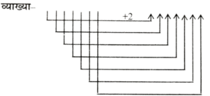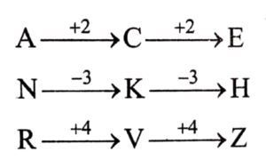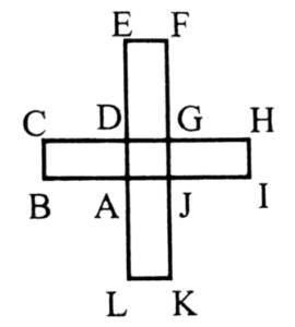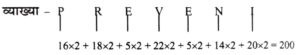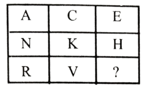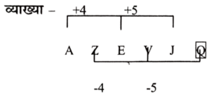 सहायक समीक्षा अधिकारी (मुख्य) परीक्षा, 2013 सामान्य अध्ययन (Part-II)Total Questions: 6021. 4 सेमी. x 4 सेमी. x 4 सेमी. आयाम (dimension) के एक घन के सभी फलक हरे रंग से रंग दिये गए हैं और उसे 64 इकाई घनों में काट दिया गया है। कितने इकाई घन ऐसे हैं जिनके दो फलक हरे रंग के होंगे?(a) 8(b) 16(c) 24(d) 32Correct Answer: (c) 24Solution:दो फलकों में रंगे हुए घनों की संख्या = (n-2) 12 चूंकि n = 4, = (4-2) 12 = 24अतः दो हरे फलकों की संख्या 24 होगी।22. निम्नांकित सारिणी में लुप्त अक्षर प्राप्त कीजिए :(a) Z(b) T(c) L(d) ICorrect Answer: (a) ZSolution:अतः ? के स्थान पर Z होगा।23. यदि PERFECT का कूट RGTHGEV हो, तो इसी कूट में BROWN कैसे लिखा जायेगा?(a) CSPXO(b) DSQYP(c) CTQXP(d) DTQYPCorrect Answer: (d) DTQYPSolution:व्याख्या -इसी प्रकार, BROWN → DTQYP24. निम्नांकित आकृति में कितने आयत हैं?(a) 8(b) 10(c) 11(d) 12Correct Answer: (b) 10Solution:व्याख्या - आयतों की संख्या =ABCD, DEFG, GHIJ, JKLA, LEFK, BCHI, LDGK, JBCG, AEFJ, DHIA = 10 आयत25. निम्नांकित में विषम आकृति है -(a)(b)(c)(d)Correct Answer: (c)Solution:विकल्प (a), (b), (d) के दोनों छोटे भाग मिलकर आकृति का आधा भाग बनाते हैं जबकि विकल्प (c) के दोनों छोटे भाग मिलकर आकृति का आधा भाग नहीं है।26. यदि HORSE = IQUWJ, तो TIGER बराबर है -(a) GJKHF(b) UKGSJ(c) UKJIW(d) SJKHWCorrect Answer: (c) UKJIWSolution:27. निम्नलिखित श्रेणी में लुप्त अक्षर है - AZEVJ ?(a) Q(b) B(c) F(d) LCorrect Answer: (a) QSolution:28. श्रेणी : 4, 9, 25, ?, 121, 169, 289 में लुप्त संख्या है -(a) 49(b) 64(c) 81(d) 91Correct Answer: (a) 49Solution:व्याख्या - 4, 9, 25, 49, 121, 169, 289 उपर्युक्त श्रृंखला अभाज्य अंकों के वर्गों की चल रही है। अतः रिक्त स्थान पर 7² = 49 होगा।29. निम्नलिखित में लुप्त अक्षर क्रम से हैं -aba .... bca .... ac .... cab .... cbc(a) cbbb(b) cbba(c) ccba(d) caacCorrect Answer: (a) cbbbSolution:व्याख्या - aba c bca b ac b cab a cbeaba, cbc, aba, cbc, aba, cbc30. यदि A = 2, B = 4, C = 6 तथा इत्यादि (so on) हो, तो PREVENT का अंकमान होगा -(a) 196(b) 198(c) 200(d) 202Correct Answer: (c) 200Solution:Submit Quiz« Previous123456Next »