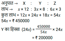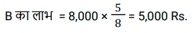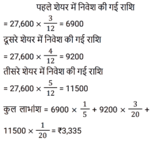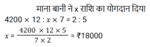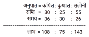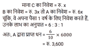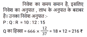 साझेदारीTotal Questions: 371. मयूर और अहम 2 : 3 के अनुपात में निवेश करके एक साझेदारी में प्रवेश करते हैं। कुल लाभका 10% दान में जाता है। यदि अहम का हिस्सा ₹4,860 है, तो कुल अर्जित लाभ (₹ में) कितना है? [SSC MTS 11/09/2023 (3rd Shift)](a) 7,200(b) 9,000(c) 8,500(d) 11,000Correct Answer: (b) 9,000Solution:2. निकिता ने दो निवेश किए, वह एक निवेश पर 10% अर्जित करती है और दूसरे निवेश पर उसे 20% की हानि होती है। यदि निवेश 2:3 के अनुपात में थे, तो उसका लाभ या हानि प्रतिशत कितना है ? [SSC MTS 05/09/2023 (2nd Shift)](a) 8% की हानि(b) 15% का लाभ(c) 8% का लाभ(d) 15% की हानिCorrect Answer: (a) 8% की हानिSolution:3. एक महिला तीन शेयरों में 3 : 4 : 5 के अनुपात में ₹27,600 का निवेश करती है, जो उस वर्ष के लिए उसके निवेश पर क्रमशः 20%, 15% और 5% का लाभांश देते हैं। कुल लाभांश कितना है? [SSC MTS 04/09/2023 (1st Shift)](a) ₹3,852(b) ₹3,335(c) ₹3,125(d) ₹2,535Correct Answer: (b) ₹3,335Solution:4. स्वाति ₹4,200 के साथ एक व्यवसाय शुरू करती है और 5 माह बाद, बानी स्वाति के साथ उसकी भागीदार के रूप में जुड़ जाती है। एक वर्ष के बाद, लाभ को स्वाति और बानी के बीच 2:5 के अनुपात में बांटा जाता है। बानी ने कितनी धनराशि का योगदान दिया ? [SSC MTS 01/09/2023 (3rd Shift)](a) ₹18,000(b) ₹17,050(c) ₹19,000(d) ₹16,500Correct Answer: (a) ₹18,000Solution:5. तीन व्यक्तियों A, B और C ने एक व्यवसाय में कुछ धनराशि का निवेश किया। A की हिस्सेदारी, B की हिस्सेदारी से दोगुना है, और B की हिस्सेदारी C की हिस्सेदारी से तीगुना है। 1 वर्ष के बाद, उन्होंने ₹6,000 कमाए। A को प्राप्त धनराशि ज्ञात कीजिए। [SSC CHSL 11/08/2023 (4th Shift)](a) ₹3,200(b) ₹3,000(c) ₹3,600(d) ₹3,500Correct Answer: (c) ₹3,600Solution:6. तीन साझेदार P, Q और R एक व्यवसाय में क्रमशः ₹1,000, ₹1,200 और ₹1,500 का निवेश करते हैं। यदि कुल लाभ ₹666 है, तो उसमे Q का हिस्सा कितना होना चाहिए? [SSC CHSL 10/08/2023 (2nd Shift)](a) ₹216(b) 275(c) ₹252(d) ₹284Correct Answer: (a) ₹216Solution:7. कपिल ने अप्रैल 2022 में ₹30,00,000 के निवेश के साथ एक व्यवसाय शुरू किया। छः माह के बाद, उसका दोस्त कुणाल ₹25,00,000 के निवेश के साथ उसके साथ शामिल हो गया। फरवरी 2023 में, कपिल की एक पूर्व कक्षा साथी सलोनी ने भी पहले के दो साझेदारों द्वारा किए गए कुल निवेश के बराबर धनराशि का निवेश किया। जिस दिन कपिल ने व्यवसाय शुरू किया था, उस तारीख से 3 वर्ष बाद अर्जित लाभ किस अनुपात में बांटा जाएगा ? [SSC CHSL 02/08/2023 (4th Shift)](a) 332 : 200 : 50(b) 108 : 75 : 143(c) 432 : 300 : 55(d) 432 : 400 : 55Correct Answer: (b) 108 : 75 : 143Solution:8. एक व्यवसाय में A एक कामकाजी भागीदार है और B एक निष्क्रिय भागीदार है। A व्यवसाय में ₹30,000 का निवेश करता है और B ₹50,000 का निवेश करता है। A को व्यवसाय के प्रबंधन के लिए लाभ का 20% प्राप्त होता है और शेषराशि को उनकी पूंजी के अनुपात में विभाजित किया जाता है। ₹10,000 के लाभ से B का हिस्सा कितना है? [SSC CHSL 02/08/2023 (2nd Shift)](a) ₹5,500(b) ₹5,000(c) ₹4,500(d) ₹4,000Correct Answer: (b) ₹5,000Solution:9. X, Y और Z एक साझेदारी में हिस्सा लेते हैं। X शुरुआत में कुछ राशि का निवेश करता है। 4 माह के बाद Y, X की राशि से तीन गुना राशि का निवेश करता है और हिस्सेदारी की शुरुआत से 9 माह के बाद Z, Y की राशि से दोगुना राशि का निवेश करता है। यदि बार्षि