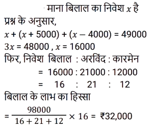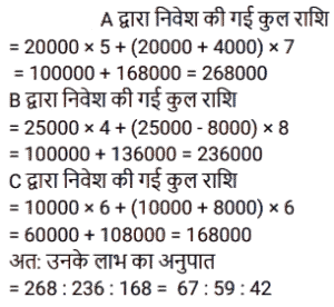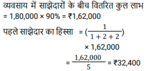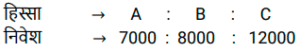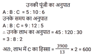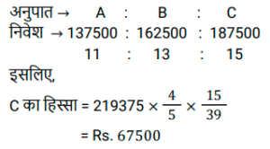 साझेदारीTotal Questions: 3711. A, B और C ने क्रमशः ₹ 20000, ₹25000 और ₹10000 के प्रारंभिक निवेश के साथ एक व्यापार शुरू किया। प्रारंभ से 5 महीने बाद, A ने ₹ 4000 और निवेश किए। प्रारंभ से 6 महीने बाद, C ने ₹ 8000 और निवेश किए। प्रारंभसे 4 महीने बाद, B ने ₹ 8000 वापस निकाल लिए। वर्ष के अंत में, उन्हें ₹ 'x' का लाभ प्राप्त होगा। वे किस अनुपात में लाभ को बाँटेंगे? [ SSC CGL Tier II (08/08/2022)](a) 71 : 57 : 42(b) 71 : 59 : 42(c) 59 : 68 : 42(d) 67 : 59 : 42Correct Answer: (d) 67 : 59 : 42Solution:12. A, B और C ने एक व्यवसाय की शुरुआत की जिनकी पूँजी का अनुपात क्रमशः 2:3:5 है। व्यवसाय के आरंभ से 4 महीने बाद A ने अपनी पूँजी 50% से बढ़ा ली, B ने 6 महीने बाद अपनी पूँजी 33⅓% से बढ़ा ली तथा C ने 8 महीने बाद अपनी 50% पूँजी निकाल ली। यदि वर्ष के अंत में कुल 86,800 रुपये का लाभ हुआ, तो इस लाभ में A और C के हिस्सों में अंतर ज्ञात करें। [SSC CGL Tier II (13/09/2019)](a) Rs. 12,600(b) Rs.7,000(c) Rs.9,800(d) Rs.8,400Correct Answer: (a) Rs. 12,600Solution:13. A, B और C ने क्रमशः 1,37,500 रुपये, 1,62,500 रुपये तथा 1,87,500 रुपये निवेश करके एक व्यवसाय की शुरुआत की । A कार्यशील साझेदार है तथा लाभ का 20% कार्यशील भत्ता के रूप में लेता है और शेष लाभका वितरण उनके निवेश के अनुपात में कर दिया जाता है। यदि कुल लाभ 2,19,375 रुपये का है, तो C का हिस्सा क्या होगा ? [SSC CPO 13/03/2019 (Evening)](a) Rs 88,600(b) Rs 64,500(c) Rs 67,500(d) Rs 62,700Correct Answer: (c) Rs 67,500Solution:14. A, B और C ने साथ मिलकर एक व्यवसाय शुरू किया जिसमें A ने 12 महीने के लिए ₹7,000 का निवेश किया, B ने 10 महीने के लिए ₹8,000 का निवेश किया और ने 6 महीने के लिए ₹12,000 का निवेश किया। A कार्यकारी सदस्य था जिसके लिए उसे अपने पारिश्रमिक के रूप में लाभ का 20% प्राप्त हुआ। एक वर्ष के अंत में अर्जित कुल लाभ ₹14,750 था। इस लाभ में C का हिस्सा (₹ में) कितना है? [SSC CHSL Tier II (18/11/2024)](a) 4,000(b) 2,950(c) 3,600(d) 4,200Correct Answer: (c) 3,600Solution:15. A, B और C ने एक व्यवसाय में धनराशि का निवेश इस प्रकार किया कि A के हिस्से का 2 गुना, B के हिस्से का 4 गुना और C के हिस्से का 6 गुना सभी बराबर हैं। यदि उन्होंने ₹44,000 अर्जित किए, तो A का हिस्सा ज्ञात कीजिए। [SSC CGL 24/09/2024 (1st Shift)](a) ₹22,000(b) ₹12,000(c) ₹24,000(d) ₹20,000Correct Answer: (c) ₹24,000Solution:16. तीन साझेदारों ने एक व्यवसाय आरंभकरने का निर्णय लिया। उन्होंने लाभ का 10% एक धर्मार्थ संगठन को दान करने और फिर शेष लाभको पहले, दूसरे और तीसरे साझेदार के बीच 1 : 2 : 2 के अनुपात में साझा करने का फैसला किया। प्राप्त कुल लाभ ₹1,80,000 था। पहले साझेदार का हिस्सा ज्ञात कीजिए। [Matriculation Level 26/06/2024 (Shift - 1)](a) ₹32,400(b) ₹31,800(c) ₹33,200(d) ₹29,600Correct Answer: (a) ₹32,400Solution:17. A और B क्रमशः ₹25,000 और ₹50,000 की धनराशि के साथ एक कंपनी में एक वर्ष के लिए साझेदारी की शुरुआत करते हैं। 7 महीने बाद, ₹30,000 की धनराशि के साथ उनके साथ साझेदारी में शामिल हो जाता है और 9 महीने बाद A अपना योगदान (धनराशि) वापस ले लेता है। यह मानते हुए कि वर्ष के अंत में कुल लाभ₹3,900 है, तो उस लाभ में C का हिस्सा कितना होगा ? [SSC CHSL Tier II (02/11/2023)](a) ₹600(b) ₹800(c) ₹1,200(d) ₹1,000Correct Answer: (a) ₹600Solution:18. अरविंद बिलाल, कारमेन एक व्यवसाय में ₹49,000 का निवे