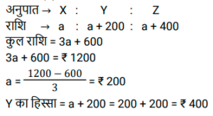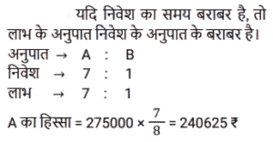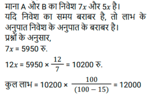 साझेदारीTotal Questions: 3721. A. B और C ने क्रमशः ₹9,000, ₹18,000 और ₹21,000 का निवेश करके एक व्यवसाय शुरू किया। यदि उनके द्वारा अर्जित लाभ में B का हिस्सा ₹759 है, तो उनके द्वारा मिलकर अर्जित किया गया कुल लाभ कितना है ? [SSC CHSL 10/08/2023 (3rd Shift)](a) ₹2,808(b) ₹2,024(c) ₹2,504(d) ₹2,208Correct Answer: (b) ₹2,024Solution:22. A और B ने एक व्यवसाय में 7 : 5 के अनुपात में धन निवेश किया। यदि कुल लाभ का 15% दान के लिए जाता है और लाभ में A का हिस्सा Rs.5,950 है, तो कुल लाभ कितना है ? [SSC CGL 18/07/2023 (4th shift)](a) Rs.12,500(b) Rs.12,000(c) Rs. 10,500(d) Rs.11,750Correct Answer: (b) Rs.12,000Solution:23. A ₹45,000 से एक व्यवसाय शुरू करता है और बाद में B ₹30,000 के साथ जुड़ जाता है। यदि वर्ष के अंत में लाभ को 2 : 1 के अनुपात में विभाजित किया जाता है, तो B कब शामिल हुआ ? [Matriculation Level 30/06/2023 (Shift - 4)](a) 6 महीने के बाद(b) 12 महीने के बाद(c) 3 महीने के बाद(d) 9 महीने के बादCorrect Answer: (c) 3 महीने के बादSolution:24. A और B संयुक्त रूप से एक व्यवसाय शुरू करते हैं। A द्वारा किया गया निवेश B द्वारा किए गए निवेश के सात गुना के बराबर है। ₹2,75,000 के वार्षिक लाभ में से A का हिस्सा ( में) ज्ञात कीजिए। [SSC CHSL Tier II (26/06/2023)](a) 2,40,625(b) 2,45,625(c) 2,42,365(d) 2,41,225Correct Answer: (a) 2,40,625Solution:25. Rs.1200 को X, Y और Z में इस प्रकार बाँटा जाता है कि Y का हिस्सा X के हिस्से से Rs.200 अधिक है। Y का हिस्सा Z के हिस्से से Rs.200 कम है। Y का हिस्सा है: [ SSC MTS 12/05/2023 (Evening)](a) Rs.200(b) Rs.600(c) Rs.800(d) Rs.400Correct Answer: (d) Rs.400Solution:26. A और B ने क्रमश: Rs. 15000 और Rs.30000 के साथ एक व्यवसाय शुरू किया। यदि A और B क्रमशः 1:5 के अनुपात में लाभसाझा करते हैं, तो A और B के लिए निवेश की समयावधि का क्रमशः अनुपात क्या है ? [SSC MTS 11/05/2023 (Afternoon)](a) 1:2(b) 2:5(c) 2:3(d) 2:7Correct Answer: (b) 2:5Solution:27. तीन साझेदारों P, Q और R ने एक व्यवसाय में कुल Rs 52,000 का निवेश किया। वर्ष के अंत में लाभ के हिस्से के रूप में, P को Rs.1430, Q को Rs. 1870 और R को Rs.2420 मिले। Q ने व्यवसाय में कितनी राशि का निवेश किया ? [SSC MTS 13/06/2023 (Evening)](a) Rs. 17000(b) Rs. 20400(c) Rs. 15300(d) Rs. 18700Correct Answer: (a) Rs. 17000Solution:28. P, Q और R साझेदार हैं और एक व्यवसाय में निवेश करते हैं। P कुल निवेश का 1/5 भाग निवेश करता है और Q कुल निवेश का 1/4 भाग निवेश करता है P, Q और R के निवेशों का क्रमशः अनुपात क्या है? [SSC CHSL 13/03/2023 (1st Shift)](a) 4:8:11(b) 4:5:11(c) 4:7:11(d) 4:5:9Correct Answer: (b) 4:5:11Solution:29. X, Y और Z ने एक व्यवसाय में क्रमशः Rs.4,000, Rs.6,000 और Rs. 8,000 का निवेश किया। उन्होंने क्रमशः 3, 2 और 4 वर्षों के लिए धनराशि का निवेश किया। यदि कुल लाभ Rs.56,000 है, तो लाभ में Y का हिस्सा कितना है? [SSC CHSL 15/03/2023 (2nd Shift)](a) Rs.18,000(b) Rs.12,000(c) Rs.15,000(d) Rs.9,000Correct Answer: (b) Rs.12,000Solution:30. निखिल और नेहा ने 5 : 4 के अनुपात में पूंजी का निवेश किया। नेहा ने निखिल की तुलना में एक वर्ष अधिक समय के लिए निवेश किया। उनके लाभ का अनुपात 6 : 5 है। ज्ञात कीजिए नेहा ने कितने समय के लिए धन का निवेश किया। [SSC CHSL 21/03/2023 (1st Shift)](a) 26 वर्ष(b) 23 वर्ष(d) 25 वर्ष(c) 24 वर्षCorrect Answer: (d) 25 वर्षSolution:Submit Quiz« Previous1234Next »