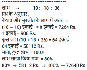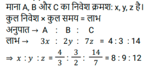 साझेदारीTotal Questions: 3731. A, B और C ने निश्चित निवेश किए तथा उनकी कालावधि का अनुपात क्रमशः 3 : 2 : 7 है। A, B और C के लाभ का अनुपात क्रमश: 4 : 3 : 14 है। A, B और C के निवेश का अनुपात क्या है? [SSC CGL Tier II (02/03/2023)](a) 1 : 3 : 4(b) 7 : 9 : 11(c) 8 : 9 : 12(d) 2 : 3 : 11Correct Answer: (c) 8 : 9 : 12Solution:32. सुरेश, दिनेश और रमेश 3 : 6 : 8 के अनुपात में धनराशि का निवेश करके एक व्यवसाय में साझेदार बनते हैं। यदि उनके निवेश में क्रमशः 5%, 15% और 20% की वृद्धि की जाती है, तो एक वर्ष के लिए उनके लाभ का अनुपात क्या हो जाएगा [SSC CGL Tier II (03/03/2023)](a) 7 : 46 : 64(b) 19 : 46 : 64(c) 21 : 46 : 64(d) 35 : 46 : 64Correct Answer: (c) 21 : 46 : 64Solution:33. A ने ₹75,000 के निवेश के साथ एक व्यवसाय शुरू किया और 5 महीने बाद ₹80,000 के निवेश के साथ B भी इस व्यवसाय में शामिल हो जाता है। 1 वर्ष के बाद उन्हे ₹4,08,800 का लाभ प्राप्त होता है। A और B का हिस्सा ज्ञात कीजिए (₹ में)। [SSC CGL Tier II (07/03/2023)](a) 2,52,000 और 1,56,800(b) 2,50,000 और 1,58,800(c) 2,48,000 और 1,60,800(d) 2,49,500 और 1,59,300Correct Answer: (a) 2,52,000 और 1,56,800Solution:34. A, B और C ने क्रमशः ₹100000, ₹140000, ₹200000 के निवेश से एक व्यवसाय शुरू किया। 3 महीने के बाद, C ने व्यवसाय छोड़ दिया, C के व्यवसाय छोड़ने के 7 महीने बाद, B ने भी व्यवसाय छोड़ दिया। B और C ने अपना निवेश वापस ले लिया। वर्ष के अंत में, C ने अपने लाभ का हिस्सा ₹1155 के रूप में प्राप्त किया। A और B के लाभ का कुल हिस्सा कितना है ? [SSC CGL Tier II (08/08/2022)](a) ₹6150(b) 5005(c) 4995(d) 5555Correct Answer: (b) 5005Solution:35. एक कंपनी द्वारा अर्जित लाभ को कंपनी में अपने पैसे का निवेश करने वाले तीन दोस्तों के बीच 6 : 9: 11 के अनुपात में विभाजित किया जाना है। यदि सबसे अधिक निवेश करने वाले व्यक्ति का हिस्सा ₹2,310 है, तो अन्य दो मित्रों द्वारा प्राप्त राशि (₹ में) है? [SSC MTS 22/10/2021 (Morning)](a) 1,890(b) 3,150(c) 5,460(d) 1,260Correct Answer: (b) 3,150Solution:36. केशव, सुरजीत और थॉमस ने 2 : 3 : 4 के अनुपात में निवेश के साथ एक व्यवसाय शुरू किया। उनके निवेश की अवधि का अनुपात 5 : 6 : 9 है। लाभ का 20% कार्यालय के किराए और रखरखाव पर खर्च किया गया था। शेष लाभआपस में बांट लिया जाता था। यदि केशव और सुरजीत के लाभ के हिस्से का अंतर 7264 रुपये है तो कुल लाभ (रु में) कितना है? [SSC CGL 18/08/2021 (Evening)](a) 51060(b) 58112(c) 46490(d) 72640Correct Answer: (d) 72640Solution:37. A, B, C एक व्यवसाय के लिए 75,500 1 रुपये का निवेश करता है। A, B से 3,500 रु अधिक निवेश करता है, और B, C से 4,500 रु अधिक निवेश करता है, कुल लाभ में से 45,300 रु में से A को कितना प्राप्त होगा। [SSC CPO 25/11/2020 (Evening)](a) 12,600(b) 15,000(c) 17,400(d) 14,700Correct Answer: (c) 17,400Solution:Submit Quiz« Previous1234