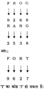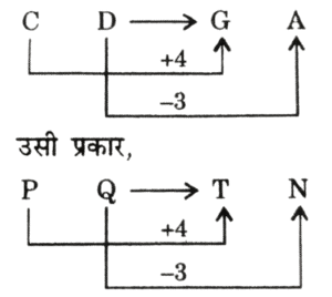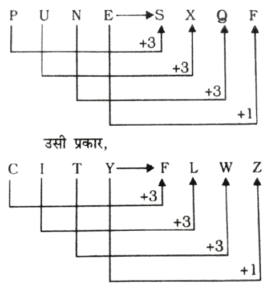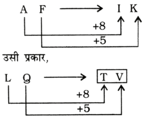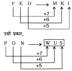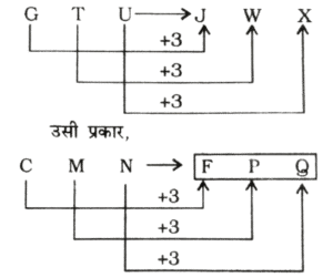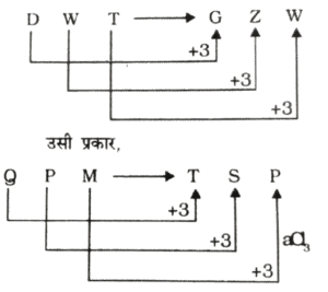 सादृश्यता या समसंबंध Type-IV (प्रश्न 51-100)Total Questions: 3011. पहली जोड़ी के पहले और दूसरे पद के बीच एक निश्चित संबंध है। वही संबंध दूसरी जोड़ी के पहले और विलुप्त पद के बीच में है। विलुप्त पद को ज्ञात कीजिए। [RRC मुम्बई रेलवे ग्रुप 'डी' परीक्षा, 16.11.2014, द्वितीय पाली]AF : IK = LQ : ? .(1) TV(2) NP(3) RS(4) ORCorrect Answer: (1) TVSolution:12. पहली जोड़ी के पहले और दूसरे पद के बीच एक निश्चित संबंध है। वही संबंध दूसरी जोड़ी के पहले और विलुप्त पद के बीच में है। विलुप्त पद को ज्ञात कीजिए। [RRC मुम्बई रेलवे ग्रुप 'डी' परीक्षा, 16.11.2014, द्वितीय पाली]FED : MKI = PON : ? .(1) WVU(2) IHG(3) WUS(4) ΜΝΟCorrect Answer: (3) WUSSolution:13. 'BF' का संबंध 'IM' से उसी तरह है, जैसे 'HL' का संबंध ___ से है। [RRC जबलपुर रेलवे ग्रुप 'डी' परीक्षा, 16.11.2014, द्वितीय पाली](1) OS(2) OR(3) NR(4) PTCorrect Answer: (1) OS14. GTU : JWX :: CMN : ? [RRB RPF/RPSF परीक्षा 15.02.2015](1) FQR(2) FPQ(3) FPR(4) FOPCorrect Answer: (2) FPQSolution:15. BROWN : BNORW :: SOUND : ? [RRB नन-टेक्निकल पॉपुलर कटेगरी ग्रैजुएट (CBT) (परीक्षा) 28.04.2016](A) SNOUD(B) OSUDN(C) SUDNO(D) DNOSU(1) D(2) B(3) A(4) CCorrect Answer: (1) DSolution:BROWN ⇒ BNORWअक्षरों को अंग्रेजी वर्णमाला क्रमानुसार व्यवस्थित किया गया है।अतः,SOUND ⇒ DNOSU16. सादृश्यता पूर्ण कीजिए : [RRB NTPC ग्रैजुएट लेबल CBT (मुख्य परीक्षा) 17.01.2017]CD : GA :: PQ : ?(1) SM(2) SN(3) TN(4) USCorrect Answer: (3) TNSolution:17. सादृश्यता पूर्ण कीजिए : [RRB NTPC ग्रैजुएट लेबल CBT (मुख्य परीक्षा) 17.01.2017]B : 8 :: C : ?(1) 10(2) 27(3) 11(4) 24Correct Answer: (2) 27Solution:B ⇒ 2 अर्थात् अंग्रेजी वर्णमाला श्रृंखला में स्थान संख्या।अब:, 2 × 2 × 2 = 8अत: C ⇒ 3तथा, 3 × 3 × 3 = 2718. नीचे दिए गए विकल्पों में से संबंधित शब्द का चयन करें : [RRB असिस्टेंट लोको पायलट एवं टेक्नीशियन (CBT) परीक्षा 14.08.2018 द्वितीय पाली]PUNE : SXQF :: CITY : _______(1) FLXZ(2) EKVZ(3) GMVZ(4) FLWZCorrect Answer: (4) FLWZSolution:19. DWT : GZW :: QPM : _______ [RRB असिस्टेंट लोको पायलट एवं टेक्नीशियन (CBT) परीक्षा 14.08.2018 द्वितीय पाली](1) PST(2) TSP(3) TPS(4) STPCorrect Answer: (2) TSPSolution:20. यदि FROG : 9268, RANG : 2538, तो FORT कोड के रूप में _______ बदल दिया गया है। [RRB सहायक लोको पायलट (ALP)/तकनीशियन (CBT) परीक्षा 17.08.2018 द्वितीय पाली](1) 9327(2) 9762(3) 9627(4) 9672Correct Answer: (3) 9627Solution:Submit Quiz« Previous123Next »