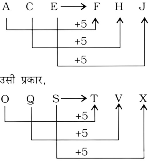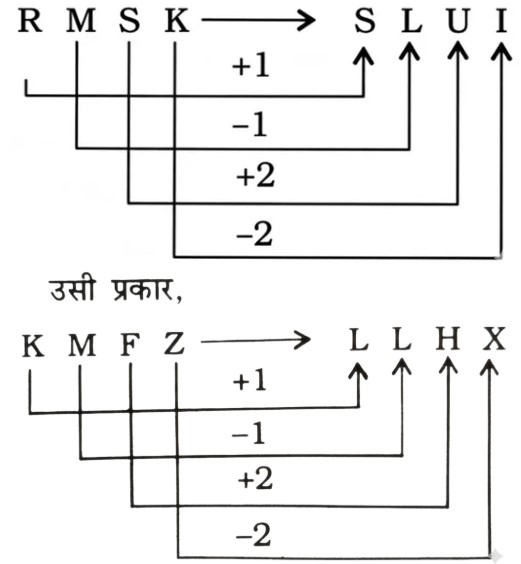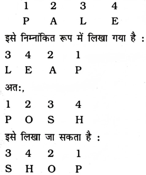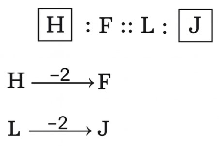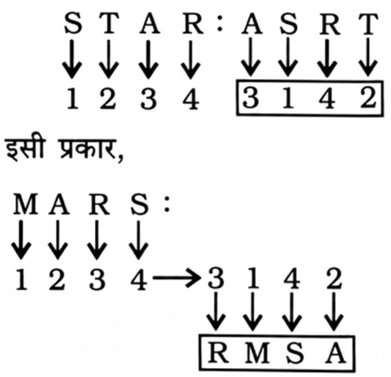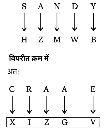 सादृश्यता या समसंबंध Type-IV (प्रश्न 51-100)Total Questions: 5031. HORSE : SERHO : : CURSE : ? [RRB NTPC CBT (मुख्य) परीक्षा, 18.01.2017 (प्रथम पाली)](1) ERCUS(2) SECRU(3) RCUES(4) SERCUCorrect Answer: (4) SERCUSolution:32. EIMQUY : CGKOSW : : BFJNRV : ? [RRB NTPC CBT (मुख्य) परीक्षा, 18.01.2017 (प्रथम पाली)](1) CGKOSW(2) DHLPTX(3) AEIMQU(4) ZDHLPTCorrect Answer: (4) ZDHLPTSolution:33. RMSK : SLUI : : KMFZ : ? [RRB NTPC CBT (मुख्य) परीक्षा, 18.01.2017 (प्रथम पाली)](1) LIHB(2) LLHX(3) HKIB(4) LHKXCorrect Answer: (2) LLHXSolution:34. ACE : FHJ : : OQS : ..... [RRB NTPC CBT (मुख्य) परीक्षा, 19.01.2017 (प्रथम पाली)](1) TVX(2) PRS(3) TXV(4) RPSCorrect Answer: (1) TVXSolution:35. PALE : LEAP : : POSH :- [RRB NTPC CBT (मुख्य) परीक्षा, 19.01.2017 (प्रथम पाली)](1) HSPO(2) HSOP(3) POHS(4) SHOPCorrect Answer: (4) SHOPSolution:36. निम्नलिखित में, दो दिए गए शब्दों के बीच एक निश्चित संबंध है, एक शब्द :: के एक ओर व दूसरा शब्द :: के दूसरी ओर है। जबकि दिए गए विकल्पों से एक और शब्द खोजना पड़ेगा, जिसका इस शब्द के साथ नीचे दिए गए जोड़ी के शब्दों के समान संबंध हो, सर्वोत्तम विकल्प का चयन करें। [RRB Group 'D' CBT परीक्षा, 30.10.2018 (तृतीय पाली)]JACKED : AKDJEC :: BRAZEN : .......(1) RNZBEA(2) RZNBAE(3) RNZAEB(4) RZNBEACorrect Answer: (4) RZNBEASolution:37. नीचे दी गयी श्रृंखला में लुप्त पद ज्ञात कीजिए। [RRB Group D' CBT परीक्षा, 02.11.2018 (तृतीय पाली)]STAR : ASRT : : MARS : .......(1) RMSA(2) SMRA(3) RSMA(4) SARMCorrect Answer: (1) RMSASolution:38. उस विकल्प का चयन करें जो तीसरे पद से ठीक उसी तरह सम्बंधित है जिस प्रकार दूसरा पद पहले पद से सम्बंधित है। [RRB Group 'D' CBT परीक्षा, 12.11.2018 (प्रथम पाली)]MATCH : TCAHM : : FARCY : .......?(1) RACYF(2) RCAFY(3) RCAYF(4) RCYAFCorrect Answer: (3) RCAYFSolution:39. निम्न के लिए सही विकल्प का चुनाव करें : [RRB Group 'D' CBT परीक्षा, 26.11.2018 (प्रथम पाली)](1) E. J(2) B. J(3) H. J(4) H. 1Correct Answer: (3) H. JSolution:40. उस विकल्प का चयन करें, जो तीसरे पद से उसी प्रकार संबंधित है जिस प्रकार दूसरा पद पहले पद से संबंधित है। [RRB Group 'D' CBT परीक्षा, 12.12.2018 (द्वितीय पाली)]SANDY : HZMWB : : CRATE : .......?(1) XIZVG(2) XIZGV(3) XIGZV(4) XZIGVCorrect Answer: (2) XIZGVSolution:Submit Quiz« Previous12345Next »