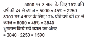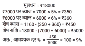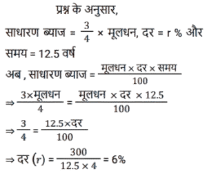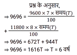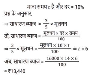 साधारण ब्याज (SSC) (Part-II)Total Questions: 501. दिव्यांश ने अपनी पूँजी का क्रमशः 1/4 हिस्सा 10% पर, 1/5 हिस्सा 20% पर और शेष 30% वार्षिक साधारण ब्याज पर निवेश किया। यदि उसकी वार्षिक आय ₹3,220 है, तो पूँजी (₹ में) ज्ञात करें। [SSC MTS 21/10/2024 (Evening)](a) 13,500(b) 17,000(c) 15,300(d) 14,000Correct Answer: (d) 14,000Solution:2. A, 8% वार्षिक साधारण ब्याज पर 4 वर्षों के लिए ₹7,500 उधार लेता है। B पहले वर्ष के लिए 9%, दूसरे वर्ष के लिए 10% और अगले दो वर्षों के लिए 6% की दर से साधारण ब्याज पर समान राशि उधार लेता है। A और B ने कुल कितने ब्याज (₹ में) का भुगतान किया ? [SSC MTS 22/10/2024 (Morning)](a) 4,275(b) 4,175(c) 4,725(d) 4,545Correct Answer: (c) 4,725Solution:3. पूजा ने एक निश्चित धनराशि 12.5 वर्ष के लिए r% वार्षिक साधारण ब्याज पर एक योजना में निवेश की और निवेश की गई धनराशि के 3/4 के बराबर ब्याज प्राप्त किया। r का मान ज्ञात करें। [SSC MTS 22/10/2024 (Evening)](a) 5 ¾(b) 6(c) 4(d) 7 ½Correct Answer: (b) 6Solution:4. रघु दो अलग-अलग व्यक्तियों को समान समय के लिए क्रमशः 7% वार्षिक और 8% वार्षिक दर से साधारण ब्याज पर ₹9,600 और ₹11,800 उधार देता है। यदि उसे दोनों से कुल ब्याज के रूप में ₹9,696 प्राप्त हुए थे, तो धनराशियां कितनी समयावधि के लिए उधार दी गई थीं ? [ SSC MTS 30/10/2024 (Afternoon)](a) 10 वर्ष(b) 8 वर्ष(c) 6 वर्ष(d) 12 वर्षCorrect Answer: (c) 6 वर्षSolution:5. साधारण ब्याज की एक निश्चित दर पर ₹12,000 की राशि 7 वर्षों में दोगुनी हो जाती है। समान ब्याज दर पर राशि को ₹60,000 होने में लगने वाला समय (वर्ष में) ज्ञात कीजिए। [SSC MTS 13/11/2024 (Morning)](a) 28(b) 30(c) 20(d) 25Correct Answer: (a) 28Solution:कुल समय = 28 वर्ष6. यदि ₹5,000 की राशि 3 वर्षों के लिए 15% वार्षिक साधारण ब्याज दर पर ली जाती है और ₹8,000 की अन्य राशि 4 वर्षों के लिए 12% वार्षिक साधारण ब्याज पर ली जाती है, तो भुगतान किए गए ब्याज का धनात्मक अंतर ज्ञात करें। [SSC CGL 09/09/2024 (2nd Shift)](a) ₹1,643(b) ₹1,590(c) ₹1,286(d) ₹1,378Correct Answer: (b) ₹1,590Solution:7. रमेश के पास ₹18,000 हैं। उसने एक बैंक में 5% वार्षिक साधारण ब्याज की दर से ₹7,000 और दूसरे बैंक में 6% वार्षिक साधारण ब्याज की दर से ₹6,000 जमा किए। यदि उसे एक वर्ष के अंत में साधारण ब्याज के रूप में ₹1,160 प्राप्त हुए, तो शेष पूंजी पर वार्षिक ब्याज की दर किसके बराबर होगी? [SSC CGL 09/09/2024 (3rd Shift)](a) 10%(b) 11%(c) 9%(d) 8%Correct Answer: (c) 9%Solution:8. किरण ने दो व्यक्तियों को ₹ 4,000 का एक भाग 8% प्रति वर्ष की दर से और शेष भाग 10% प्रति वर्ष की दर से उधार दिए। उसे ₹ 352 का वार्षिक साधारण ब्याज मिला। तो 10% पर उधार दी गई राशि ज्ञात करें। [SSC CGL 10/09/2024 (1st Shift)](a) ₹1800(b) ₹2200(c) ₹2400(d) ₹1600Correct Answer: (d) ₹1600Solution:9. एक निश्चित धनराशि पर साधारण ब्याज, धनराशि का पाँचवां हिस्सा है और प्रति वर्ष ब्याज की दर वर्षों की संख्या की 5 गुनी है। यदि ब्याज की दर में 3% की वृद्धि हो जाती है, तो 6 वर्षों के लिए ₹5,600 पर साधारण ब्याज (₹ में) कितना होगा? [SSC CGL 10/09/2024 (3rd Shift)](a) 4668(b) 4168(c) 4268(d) 4368Correct Answer: (d) 4368Solution:10. उन कई वर्षों में 14% की साधारण ब्याज की दर पर उधार दी गई ₹16,000 की राशि पर अर्जित ब्याज कितना होगा, जितने वर्षों में 10% पर एक निश्चित राशि का 3/5 भाग साधारण ब्याज के र