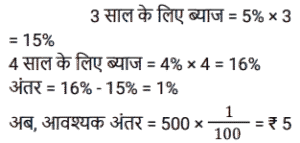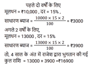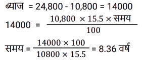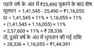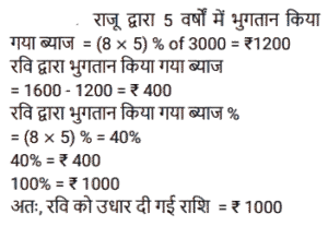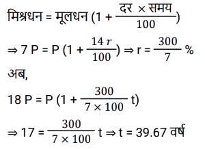साधारण ब्याज (SSC) (Part-II)Total Questions: 5011. सोहन ने 11% वार्षिक साधारण ब्याज की दर से ₹1,41,545 की राशि उधार ली। प्रथम वर्ष की समाप्ति पर, वह उधार ली गई मूल राशि की वापसी के लिए ₹25,490 चुकाता है। यदि सोहन दूसरे वर्ष की समाप्ति पर सभी लंबित बकाया राशि का भुगतान करता है, जिसमें प्रथम वर्ष के दौरान अर्जित ब्याज भुगतान भी शामिल है, तो वह दूसरे वर्ष की समाप्ति पर कितना भुगतान (₹ में) करेगा? [SSC CGL 11/09/2024 (3rd Shift)](a) 1,44,391(b) 1,36,453(c) 1,41,222(d) 1,37,407Correct Answer: (a) 1,44,391Solution:12. साधारण ब्याज की एक निश्चित दर पर निवेश करने पर एक निश्चित धनराशि 14 वर्षों में स्वयं की सात गुना हो जाती है। इसे उसी ब्याज दर पर स्वयं की 18 गुना होने में कितना समय (वर्षों में, 2 दशमलव स्थानों तक पूर्णांकित) लगेगा? [SSC CGL 12/09/2024 (1st Shift)](a) 27.33(b) 39.67(c) 42.78(d) 35.5Correct Answer: (b) 39.67Solution:13. एक बनिया पर एक व्यापारी का 1 वर्ष में ₹9,810 बकाया है, लेकिन बनिया 6 महीने के बाद हिसाब चुका देना चाहता है। यदि साधारण ब्याज दर 9% वार्षिक है, तो उसे कितना नकद (₹ में) भुगतान करना चाहिए? [SSC CGL 13/09/2024 (2nd Shift)](a) 9,550(b) 9,450(c) 9,540(d) 9,405Correct Answer: (d) 9,405Solution:14. राजेश द्वारा ₹10,000 की राशि 2 वर्षों के लिए 15% साधारण ब्याज की दर पर ऋण के रूप में ली जाती है। लेकिन राजेश इसे तय समय पर नहीं चुका सका और उसने दो और वर्ष का समय मांगा। इसलिए, ऋणदाता ने उस अवधि की ब्याज राशि को उसी ब्याज दर पर अगले दो वर्षों के लिए मूलधन के रूप में शामिल किया। 4 वर्ष के अंत में राजेश द्वारा भुगतान की गई कुल राशि ज्ञात करें। [SSC CGL 13/09/2024 (3rd Shift)](a) ₹18,590(b) ₹16,900(c) ₹17,650(d) ₹15,630Correct Answer: (b) ₹16,900Solution:15. एक निश्चित मूलधन 6 वर्षों के लिए साधारण ब्याज की एक निश्चित दर पर दिया जाता है। यदि इसे 7% अधिक दर पर दिया जाता, तो ₹1,512 अधिक प्राप्त होते। वह मूलधन (₹ में) ज्ञात कीजिए। [SSC CGL 18/09/2024 (1st Shift)](a) 3,200(b) 3,600(c) 3,100(d) 4,200Correct Answer: (b) 3,600Solution:16. साधारण ब्याज पर विभिन्न बैंकों में निवेश के लिए कुल ₹2,00,000 को दो भागों में बांटा गया। एक पर 4% वार्षिक ब्याज प्राप्त होता है। जबकि दूसरे पर 6% वार्षिक ब्याज प्राप्त होता है। यदि एक वर्ष के अंत में पूर्ण राशि पर कुल ब्याज 4.7% वार्षिक दर के बराबर है। तो, प्रत्येक बैंक में निवेश की गई राशि (₹ में) क्रमशः __________ है। [SSC CGL 18/09/2024 (2nd Shift)](a) 1,30,000 और 70,000(b) 1,45,000 और 55,000(c) 1,20,000 और 80,000(d) 1,60,000 और 40,000Correct Answer: (a) 1,30,000 और 70,000Solution:17. ₹1,456 की राशि, जब दस वर्षों के लिए निवेश की जाती है, तो यह परिपक्वता पर ₹2,366 हो जाती है। साधारण ब्याज की वार्षिक दर ज्ञात कीजिए जिसे निवेश की गई राशि पर भुगतान किया जाना था। [SSC CGL 19/09/2024 (2nd Shift)](a) 5.75%(b) 6.5%(c) 6.25%(d) 6.15%Correct Answer: (c) 6.25%Solution:18. ₹500 के मूलधन पर 3 वर्ष के लिए 5% वार्षिक ब्याज की दर से प्राप्त साधारण ब्याज और इसी मूलधन पर 4 वर्षों के लिए 4% वार्षिक ब्याज की दर से प्राप्त साधारण ब्याज के बीच कितना अंतर है? [SSC CGL 23/09/2024 (1st Shift)](a) ₹7.5(b) ₹5(c) ₹15(d) ₹10Correct Answer: (b) ₹5Solution:19. यदि ₹10,800 की राशि को 15.5% वार्षिक दर से साधारण ब्याज पर निवेश किया जाता है, त
