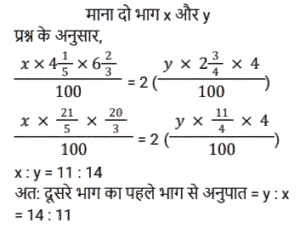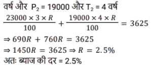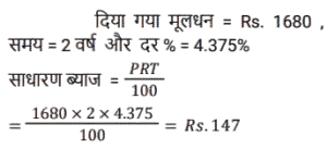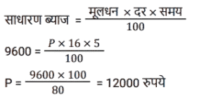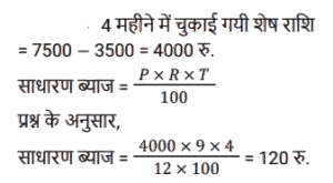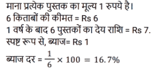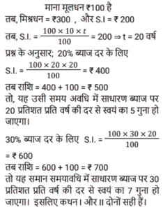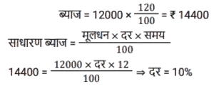 साधारण ब्याज (SSC)Total Questions: 5021. 12 वर्षों में एक व्यक्ति द्वारा Rs. 12000 के मूलधन पर प्राप्त साधारण ब्याज मूलधन का 120 प्रतिशत है। वार्षिक ब्याज दर क्या है? [SSC MTS 17/05/2023 (Afternoon)](a) 20%(b) 12%(c) 10%(d) 5%Correct Answer: (c) 10%Solution:22. एक धनराशि साधारण ब्याज पर 10 प्रतिशत वार्षिक दर से तीन गुना हो जाती है। निम्नलिखित में से कौन सा/से कथन सही है/हैं ? [SSC CHSL 21/03/2023 (1st Shift)]I. समान समयावधि में साधारण ब्याज पर 20 प्रतिशत वार्षिक दर से यह 5 गुना हो जाएगी। II. समान समयाबधि में साधारण ब्याज पर 30 प्रतिशत बार्षिक दर से यह 7 गुना हो जाएगी।(a) केवल ॥(b) न तो। और न ही ॥(c) केवल ।(d) । और ॥ दोनोंCorrect Answer: (d) । और ॥ दोनोंSolution:23. एक निश्चित राशि का 1/2, 20 प्रतिशत ब्याज दर पर उधार दिया जाता है। शेष राशि का 2/5, 25 प्रतिशत ब्याज दर पर उधार दिया जाता है। शेष राशि को 10 प्रतिशत ब्याज दर पर उधार दिया जाता है। यदि कुल राशि पर 2 वर्ष के लिए Rs. 360 साधारण ब्याज प्राप्त होता है, तो कुल राशि कितनी है ? [SSC CHSL 09/03/2023 (3rd Shift)](a) Rs.1200(b) Rs. 800(c) Rs.1000(d) Rs.1400Correct Answer: (c) Rs.1000Solution:24. एक व्यक्ति ने B को 3 वर्षों के लिए 23000 रुपये तथा C को 4 वर्षों के लिए 19000 रुपये ब्याज की समान दर से साधारण ब्याज पर उधार दिए तथा दोनों से कुल 3625 रुपये ब्याज के रूप में प्राप्त किए। ब्याज की वार्षिक दर क्या है? [SSC CHSL 09/03/2023 (3rd Shift)](a) 1.5%(b) 3%(c) 2.5%(d) 4%Correct Answer: (c) 2.5%Solution:25. सुमन ने 5 वर्ष पहले 16% की साधारण ब्याज दर पर लिए गए एक ऋण पर ब्याज के रूप में ₹9,600 का भुगतान किया। उसने कितना ऋण लिया था? [SSC CGL 03/12/2022 (2nd Shift)](a) ₹13,250(c) ₹12,000(c) ₹12,000(d) ₹11,750Correct Answer: (c) ₹12,000Solution:26. दामनी ने 7,500 की लागत वाली एक वस्तु खरीदी और उसी के लिए डाउन पेमेंट के रूप में ₹3,500 का भुगतान किया। यदि शेष राशि के लिए लिया गया साधारण ब्याज 9% प्रति वर्ष है और दामनी ने खरीद के 4 महीने बाद सभी बकाया राशि का भुगतान किया, तो दामनी ने 4 महीने के बाद ब्याज के रूप में कितना भुगतान किया? [SSC CGL 01/12/2022 (4th Shift)](a) ₹120(b) ₹100(c) ₹132(d) ₹125Correct Answer: (a) ₹120Solution:27. एक वर्ष के अंत में देय एक निश्चित राशि के लिए एक पुस्तक की 6 प्रतियां खरीदी जा सकती हैं और उसी पुस्तक की 7 प्रतियां उसी राशि के लिए नकद धन में खरीदी जा सकती हैं। साधारण ब्याज की वार्षिक दर क्या है (एक दशमलव स्थान तक सही)? [SSC MTS 02/11/2021 (Afternoon)](a) 10.9%(b) 15.5%(c) 16.7%(d) 30.4%Correct Answer: (c) 16.7%Solution:28. Rs.1,680 की राशि के लिए 4.375% वार्षिक साधारण ब्याज की दर पर दो वर्षों में अर्जित ब्याज ज्ञात कीजिये । [Graduate Level 03/08/2022 (Shift-3)](a) Rs.73.50(b) Rs.1,470(c) Rs.735(d) Rs.147Correct Answer: (d) Rs.147Solution:29. ₹5,000 की राशि को दो भागों में इस प्रकार विभाजित किया जाता है कि पहले भाग पर 4⅕ वर्षों के लिए 6⅔% प्रति वर्ष की दर से साधारण ब्याज दूसरे भाग पर 2¾ वर्षों के लिए 4% प्रति वर्ष की दर से साधारण ब्याज का दोगुना है। दूसरे भाग का पहले भाग से अनुपात है: [SSC CGL Tier II (03/02/2022)](a) 11:14(b) 11:13(c) 14:11(d) 13:11Correct Answer: (c) 14:11Solution:30. एक वर्ष के अंत में देय एक निश्चित राशि में एक पुस्तक की आठ प्रतियां खरीदी जा सकती हैं और समान धनराशि के नकद भुगता