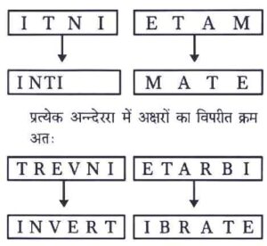 हरियाणा ऑक्शन रिकॉर्डर परीक्षा (15.05.2016)Total Questions: 10011. उस विकल्प का चयन कीजिए जो अन्य तीनों से भिन्न हो:(1) 36-63(2) 47-73(3) 58-85(4) 69-96Correct Answer: (2) 47-73Solution:संख्या-युग्म 47-73 में दोनों अभाज्य संख्याएँ हैं। अन्य सभी युग्मों में पहली संख्या के अंकों को विपरीत क्रम में लिखने पर दूसरी संख्या बनती है।12. दिए गए विकल्पों में से सही विकल्प चुनिए जो अनुक्रम को पूरा करे: ABKLUV, CDMNWX, GHORAB(1) EFOPXY(2) FEPQYZ(3) EFOPYZ(4) GHROUZCorrect Answer: (3) EFOPYZSolution:13. दिए गए विकल्पों में से सम्बन्धित शब्द को चुनिए। उपवास : भूख :: दौड़ : ?(1) चतुरता(2) ताकत(3) घोड़ा(4) थकावटCorrect Answer: (4) थकावटSolution:उपवास से भूख लगती है। उसी प्रकार, दौड़ से थकावट होती है।14. यदि किसी कूट भाषा में EXPANSION लिखा जाता है 248537693, तो उस कूट भाषा में PENSION किस प्रकार लिखा जायेगा ?(1) 8236793(2) 8237639(3) 8237693(4) 8233769Correct Answer: (3) 8237693Solution:15. अक्षरों का कौन सा समूह खाली स्थानों पर क्रमवार रखने से दी गई अक्षर श्रृंखला को पूरा करेगा ? a_yz_xy_ax_zax_z(1) xayzy(2) xayyz(3) xazyy(4) axzyyCorrect Answer: (3) xazyySolution:16. यदि 'cook' को 'butler' कहा जाता है, 'butter' को 'manager' कहा जाता है, 'manager' को 'teacher' कहा जाता है, 'teacher' को 'clerk' कहा जाता है और 'clerk' को 'principal' कहा जाता है, तो कक्षा में कौन पढ़ायेगा ?(1) Cook(2) Butler(3) Teacher(4) ClerkCorrect Answer: (4) ClerkSolution:कक्षा में Teacher पढ़ाता है। परंतु यहाँ Teacher को Clerk कहा गया है।17. एक व्यक्ति किसी फोटोग्राफ की ओर इशारा करते हुए कहता है, "फोटोग्राफ में वह महिला मेरे भानजे की नानी है।" फोटोग्राफ में वह महिला उस व्यक्ति की बहन से किस प्रकार सम्बन्धित है, जिसकी कोई दूसरी बहन नहीं है ?(1) कजीन(2) भाभी(3) माता(4) सासCorrect Answer: (3) माताSolution:भानजे की नानी उस व्यक्ति की बहन की माता हुई।18. B उम्र में A से दो गुना बड़ा है परन्तु F से दो गुना छोटा है। C, A की आयु का आधा है परन्तु D की आयु का दो गुना है। कौन से दो व्यक्ति सबसे बड़े और सबसे छोटे का युग्म बनाते हैं ?(1) F और A(2) F और D(3) B और F(4) F और CCorrect Answer: (2) F और DSolution:माना C की आयु=x वर्षA की आयु = 2x वर्षB की आयु = 4x वर्षF की आयु = 8x वर्षD की आयु = वर्षF सबसे बड़ा है तथा D सबसे छोटा है।19. विकल्पों में से ऐसे शब्द का चयन करें जो नीचे दिए गए शब्द के अक्षरों से बनाया जा सकता है:CONSTANTINOPLE(1) CONTINUE(2) CONSCIENCE(3) CONSTANCE(4) CONTENTCorrect Answer: (4) CONTENTSolution:दिए गए शब्द में 'U' वर्ण नहीं है। अतः शब्द CONTINUE नहीं बनाया जा सकता।दिए गए शब्द में 'C' वर्ण नहीं है। अतः, शब्द CONSCIENCE तथा CONSTANCE नहीं बनाए जा सकते।20. किसी विशेष भाषा में, ITNIETAM एक कूट है INTIMATE के लिए। बताइए किस शब्द के लिए TREVNIETARBI कूट है ?(1) INVRETIBRATE(2) INVERTIBARTE(3) INVERTIBRETA(4) INVERTIBRATECorrect Answer: (4) INVERTIBRATESolution:Submit Quiz« Previous12345678910Next »