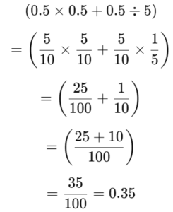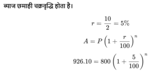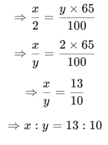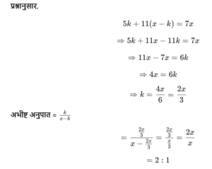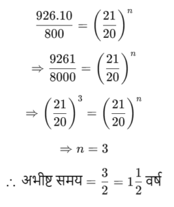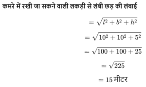 हरियाणा CET परीक्षा, ग्रुप – D (21.10.2023) द्वितीय पालीTotal Questions: 10041. (0.5 × 0.5 + 0.5 ÷ 5) बराबर है:(1) 0.35(2) 0.45(3) 0.15(4) 0.25(5) उत्तर नहीं देना चाहतेCorrect Answer: (1) 0.35Solution:42. तीन संख्याओं 2 p, 5 p तथा 7 p का ल.स. है:(1) 75 p(2) 70p³(3) 70 p(4) 65 p(5) उत्तर नहीं देना चाहतेCorrect Answer: (3) 70 pSolution:2P, 5P तथा 7P का ल.स.= 2P × 5 × 7= 70P43. किसी राशि पर 3¾% वार्षिक दर से 2⅓ वर्षों का साधारण ब्याज 210 रुपये है?(1) 2,800 रुपये(2) 2,500 रुपये(3) 1,580 रुपये(4) 2,400 रुपये(5) उत्तर नहीं देना चाहतेCorrect Answer: (4) 2,400 रुपयेSolution:P= (ब्याज × 100) / (दर × समय)= (210 × 100)/(15/4 × 7/3)== (210 × 100 × 12)/(15 × 7)= 2400 रूपये44. यदि a तथा b दो भिन्न पूर्णांक हैं, तो निम्न में से कौन-सा गलत है?(1) a + 0 = 0 + a = a(2) a - 0 = a ≠ 0 - a(3) a + b = b + a(4) a - b = b - a(5) उत्तर नहीं देना चाहतेCorrect Answer: (4) a - b = b - aSolution:यदि a तथा b दो भिन्न पूर्णांक हैं।a - b = b - a गलत कथन है।45. एक संख्या को दो भागों में इस प्रकार विभाजित किया गया कि पहले भाग के 5 गुना को दूसरे भाग के 11 गुना में जोड़ने पर संख्या का 7 गुना प्राप्त हुआ। पहले भाग का दूसरे भाग से अनुपात है:(1) 1 : 2(2) 2 : 3(3) 2 : 1(4) 5 : 11(5) उत्तर नहीं देना चाहतेCorrect Answer: (3) 2 : 1Solution:माना संख्या x है।पहला भाग = kदूसरा भाग = x − k46. किसी संख्या का आधा दूसरी संख्या के 65% के बराबर है। पहली संख्या का दूसरी संख्या से अनुपात हैः(1) 13 : 8(2) 13 : 10(3) 10 : 13(4) 8 : 13(5) उत्तर नहीं देना चाहतेCorrect Answer: (2) 13 : 10Solution:माना पहली संख्या = xदूसरी संख्या = yप्रश्नानुसार,x/2 = y का 65 %47. 10 मी. × 10 मी. × 5 मी. विमाओं वाले कमरे में रखी जा सकने वाली लम्बी से लम्बी छड़ की लंबाई है:(1) 10√2 मी.(2) 5√3 मी.(3) 15√3 मी.(4) 15 मी.(5) उत्तर नहीं देना चाहतेCorrect Answer: (4) 15 मी.Solution:48. कितने वर्षों में, 800 रुपये की राशि 10% वार्षिक चक्रवृद्धि ब्याज की दर से, 926.10 रुपये हो जाएगी जबकि ब्याज प्रति छमाही संयोजित होता है?(1)(2)(3)(4)(5) उत्तर नहीं देना चाहतेCorrect Answer: (4)Solution:49. 20 लीटर दूध तथा पानी के मिश्रण में दूध तथा पानी का अनुपात 3 : 1 है। इस मिश्रण में कितना दूध और डाला जाए कि यह अनुपात 4 : 1 हो जाए?(1) 5 लीटर(2) 6 लीटर(3) 7 लीटर(4) 4 लीटर(5) उत्तर नहीं देना चाहतेCorrect Answer: (1) 5 लीटरSolution:दूध की मात्रा = 3/4 × 20= 15 लीटरपानी की मात्रा = 1/4 × 20 = 5 लीटरप्रश्नानुसार,(15 + x)/5 = 4/1⇒ 15 + x = 20⇒ x = 20 - 15 = 5∴ मिलाये गये दूध की मात्रा = 5 लीटर50. (0.2 × 0.2 + 0.01)/(0.1 × 0.1 + 0.02) को सरल करने पर, प्राप्त होगा:(1) 41/4(2) 9/5(3) 5/3(4) 41/12(5) उत्तर नहीं देना चाहतेCorrect Answer: (3) 5/3Solution:(0.2 × 0.2 + 0.01) / (0.1 × 0.1 + 0.02)= [2/10 × 2/10 + 1/100] / [1/10 × 1/10 + 2/100]= [2/10 × 2/10 + 1/100] / [1/100 + 2/100]= (5/100) / (3/100)= 5 / 3Submit Quiz« Previous12345678910Next »