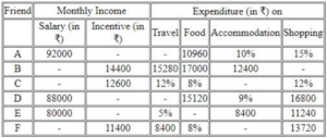 1. The following table shows the monthly income and various expenditures, of six friends A-F in absolute value or in percentage (in terms of monthly income) form. Some values (marked as '-') are missing in the table which you are expected to calculate if required. Based on the data in the table, answer the question: Income and Expenditure Details