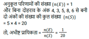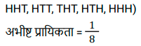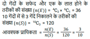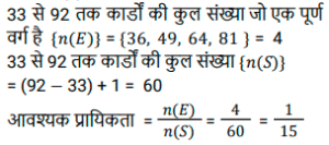 प्रायिकताTotal Questions: 6411. एक आदमी को 8 में से 5 बार सच बोलने के लिए जाना जाता है। वह एक पासा फेंकता है और रिपोर्ट करता है कि यह एक चार है। इसकी प्रायिकता ज्ञात कीजिए कि यह वास्तव में चार है?(a) 1/6(b) 3/4(c) 1/4(d) 5/48Correct Answer: (c) 1/4Solution:12. यदि एक घटना A के पक्ष में ऑड्स 3 : 4 हैं और एक अन्य स्वतंत्र घटना B के विपक्ष में ऑड्स 7 : 4 हैं, तो प्रायिकता ज्ञात कीजिए कि कम से कम एक ईवेंट घटित होगा।(a) 7/18(b) 7/11(c) 5/8(d) 8/19Correct Answer: (b) 7/11Solution:13. यदि 3 सफ़ेद और 1 काली, 2 सफ़ेद और 2 काली, 1 सफ़ेद और 3 काली गेंदों वाले तीन बक्सों में से प्रत्येक में से एक गेंद यादृच्छिक रूप से निकाली जाती है, तो 2 सफ़ेद और 1 काली गेंद निकाले जाने की प्रायिकता है(a) 13/32(b) 1/4(c) 1/32(d) 3/16Correct Answer: (a) 13/32Solution:14. एक थैले में 4 बैंगनी, 1 सफेद और 2 नीली गेंदें हैं। दो गेंदों को यादृच्छिक रूप से निकाला जाता है। तो निकाले गई किसी भी गेंद के नीली न होने की क्या प्रायिकता है?(a) 1/2(b) 10/21(c) 3/5(d) 9/8Correct Answer: (b) 10/21Solution:15. जब 3 सिक्कों को एक साथ उछाला जाने पर तीनों परीक्षणों में चित आने की प्रायिकता क्या होगी?(a) 1/4(b) 1/5(c) 1/3(d) 1/8Correct Answer: (d) 1/8Solution:16. एक थैले में 3 लाल और 7 काली गेंदें हैं। दो गेंदों को बिना प्रतिस्थापन के यादृच्छिक रूप से निकाला जाता है। यदि पहली गेंद लाल है, तो दूसरी गेंद के भी लाल होने की क्या प्रायिकता है?(a) 1/10(b) 1/15(c) 3/10(d) 2/21Correct Answer: (b) 1/15Solution:17. एक जार में 3 लाल कंचे, 7 हरे कंचे और 10 सफेद कंचे हैं। यदि जार से 2 कंचे यादृच्छिक रूप से निकाले जाते हैं, तो निकाले गए कंचो के सफेद होने की क्या प्रायिकता है?(a) 9/38(b) 3/40(c) 7/10(d) 1/2Correct Answer: (a) 9/38Solution:18. यदि अंकों की पुनरावृत्ति के बिना 4, 3, 5, 8, 6 अंकों से दो अंकों की संख्या बनाई जाती है, तो बनने वाली संख्या के 46 होने की क्या प्रायिकता है?(a) 1/10(b) 1/20(c) 1/6(d) 1/2Correct Answer: (b) 1/20Solution:19. एक बैग में 33 से 92 तक क्रमांकित कार्ड हैं। यदि एक थैले में से एक कार्ड निकाला जाता है। क्या प्रायिकता है कि निकाले गए कार्ड पर संख्या एक पूर्ण वर्ग है:(a) 1/15(b) 1/17(c) 4/35(d) 8/37Correct Answer: (a) 1/15Solution:20. एक थैले में 4 सफेद और 6 लाल गेंदें हैं। तीन गेंदों को यादृच्छिक रूप से निकाला जाता है। दो गेंदों के सफेद और 1 के लाल होने की क्या प्रायिकता है?(b) 3/10(a) 8/17(c) 9/13(d) 9/17Correct Answer: (b) 3/10Solution:Submit Quiz« Previous1234567Next »