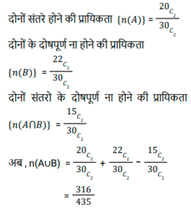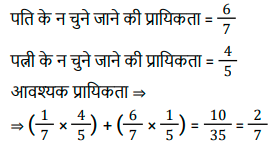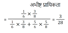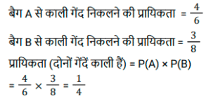 प्रायिकताTotal Questions: 6431. दो पासों को फेंकने पर योग 7 आने की प्रायिकता क्या है?(a) 1/4(b) 1/5(c) 2/5(d) 1/6Correct Answer: (d) 1/6Solution:32. थैला A में 2 सफेद और 4 काली गेंदें हैं। बैग B में 5 सफेद और 3 काली गेंदें हैं। प्रत्येक थैले से एक गेंद निकाली जाती है, दोनों के काले होने की प्रायिकता ज्ञात कीजिए।(c) 1/4(a) 1/5(b) 11/13(d) 11/52Correct Answer: (c) 1/4Solution:33. तीन छात्रों को एक समस्या दी जाती है जिसके हल करने की संभावना क्रमशः 1/2, 1/3 और 1/4 है। क्या संभावना है कि समस्या हल हो जाएगी?(a) 3/4(b) 1/4(c) 1/12(d) 1/24Correct Answer: (a) 3/4Solution:34. मैं 7 - अंकीय टेलीफोन नंबर का अंतिम अंक भूल गया। यदि एक व्यक्ति पहले चार को सही ढंग से डायल करने के बाद अंतिम 3 अंकों को यादृच्छिक रूप से डायल करता है, तो सही संख्या डायल करने की प्रायिकता क्या है?(a) 1/999(b) 1/1001(c) 1/1000(d) 4/1003Correct Answer: (c) 1/1000Solution:35. दो पासे उछाले जाते हैं। कुल स्कोर के अभाज्य संख्या होने की कितनी सम्भावना है ?(b) 5/12(a) 7/12(c) 5/14(d) 7/15Correct Answer: (b) 5/12Solution:36. 1 से 20 तक के टिकटों को मिलाया जाता है और फिर एक टिकट यादृच्छिक रूप से निकाला जाता है। प्रायिकता ज्ञात कीजिए यदि निकाले गए टिकट में एक संख्या है जो 4 या 5 का गुणज है?(a) 8/20(b) 7/20(c) 11/20(d) 3/20Correct Answer: (a) 8/20Solution:37. एक आदमी और उसकी पत्नी एक ही पद पर दो रिक्तियों के लिए साक्षात्कार में शामिल होते हैं। पति के चयन की प्रायिकता (1/7) तथा पत्नी के चयन की प्रायिकता (1/5) है। उनमें से केवल एक के चुने जाने की प्रायिकता क्या है ?(a) 6/13(b) 2/7(c) 1/7(d) 3/7Correct Answer: (b) 2/7Solution:38. एक टोकरी में 10 सेब और 20 संतरे हैं जिनमें से 3 सेब और 5 संतरे खराब हैं। यदि हम दो फलों को यादृच्छिक रूप से चुनते हैं, तो इसकी क्या प्रायिकता है कि या तो दोनों संतरे हैं या दोनों दोषपूर्ण नहीं हैं?(a) 316/435(b) 361/435(c) 391/435(d) 319/435Correct Answer: (a) 316/435Solution:39. एक बैग में 33 और 92 के बीच संख्या वाले कार्ड हैं। यदि बैग से एक कार्ड निकाला जाता है, तो निकाले गए कार्ड पर संख्या पांच का गुणक होने की प्रायिकता है। :(a) 5/59(b) 4/59(c) 6/29(d) 1/12Correct Answer: (c) 6/29Solution:40. एक आदमी को 8 में से 3 बार सच बोलने के लिए जाना जाता है। वह एक पासा फेंकता है और रिपोर्ट करता है कि यह एक चार है। इसकी प्रायिकता ज्ञात कीजिए कि यह वास्तव में चार है?(a) 1/6(b) 3/4(c) 1/4(d) 3/28Correct Answer: (d) 3/28Solution:Submit Quiz« Previous1234567Next »