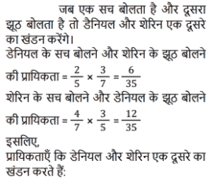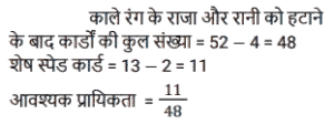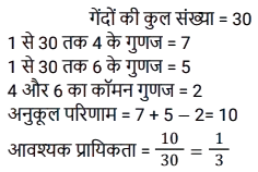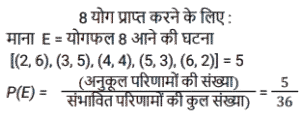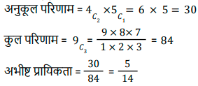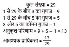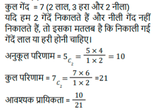 प्रायिकताTotal Questions: 6451. एक बैग में 2 लाल, 3 हरी और 2 नीली गेंदें हैं। यादृच्छिक रूप से दो गेंदें निकाली जाती हैं। इसकी क्या प्रायिकता है कि निकाली गई गेंदों में से कोई भी नीली न हो?(a) 10/21(b) 6/21(c) 10/14(d) 5/7Correct Answer: (a) 10/21Solution:52. एक वृत्त पर 10 बिंदु स्थित हैं। बिन्दुओं को मिलाने पर, इन बिन्दुओं से कितने त्रिभुज बनाये जा सकते हैं?(a) 61(b) 119(c) 120(d) 60Correct Answer: (c) 120Solution:53. यदि हम 4 पुरुषों, 3 महिलाओं और 2 लड़कों वाले एक समूह में से यादृच्छिक रूप से 3 व्यक्तियों का चयन करते हैं, तो 2 पुरुषों के चुने जाने की प्रायिकता है:(a) 5/14(b) 7/12(c) 3/14(d) 5/28Correct Answer: (a) 5/14Solution:54. एक कलश में 10 काली और 5 सफेद गेंदें हैं। दो गेंदों को एक के बाद एक बिना प्रतिस्थापन के कलश से निकाला जाता है। इसकी क्या प्रायिकता है कि निकाली गई दोनों गेंदें काली हों?(a) 2/7(b) 3/7(c) 4/7(d) 5/7Correct Answer: (b) 3/7Solution:55. दो पासे एक साथ फेंके जाते हैं। 8 का योग प्राप्त करने की प्रायिकता ज्ञात कीजिए(a) 1/9(b) 5/36(c) 7/36(d) 1/4Correct Answer: (b) 5/36Solution:56. एक बॉक्स में 2 काली, 6 हरी और 4 पीली गेंदें हैं। यदि 2 गेंदों को यादृच्छिक रूप से उठाया जाता है, दोनों के पीले होने की प्रायिकता है:(a) 1/22(b) 1/6(c) 3/11(d) 1/11Correct Answer: (d) 1/11Solution:57. काले रंग के राजा और रानी को ताश के 52 पत्तों की एक गड्डी से निकाला जाता है। बचे हुए कार्डों को अच्छी तरह से फेटकर एक कार्ड निकाला जाता है। स्पैड कार्ड प्राप्त करने की प्रायिकता क्या है?(c) 11/48(a) 1/4(b) 11/13(d) 11/52Correct Answer: (c) 11/48Solution:58. एक बैग में 1, 2, 3, ............ 30 की संख्या वाली गेंदें हैं।. बैग में से एक गेंद यादृच्छया निकाली जाती है। क्या प्रायिकता है कि निकाली गई गेंद पर संख्या 4 या 6 से विभाज्य है?(a) 1/15(b) 1/3(c) 3/10(d) 2/5Correct Answer: (b) 1/3Solution:59. एक बैग में 1, 2, 3, ..........29 की संख्या वाली गेंदें हैं। बैग से यादृच्छया एक गेंद निकाली जाती है। क्या प्रायिकता है कि निकाली गई गेंद पर संख्या 3 या 5 से विभाज्य है?(a) 2/5(b) 1/2(c) 13/29(d) 1/10Correct Answer: (c) 13/29Solution:60. डेनियल 2/5 मामलों में सच बोलता है और शेरिन 3/7 मामलों में झूठ बोलता है। उन मामलों का प्रतिशत क्या है जिनमें डेनियल और शेरिन दोनों एक तथ्य बताते हुए एक दूसरे का खंडन करते हैं?(a) 72.6%(b) 51.4%(c) 62.3%(d) 47.5%Correct Answer: (b) 51.4%Solution:Submit Quiz« Previous1234567Next »