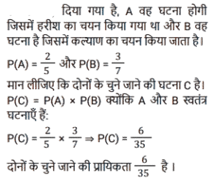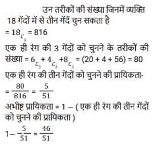 प्रायिकताTotal Questions: 6461. एक बैग में कुल 18 गेंदें होती हैं। उनमें से 6 लाल रंग के हैं, 4 हरे रंग के हैं और 8 नीले रंग के हैं। यदि विशाल बैग से यादृच्छिक रूप से तीन गेंदें उठाता है, तो इसकी क्या प्रायिकता होगी कि तीनों गेंदें एक ही रंग की न हों?(a) 95/102(b) 19/23(c) 21/26(d) 46/51Correct Answer: (d) 46/51Solution:62. 2 पासे एक साथ फेंके जाते हैं तो फलकों पर संख्याओं का योग 3 या 5 से विभाज्य हो कि क्या प्रायिकता है।(a) 7/36(b) 19/36(c) 9/36(d) 2/7Correct Answer: (b) 19/36Solution:63. 52 ताश के पत्तों के एक अच्छी तरह से फेंटे गए पैक से एक कार्ड निकाला जाता है। कीन या क्लब कार्ड मिलने की प्रायिकता क्या है ?(a) 17/52(b) 15/52(c) 4/13(d) 3/13Correct Answer: (c) 4/13Solution:64. दो दोस्त हरीश और कल्याण एक परीक्षा के लिए उपस्थित हुए। मान लीजिए कि हरीश के चुने जाने की घटना A है और कल्याण के चुने जाने की घटना B है। A की प्रायिकता 2/5 है और B की प्रायिकता 3/7 है। दोनों के चुने जाने की प्रायिकता ज्ञात कीजिए।(a) 35/36(b) 5/35(c) 5/12(d) 6/35Correct Answer: (d) 6/35Solution:Submit Quiz« Previous1234567